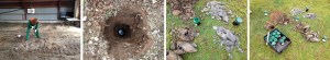 10 juli, bodemonderzoek. Er worden op 7 plaatsen in en om de schuur gaten geboord van 2 meter. Elke 50 cm wordt een bodemsample genomen en in een genummerd potje gedaan. Op sommige plekken is de samenstelling van de grond zo verschillen (van zand tot puin, tot klei) dat meerdere samples nodig zijn. Over twee weken krijgen we uitslag over de mate van vervuiling en wat de consequenties daarvan zijn.