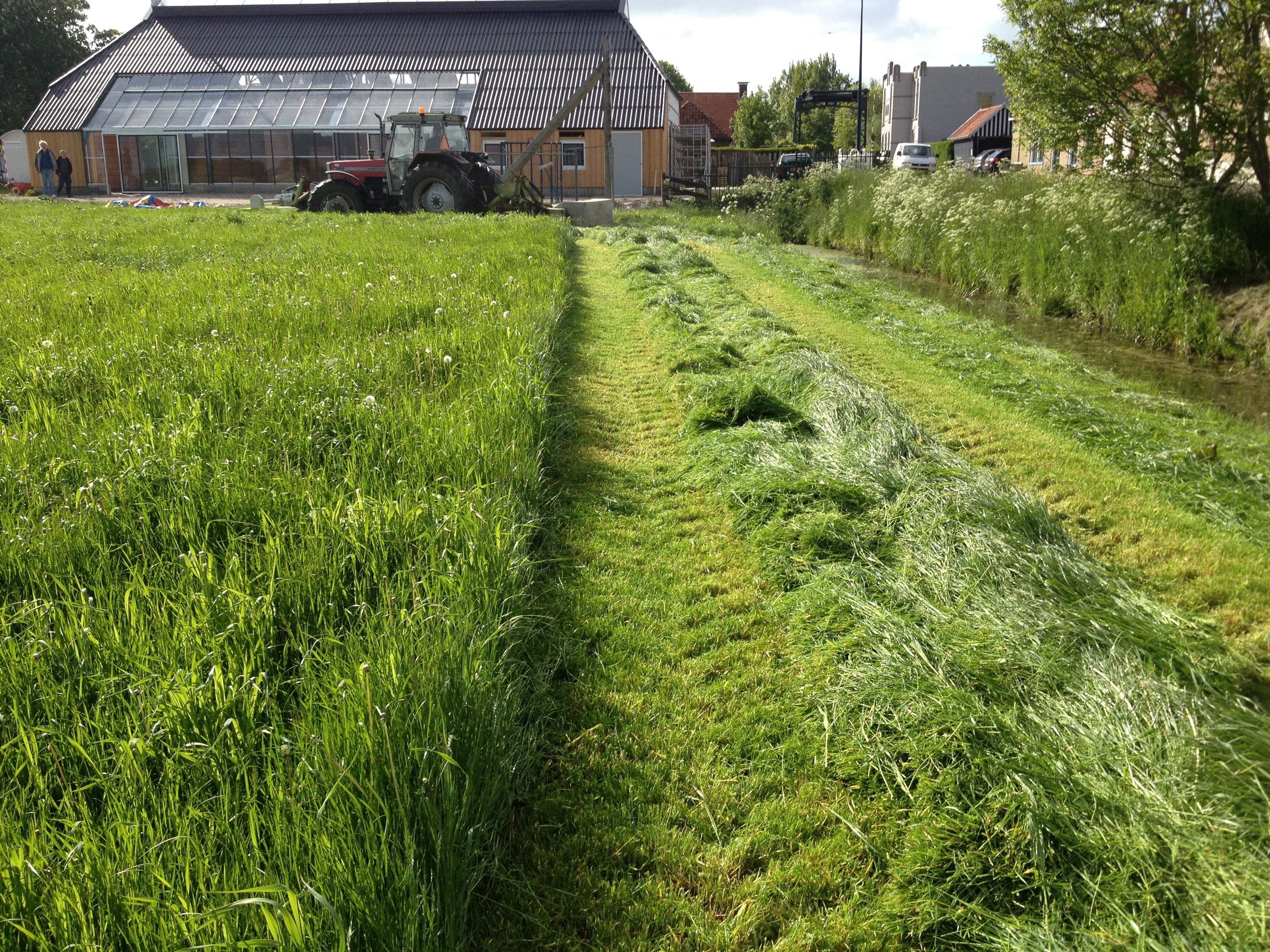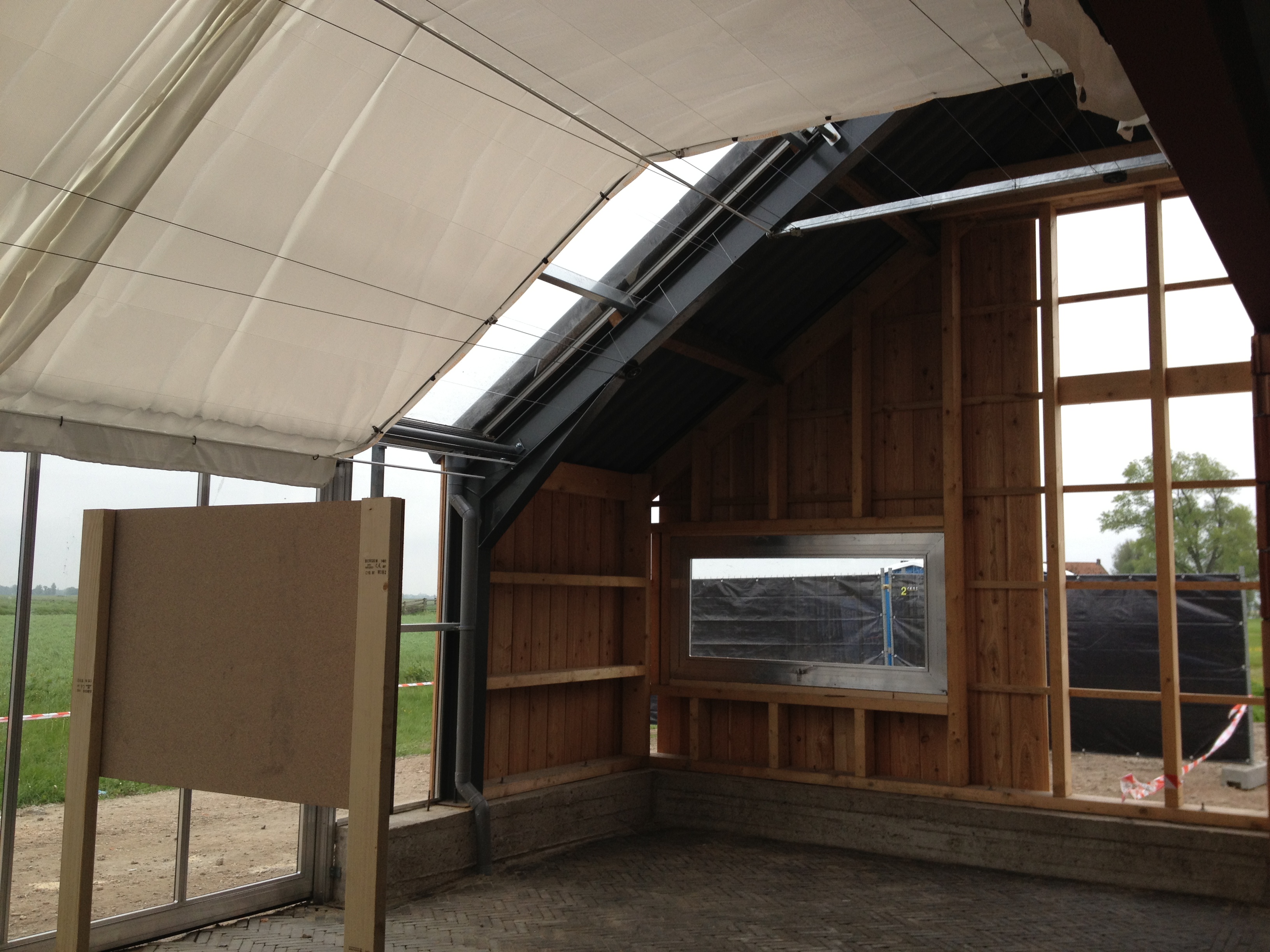 Zaterdag 1 juni, Dag van de bouw. Iedereen had de afgelopen week nog een tandje erbij gezet om nog zo veel mogelijk klaar te hebben voor die dag. Vrijdag werd de glaspui er nog ingezet, Bootsma ruimde alles op, zette er wat tafels in, hing foto’s en tekeningen op en maakte er een gezellige boel van. Er stond zelfs een opblaaskasteel voor de kinderen in het weiland.