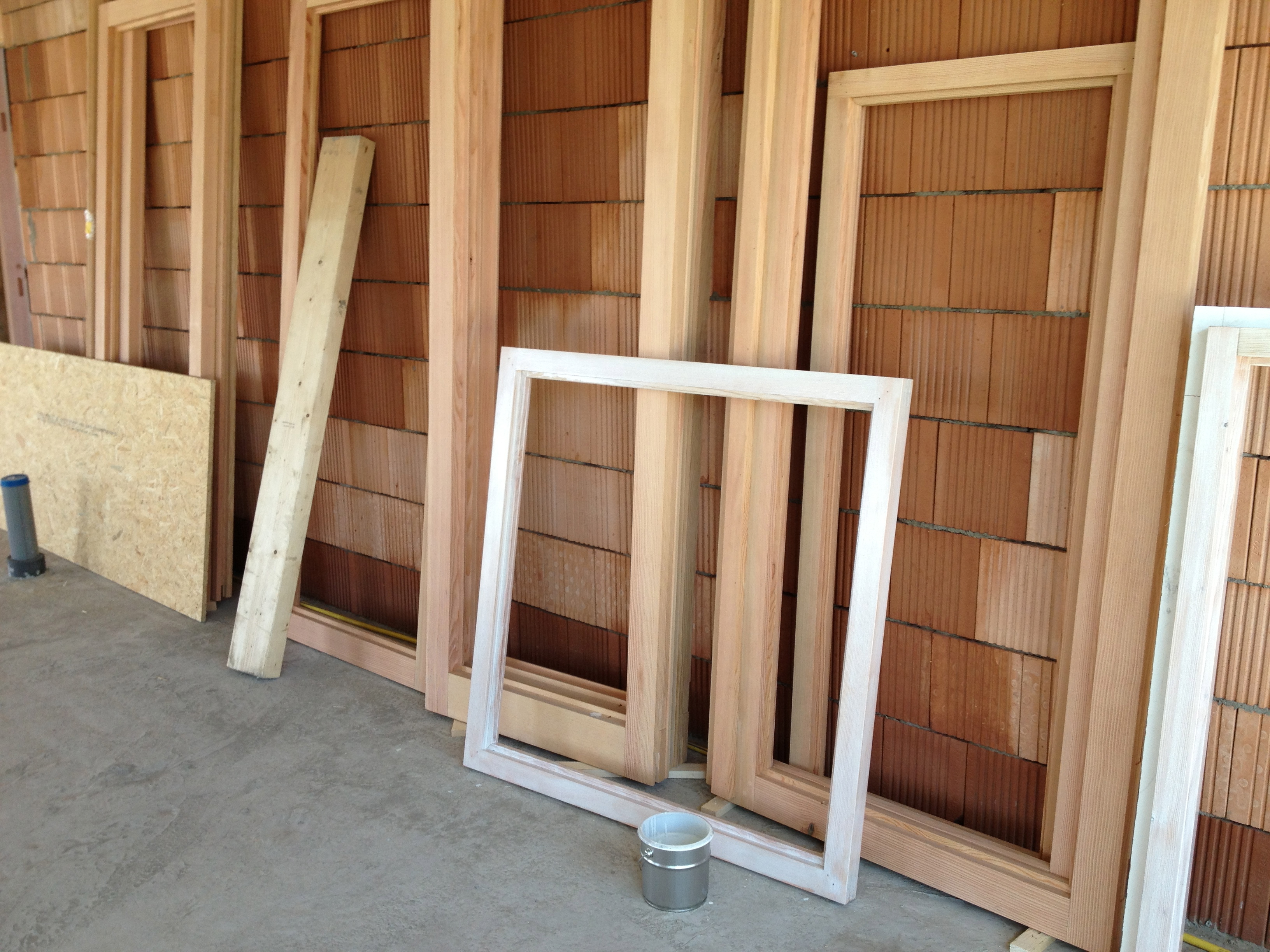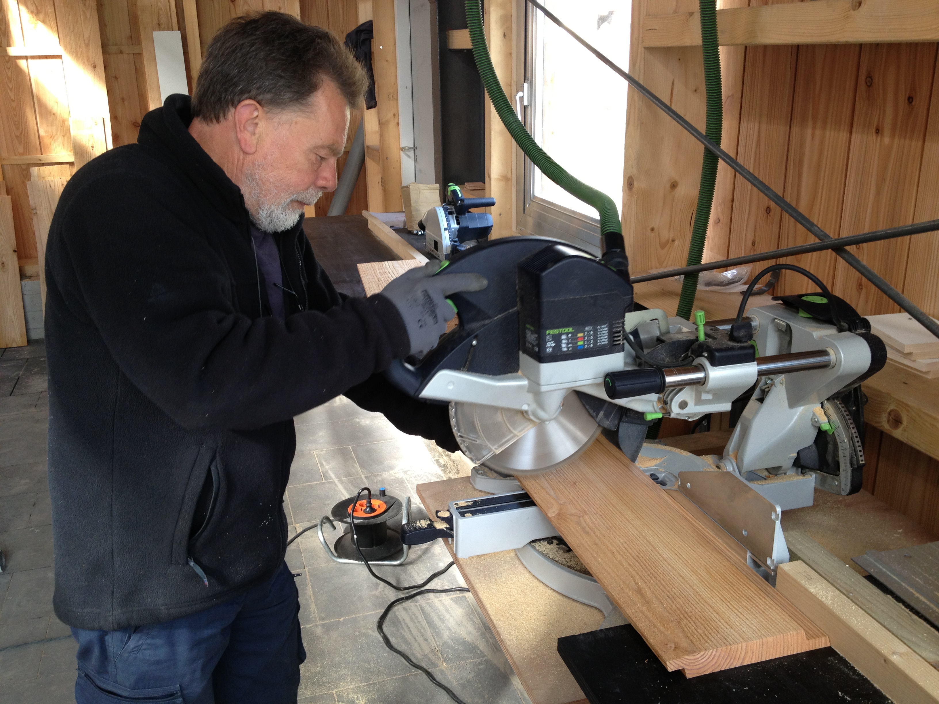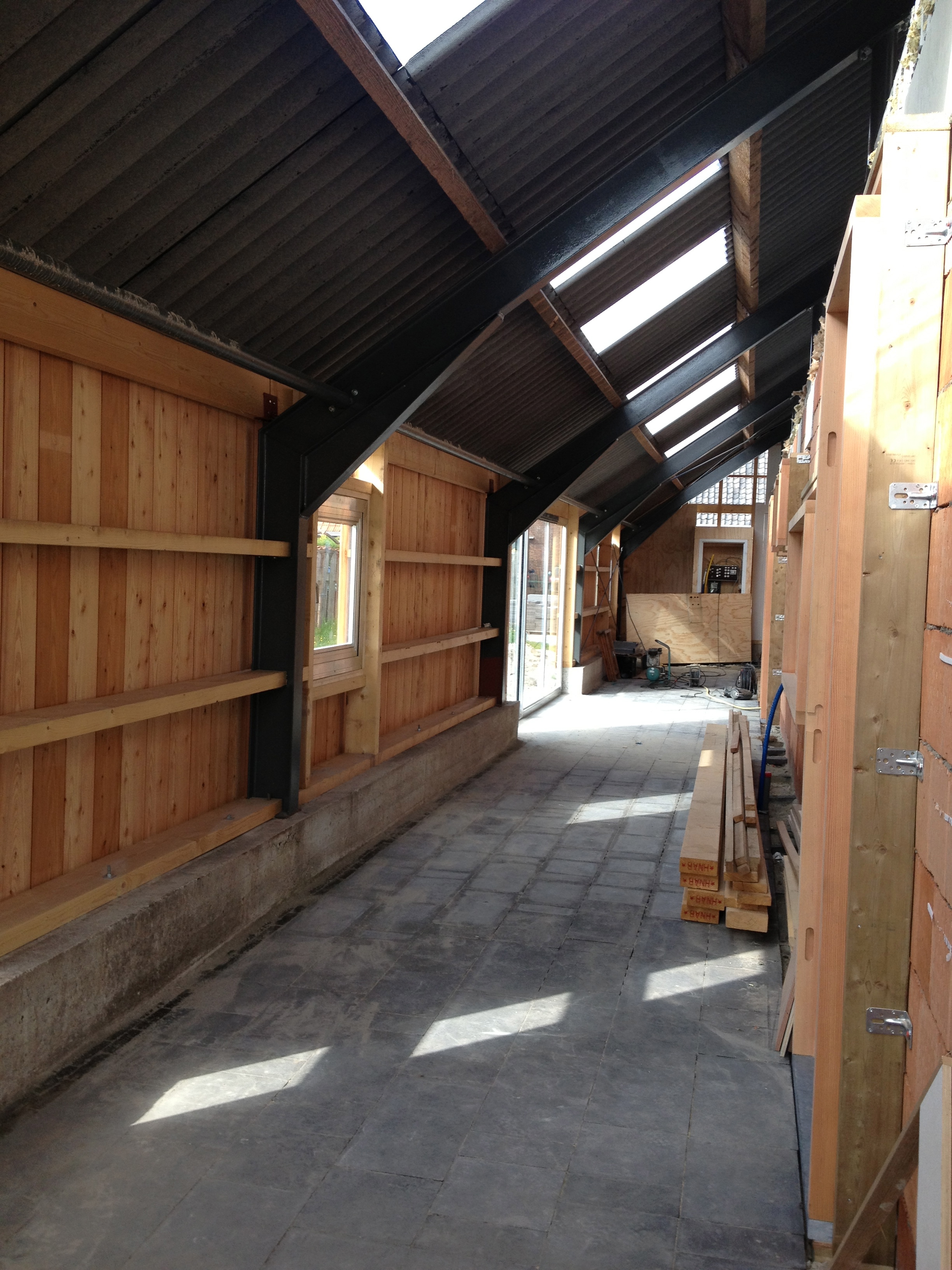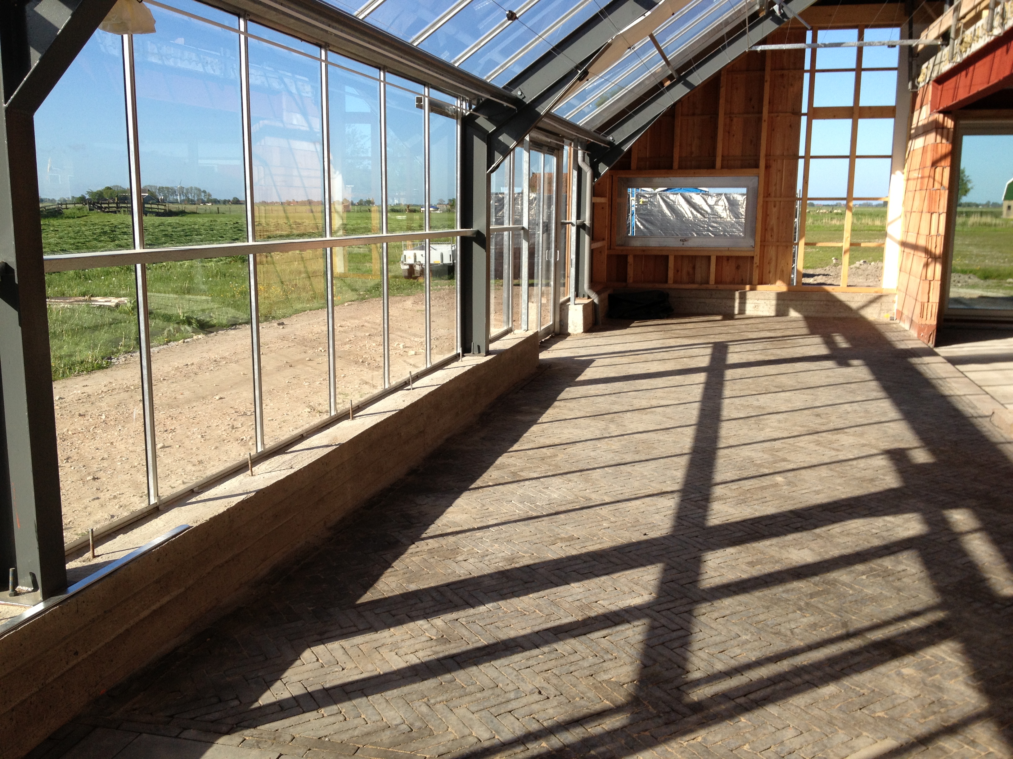 De volgende dag was het eindelijk mooi weer, en konden we ervaren hoe snel de zon de schuur kon opwarmen. Marcus en Jan stortten zich weer op de pui en ik kon een begin maken met het in de olie zetten van alle kozijnen.