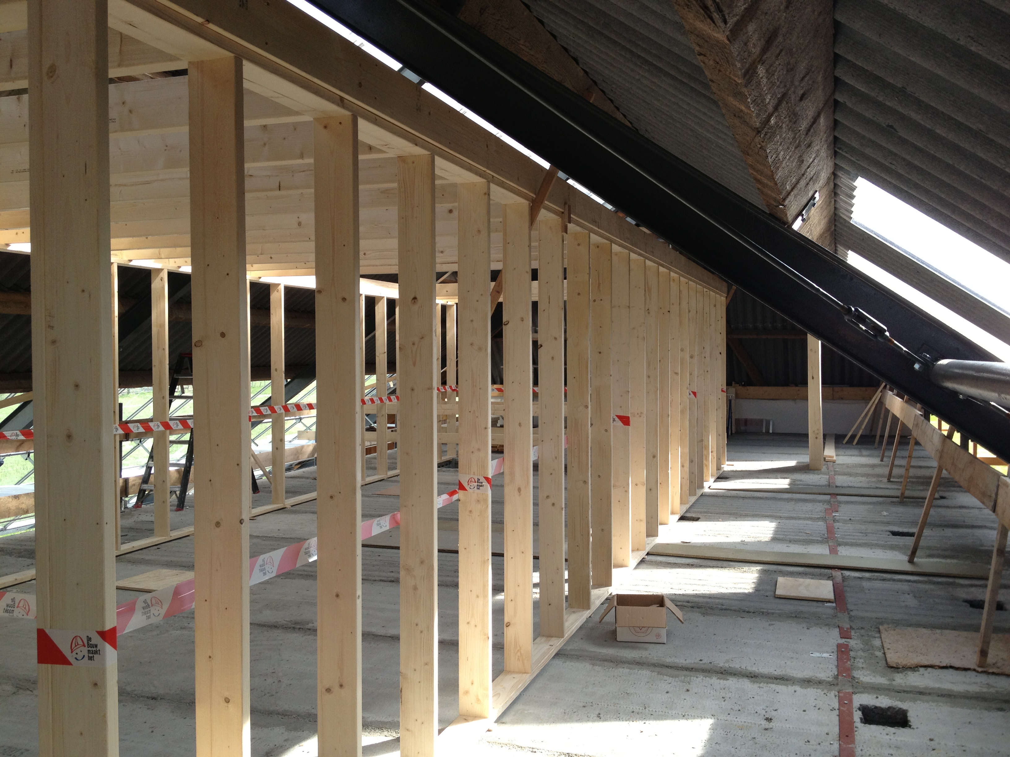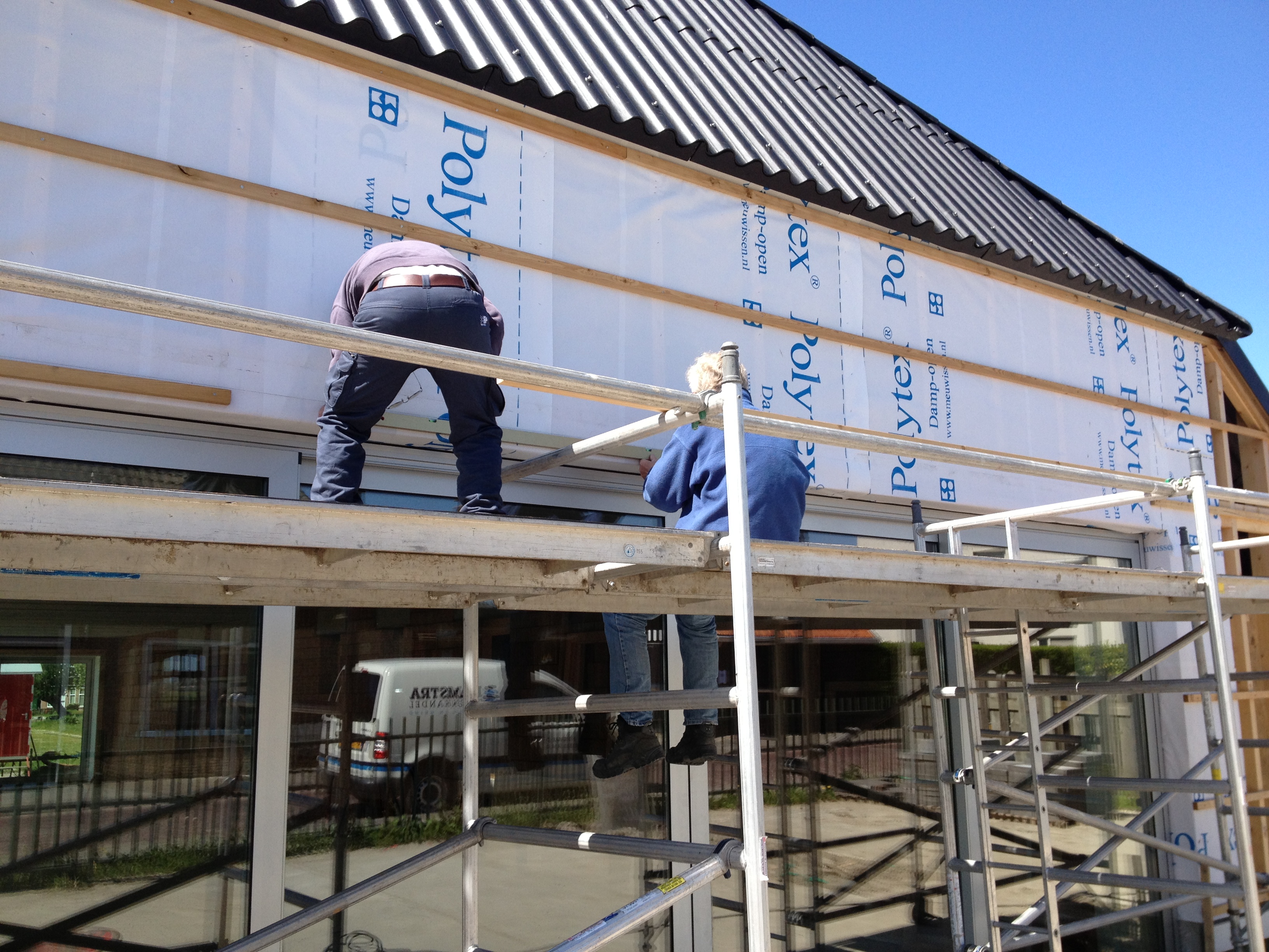 We waren diep onder de indruk van alle vorderingen. De kozijnen waren klaar, de kas zat erin inclusief zonwering, en zelfs de houtconstruktie voor de logeerkamer stond er al en was bereikbaar door een heuse (nood)trap met leuningen. Er kwam een gestage stroom mensen langs (110) en het was een geanimeerde sfeer. Om 4 uur was het afgelopen en nog geen half uur later stonden Jan en Marcus weer in de startblokken om verder te gaan met de betimmering.