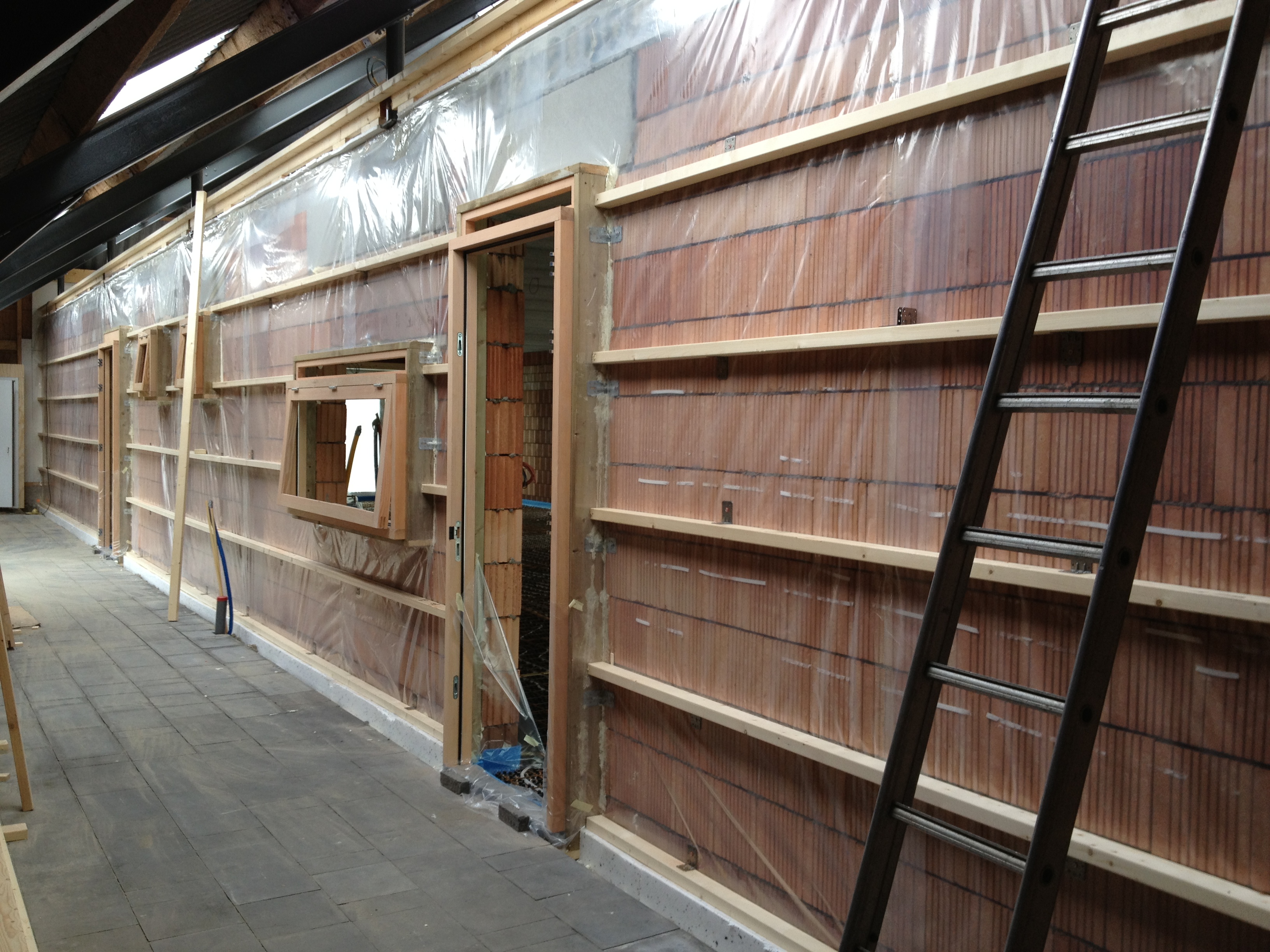 De vloerverwarming ligt er helemaal in, evenals de elektra, Ziggo, enzofoorts. Als je op het dak van het woonvolume kijkt ligt er een woud van leidingen en afzuigbuizen. Ook dat moet straks helemaal door ons geisoleerd worden.