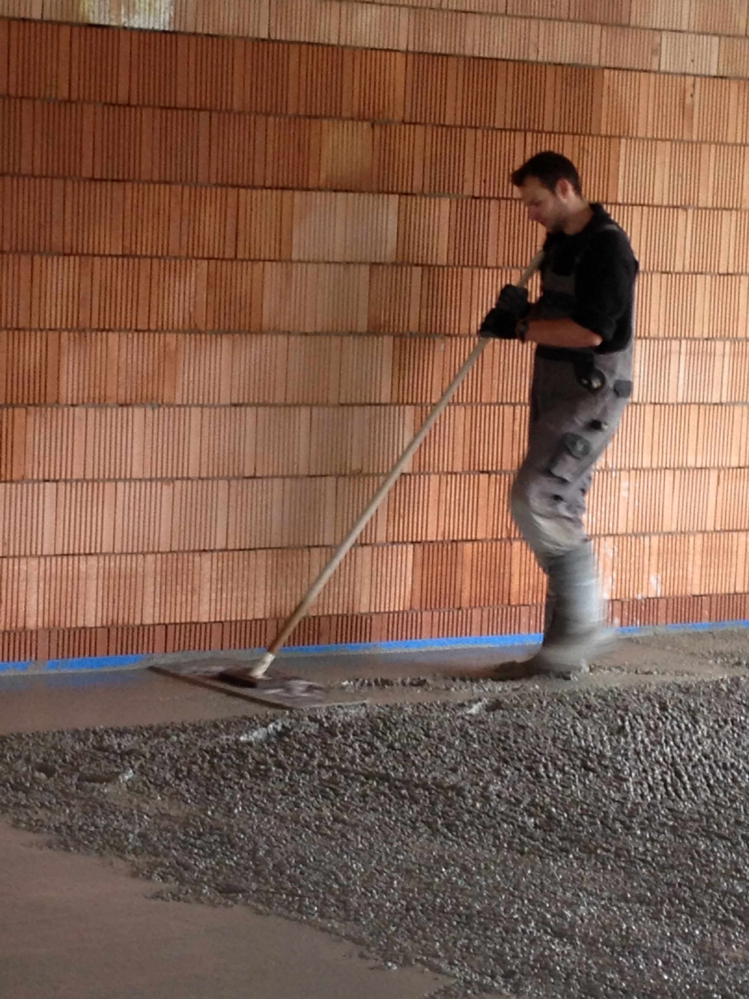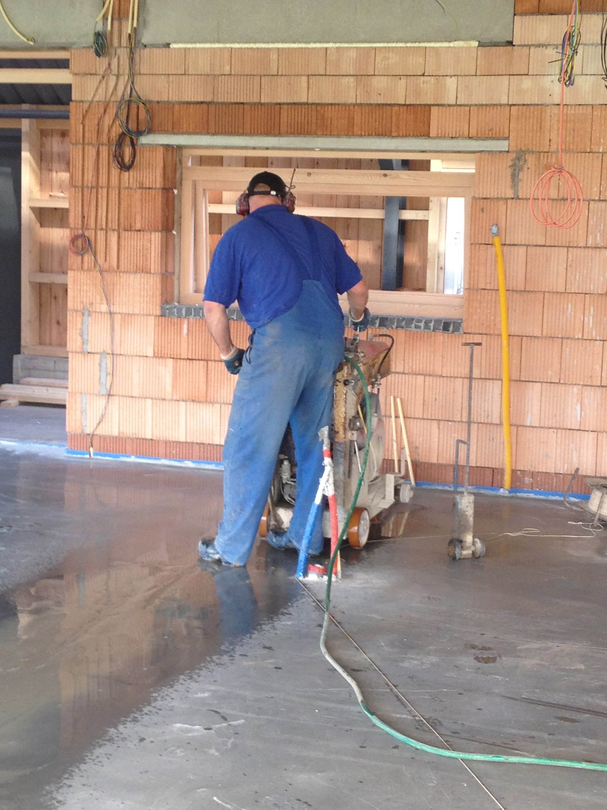 Daarna moeten er ‘dilitaties’ in aangebracht worden, wat betekent dat er iemand met een grote cirkelzaag onze tadeloze betonvloer bewerkte. Not my finest moment… een zaagsnede van 2 mm om ervoor te zorgen dat het beton op den duur niet gaat barsten.