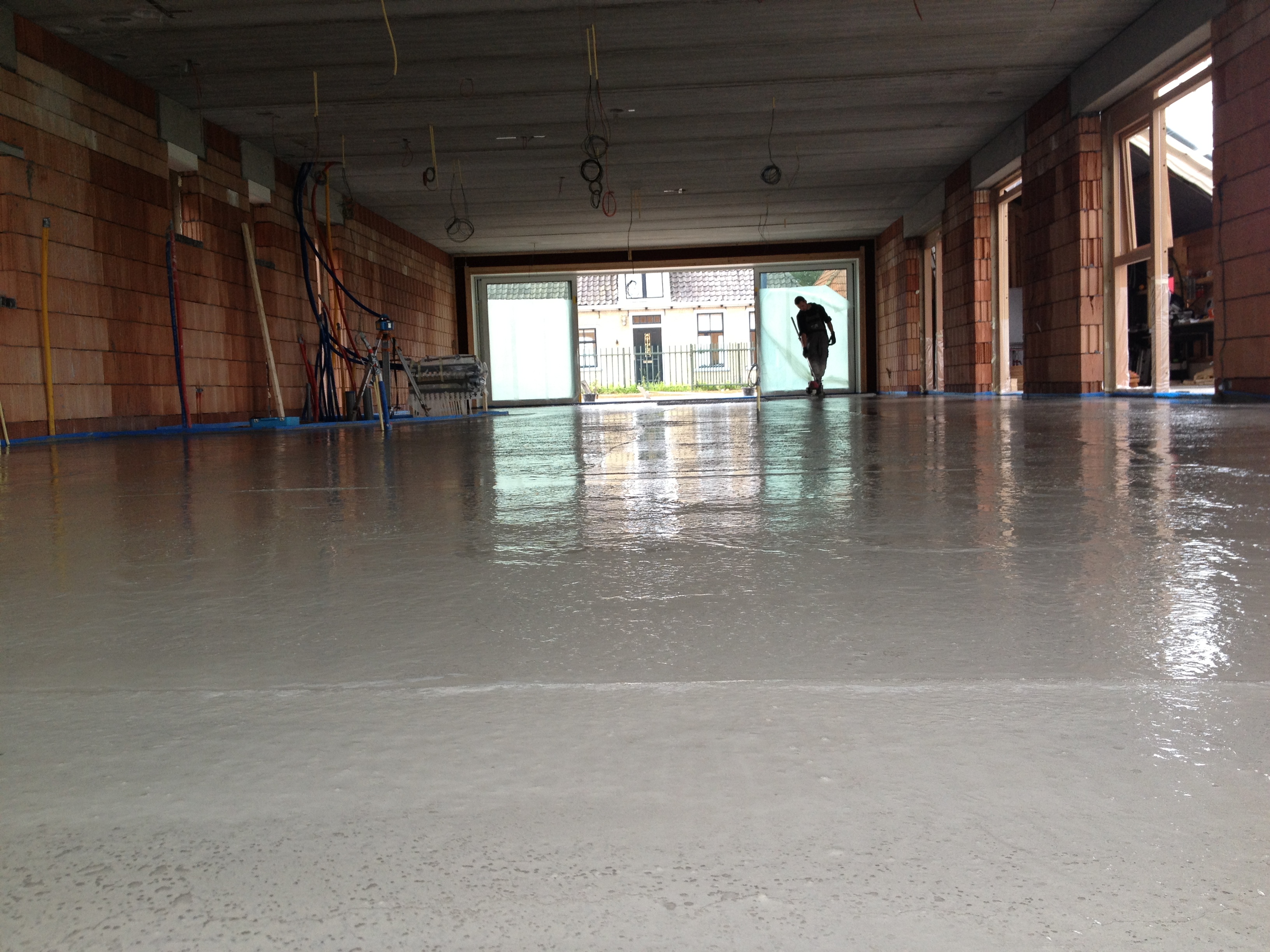 Ook nog wel een indrukwekkende gebeurtenis was het storten van de laatste betonnen vloer. Om 7 uur werd er gestort en in de middag kon er begonnen worden met vlinderen. Een arbiedsintensief klusje wat uiteindelijk tot 3 uur s’nachts zou duren. Het afwerken van een betonvloer moet gebeuren in de uithardingsfase van het beton, dus als de betonvloer nog net belopen kan worden. Met de vlindermachine wordt eerst de bovenste laag opengeschuurd en daarna net zo lang bewerkt tot de steentjes naar beneden zijn gezakt en er een glimmende harde toplaag is ontstaan. Je kunt je er inderdaad in spiegelen.