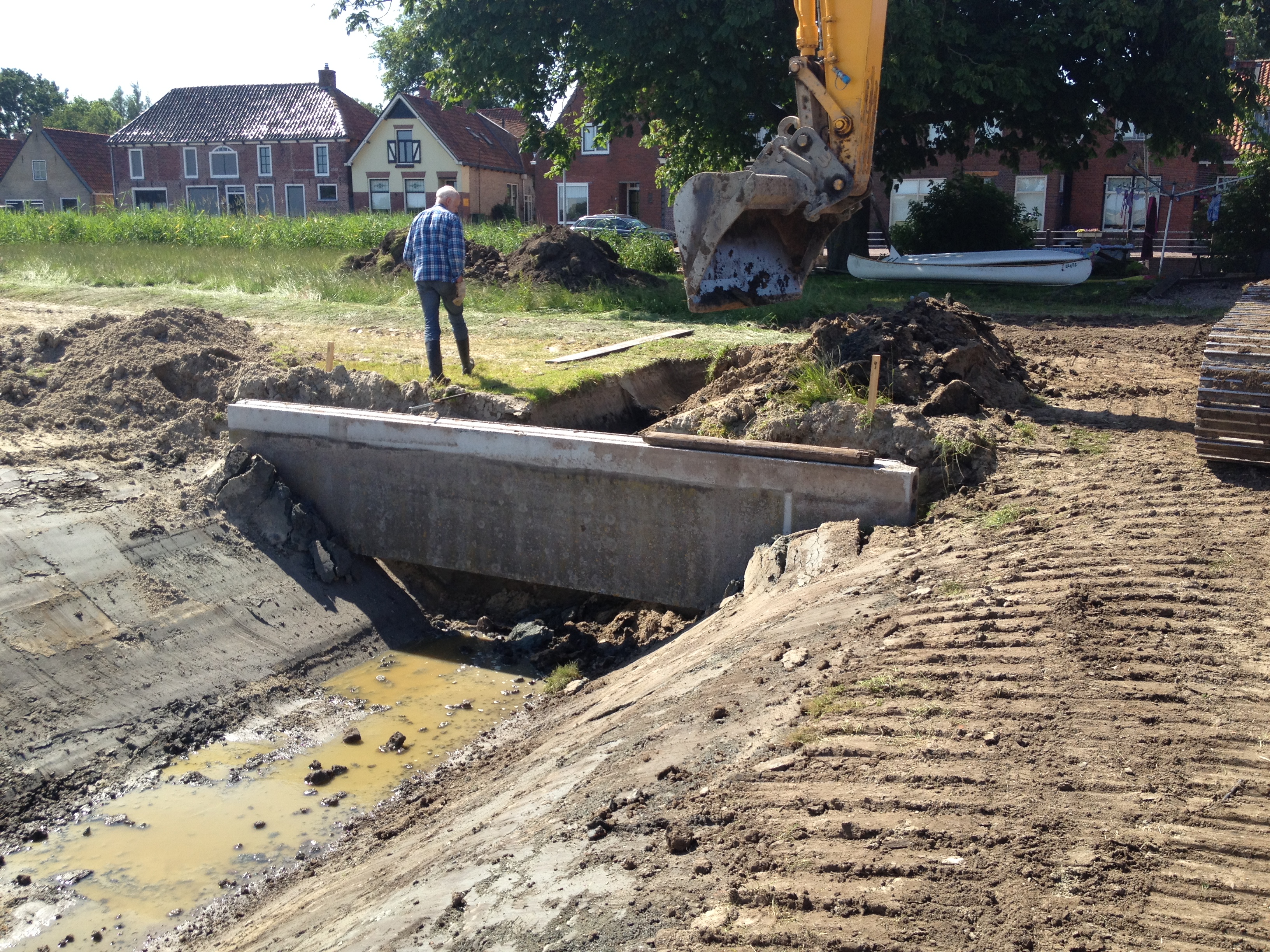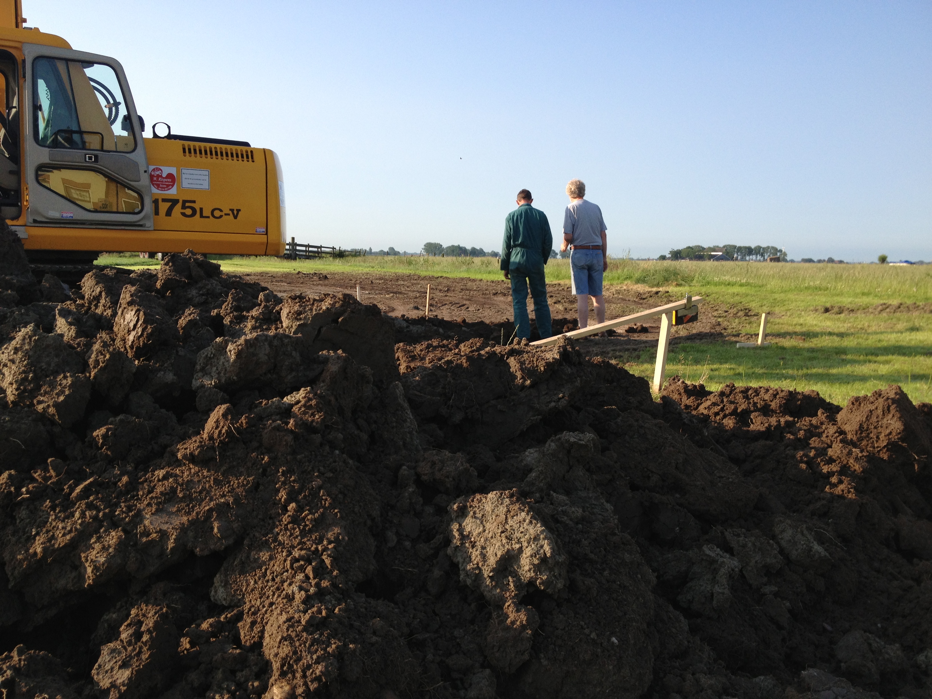 Zaterdag om half zeven kwamen de echt grote machines het land op gereden. Er werd een uur gedelibereerd door de heren Rispens, gemeten, gelaserd en paaltjes geslagen en toen ging de eerste hap klei eruit. Het was een spectaculair gezicht. Wij kunnen ons als stadsmensen niet voorstellen hoe je uberhaupt een sloot kunt realiseren, maar hier draaien ze er hun hand er niet voor om. Even een betonnen plaat van 8 x 1 meter verplaatsen is een werkje van 2 minuten…