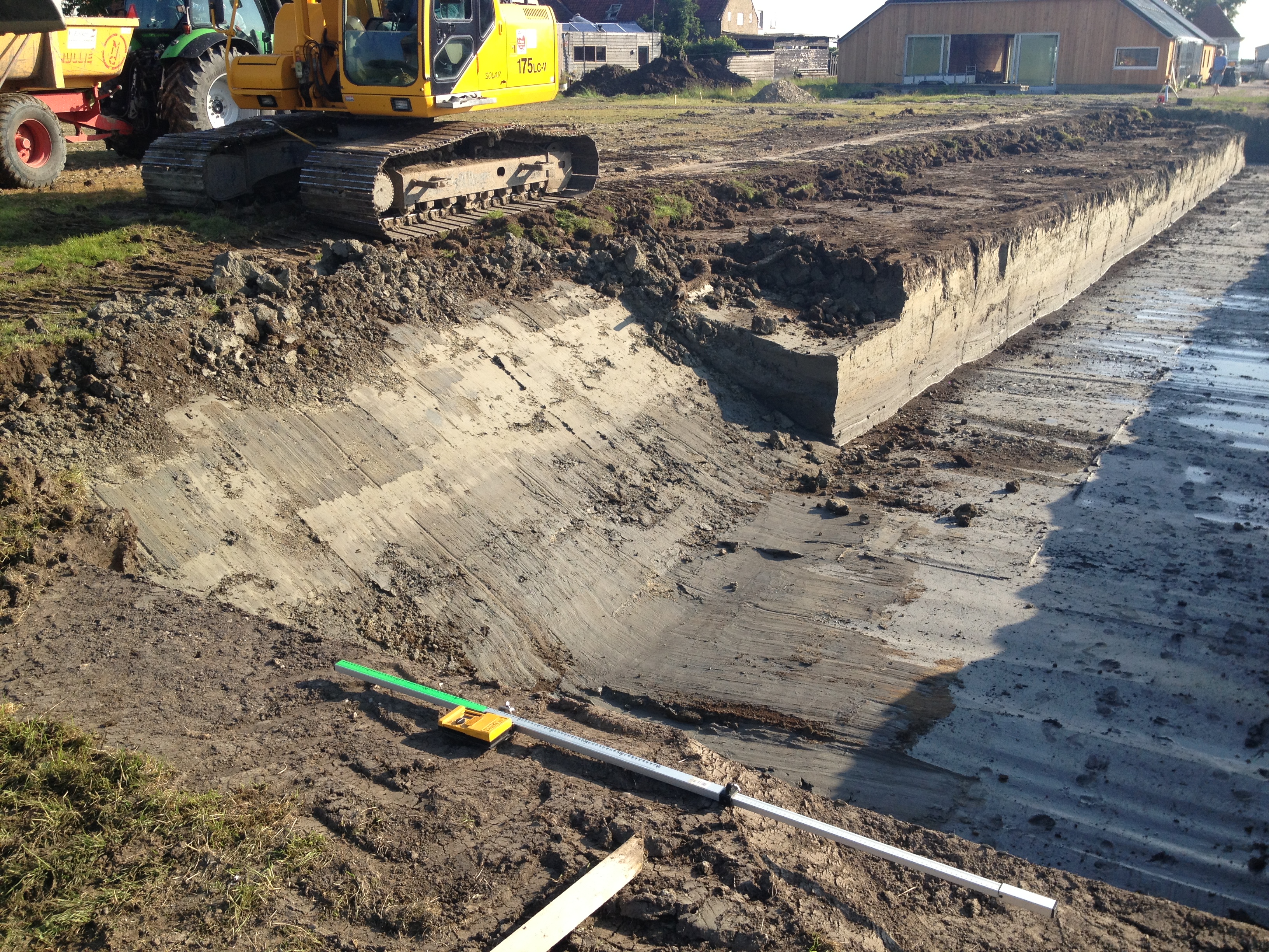 3 uur later was ons land getransformeerd in een ‘warzone’. De kern van de sloot was gegraven, maar nog zonder schuin oplopende kanten of talud. Het zag er meer uit als een enorme loopgraaf dan een aankomende sloot.