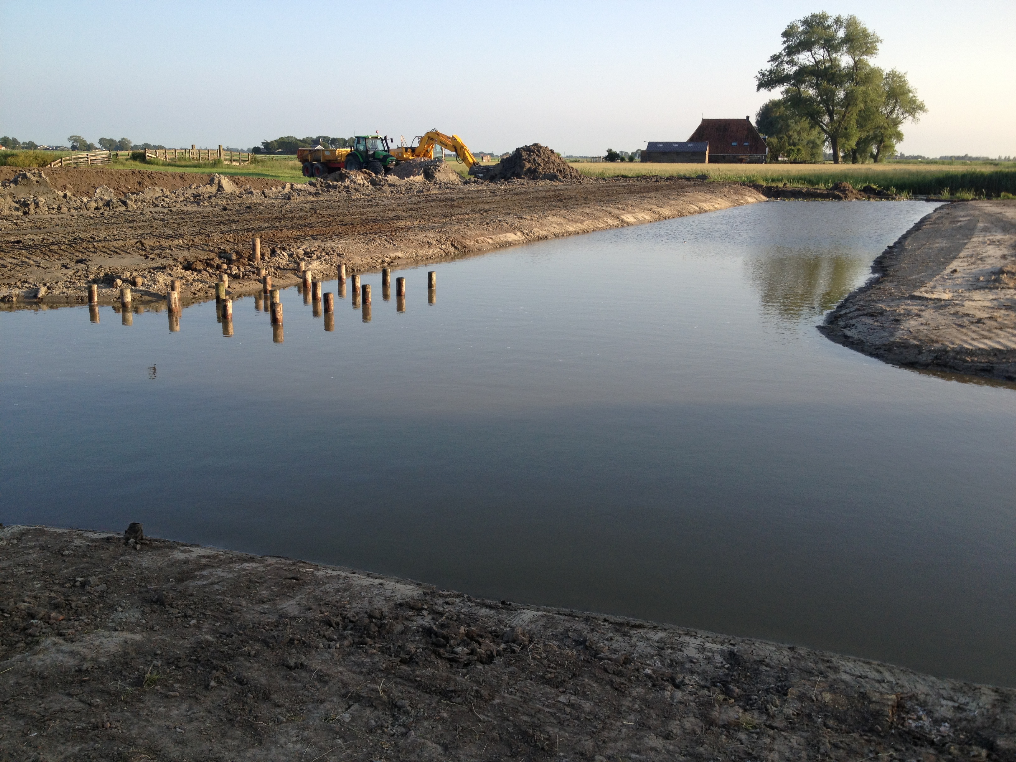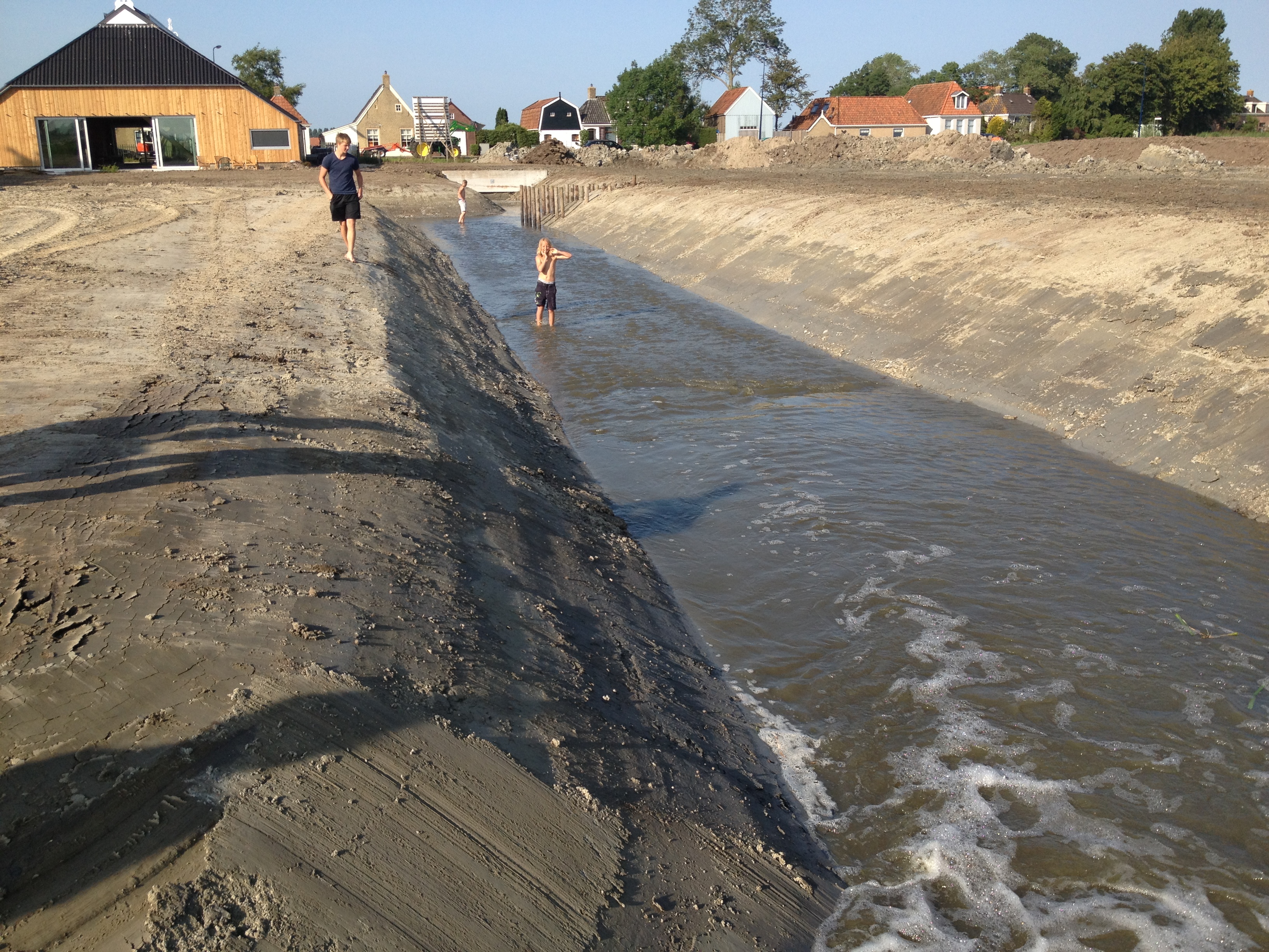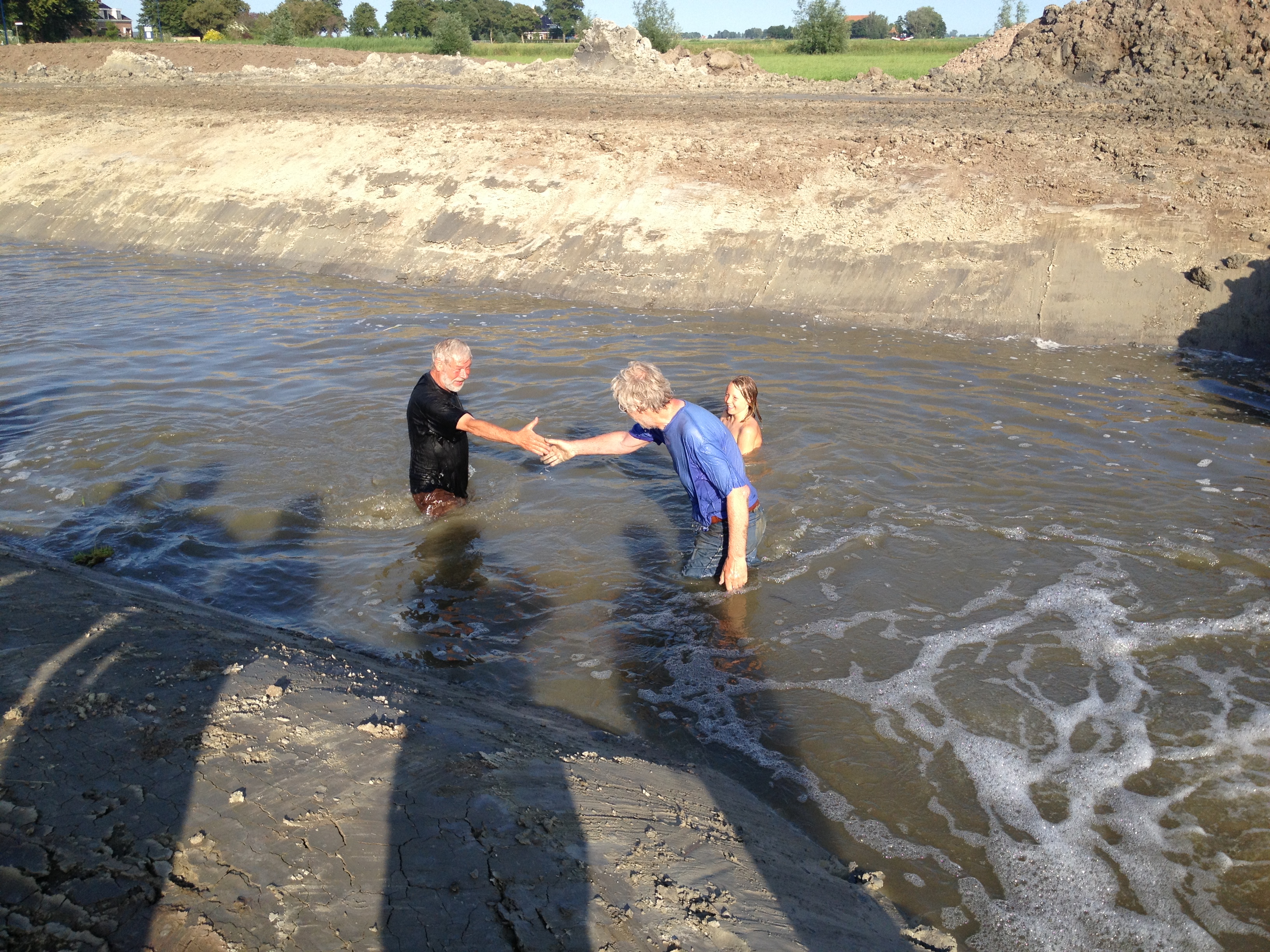 Eind van een zonovergoten dag. Op de valreep hadden we bedacht dat we van de palen die uit de paardenbak waren gekomen een steiger konden maken. Wij deden het meetwerk en Rispens drukte ze in de grond voor de dijk doorgestoken zou worden. En toen was het zover! Rienk nam een ‘hap’ uit de laatste strook land tussen de sloot en ons vers gegraven kanaal. Barbara en Rutger waren er toevallig en de buren kwamen aangerend. Eerst een piepklein straaltje en toen stroomde het water enthousiast binnen. Het was een feest! De kinderen van Anne en Ronald sprongen spontaan in het water. Nico Hoekstra zei tegen Jan dat hij ter ere van deze gebeurtenis toch wel het water in moest, maar Jan leek niet al te toeschietelijk. Als Nico erin ging zou Jan er ook in gaan.. Aldus gebeurde. Nico sprong met al zijn kleren aan in het water en Jan kon niet achterblijven. Ze moesten er ook nog lang in blijven want zolang het water niet op diepte was konden ze niet tegen de glibberige kant omhoog komen. Een mijlpaal 🙂