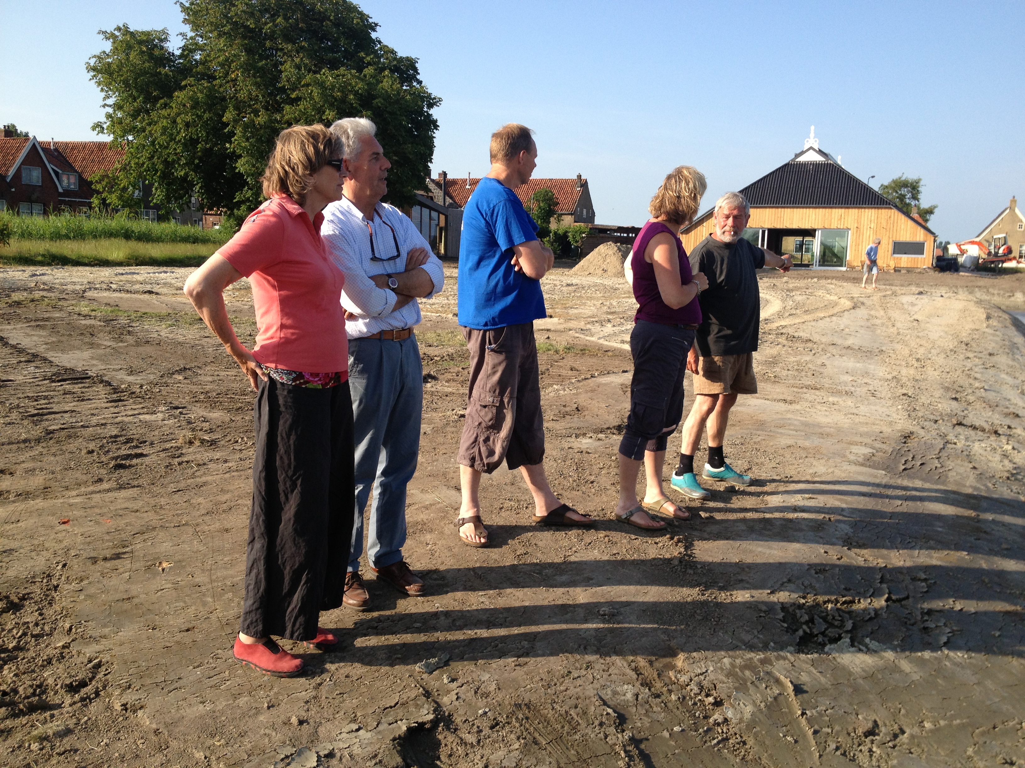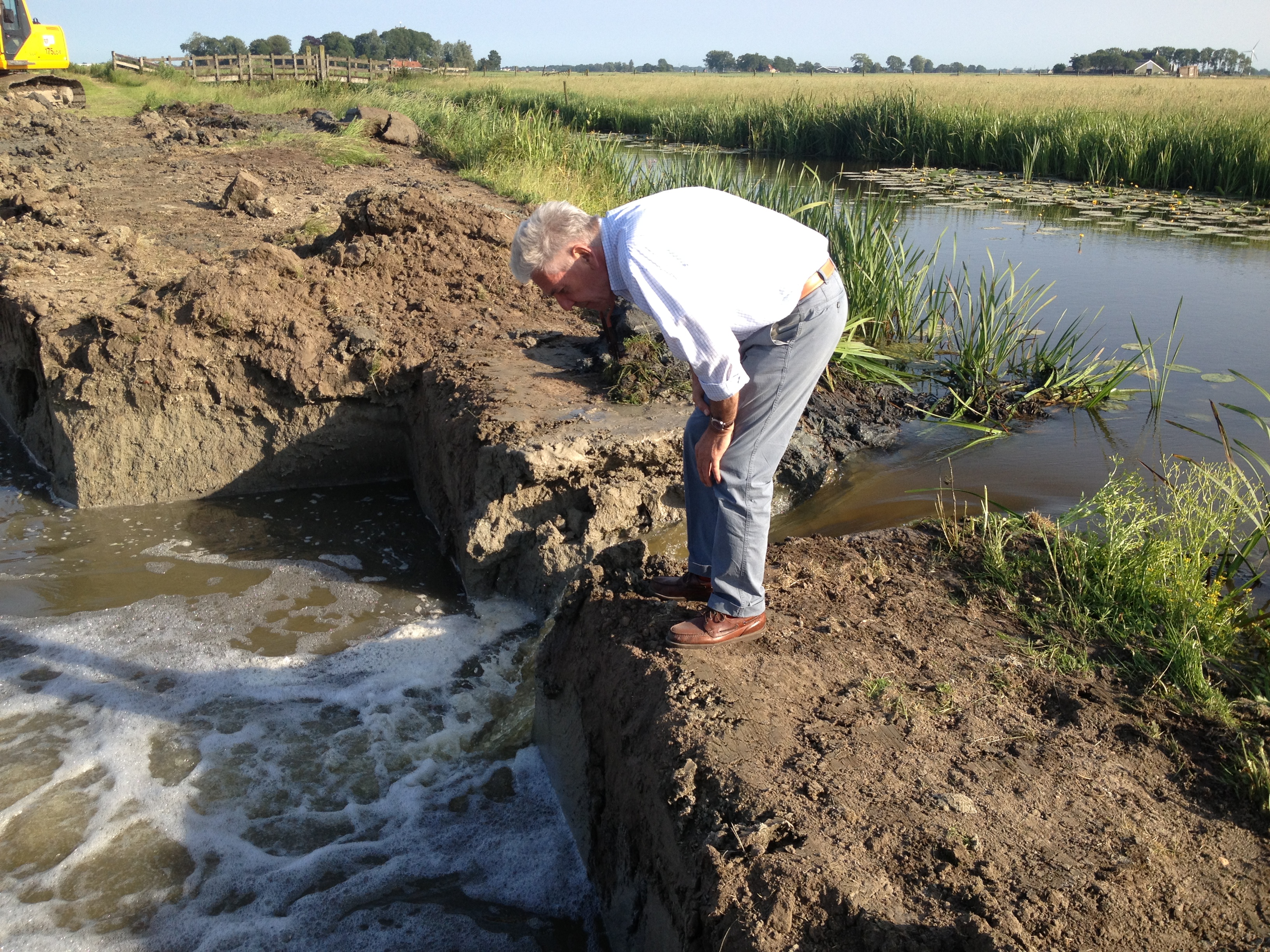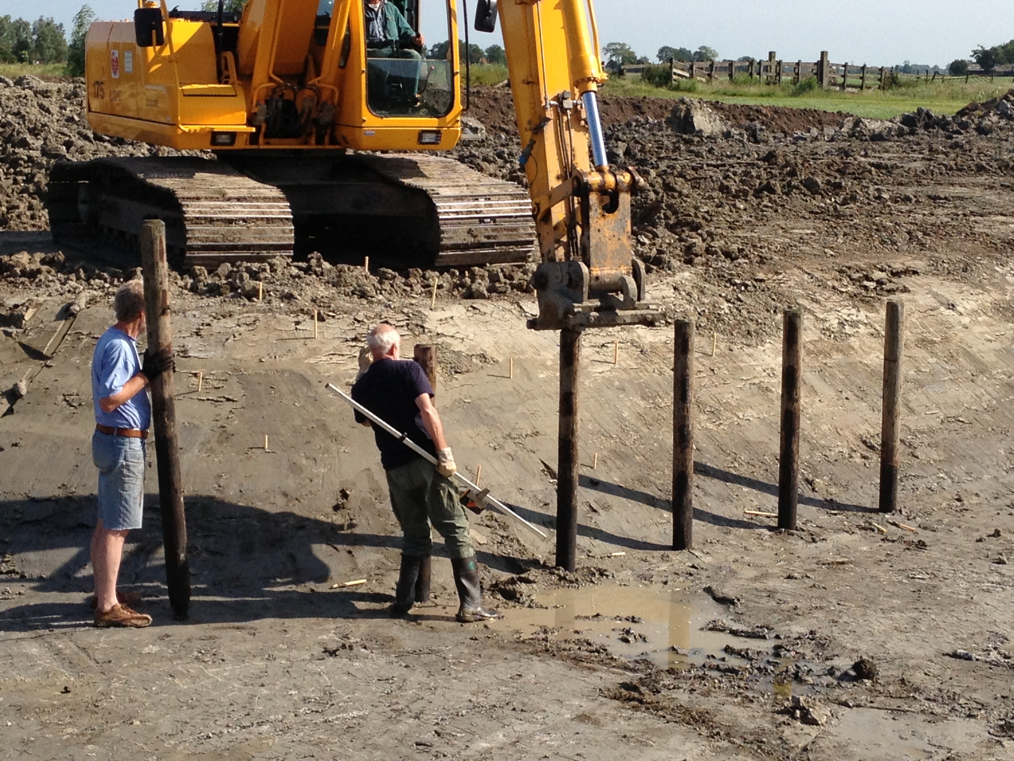Eind van een zonovergoten dag. Op de valreep hadden we bedacht dat we van de palen die uit de paardenbak waren gekomen een steiger konden maken. Wij deden het meetwerk en Rispens drukte ze in de grond voor de dijk doorgestoken zou worden. En toen was het zover! Rienk nam een ‘hap’ uit de laatste strook land tussen de sloot en ons vers gegraven kanaal. Barbara en Rutger waren er toevallig en de buren kwamen aangerend. Eerst een piepklein straaltje en toen stroomde het water enthousiast binnen. Het was een feest! De kinderen van Anne en Ronald sprongen spontaan in het water. Nico Hoekstra zei tegen Jan dat hij ter ere van deze gebeurtenis toch wel het water in moest, maar Jan leek niet al te toeschietelijk. Als Nico erin ging zou Jan er ook in gaan.. Aldus gebeurde. Nico sprong met al zijn kleren aan in het water en Jan kon niet achterblijven. Ze moesten er ook nog lang in blijven want zolang het water niet op diepte was konden ze niet tegen de glibberige kant omhoog komen. Een mijlpaal 🙂