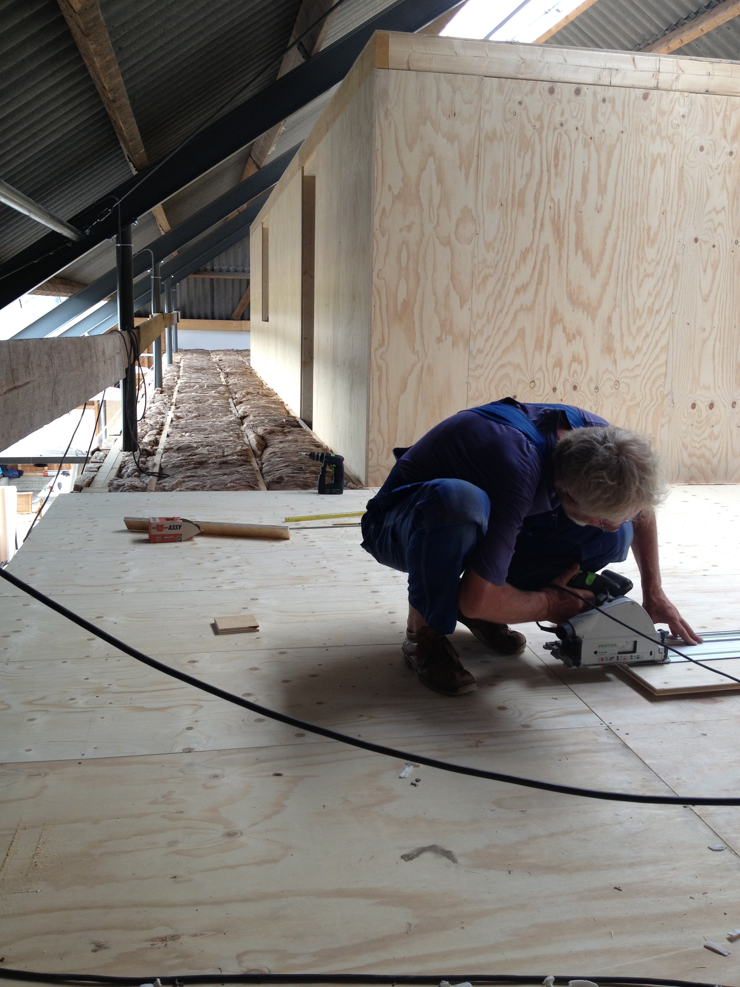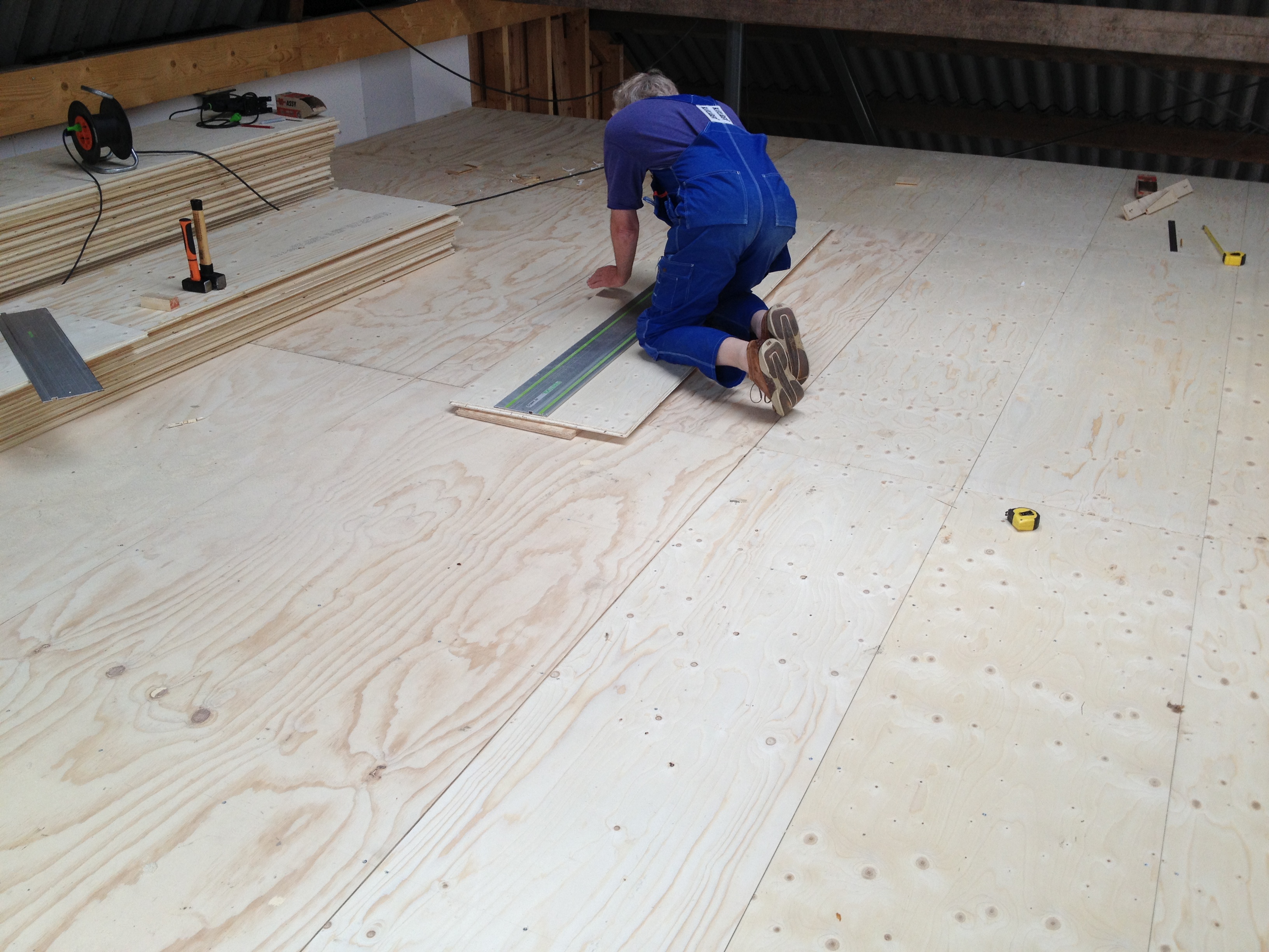 De vloer, of liever gezegd het dak, van het woonvolume kan van het lijstje weggestreept. Er ligt een keurige vloer van underlayment en het is een perfecte tentoonstellingsruimte geworden. De eerste ideeen liggen al te pruttelen.