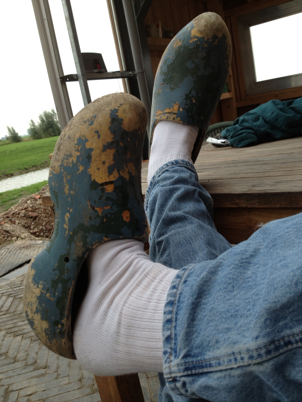 De druk om fries te worden wordt al groter. Vanochtend stonden deze klompen ineens in de woonschuur… Grote maat! maar helaas niet helemaal groot genoeg. (‘It ken net!’)