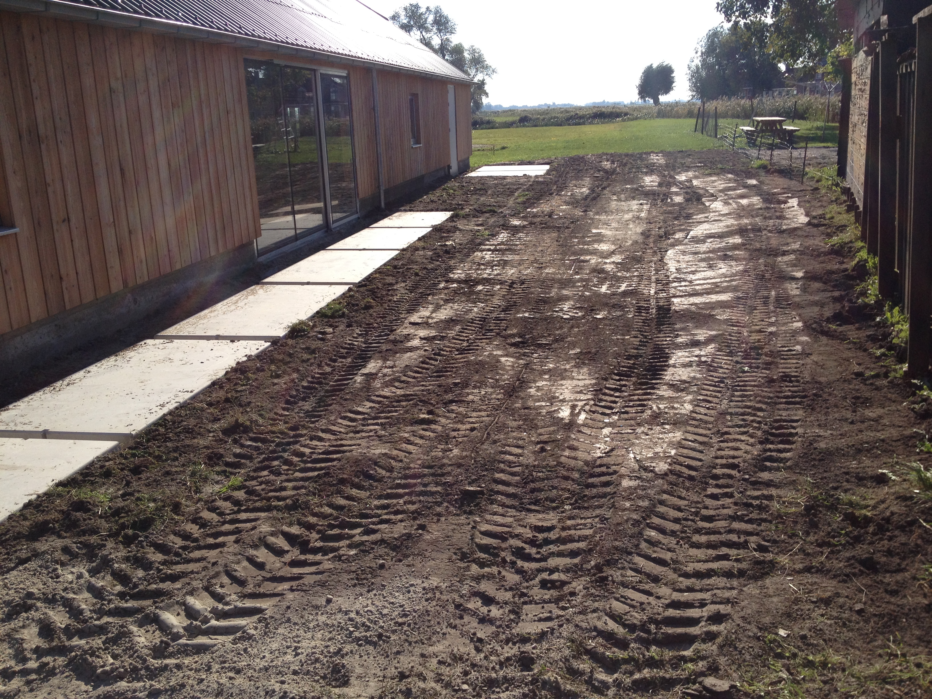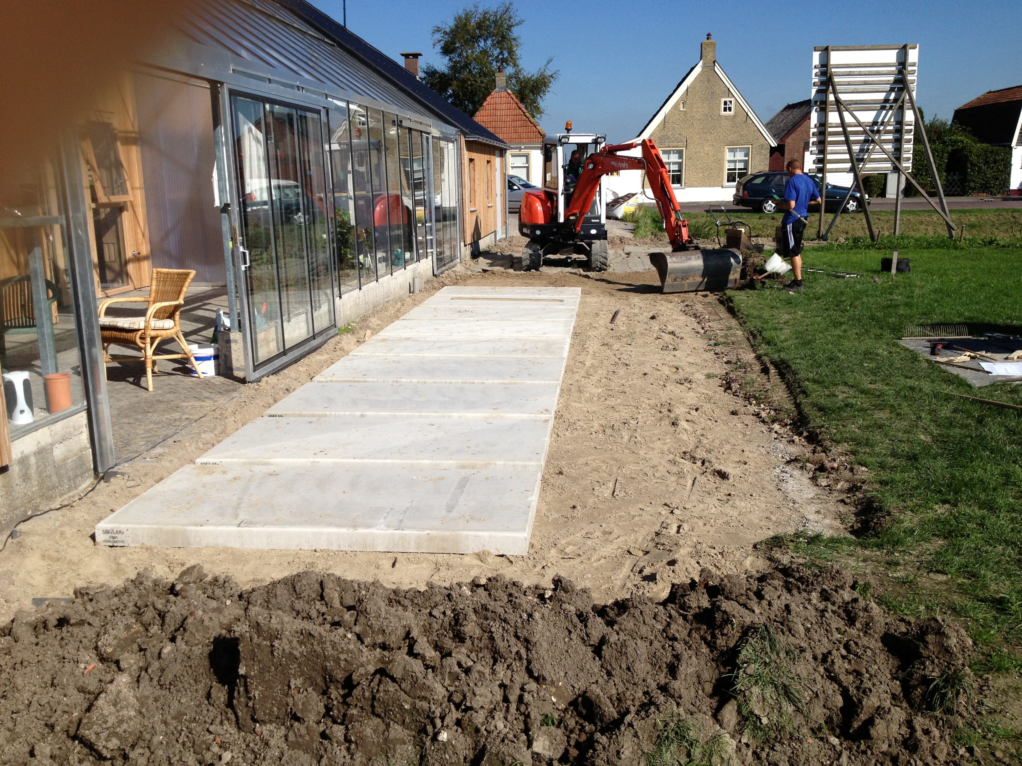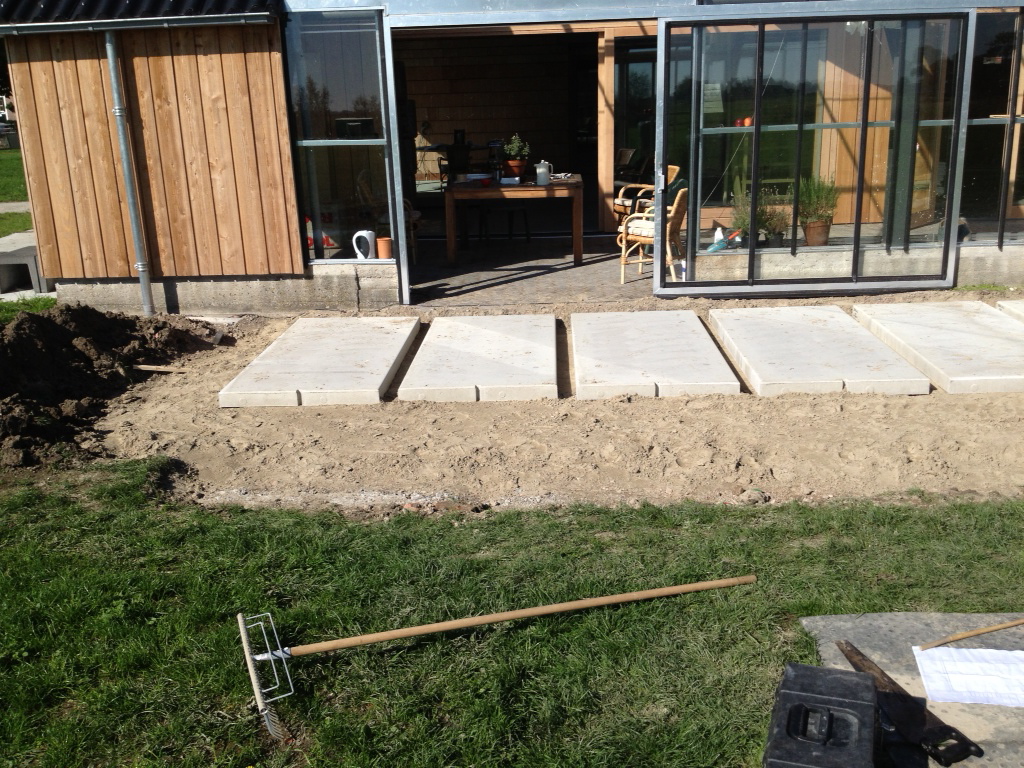 Intussen werd er buiten gewerkt aan het terras. Vanaf nu kunnen we bij slecht weer zonder kilo’s modder aan onze schoenen de voordeur bereiken. Het was weer millimeterwerk van de firma Rispens.