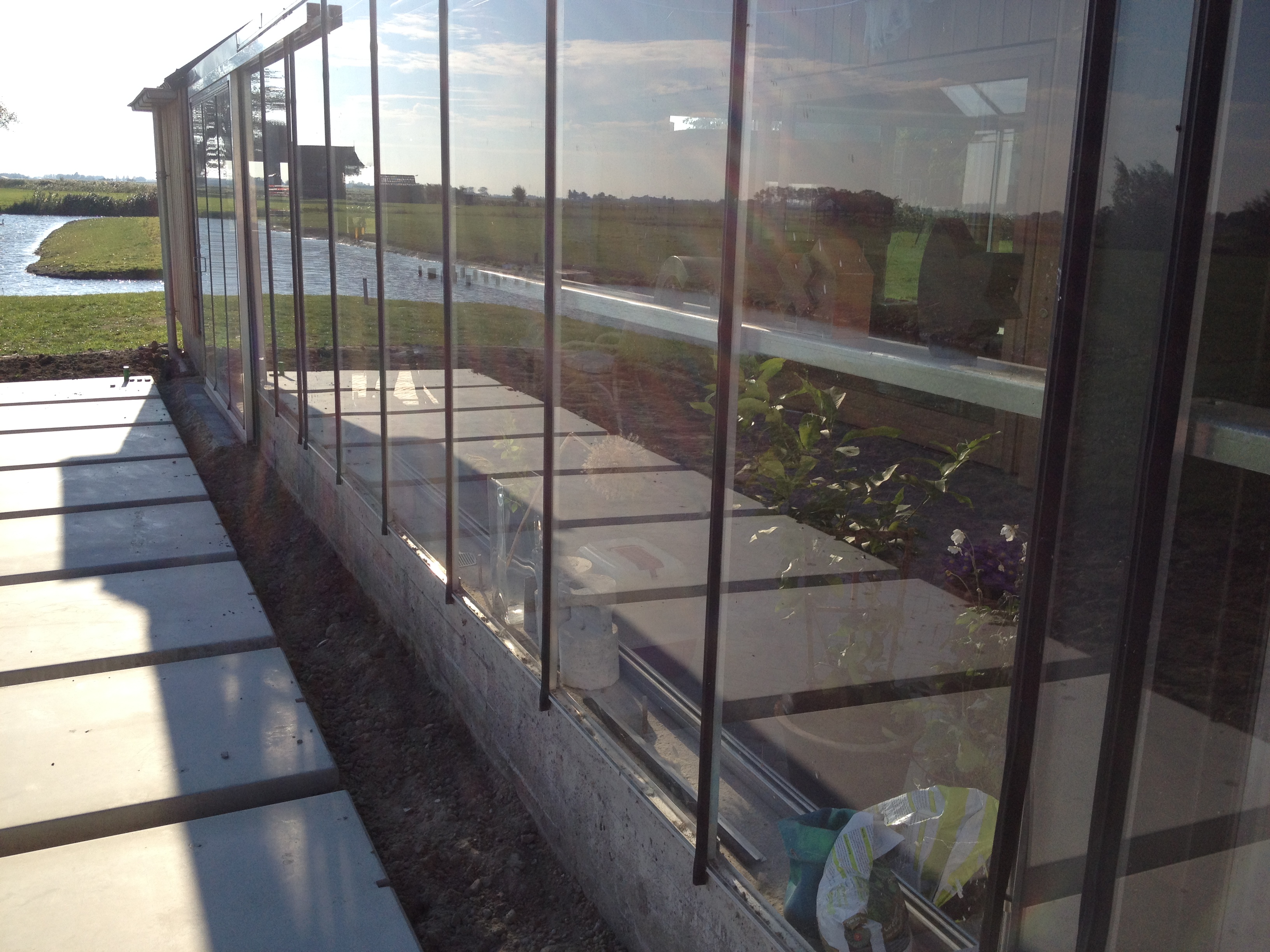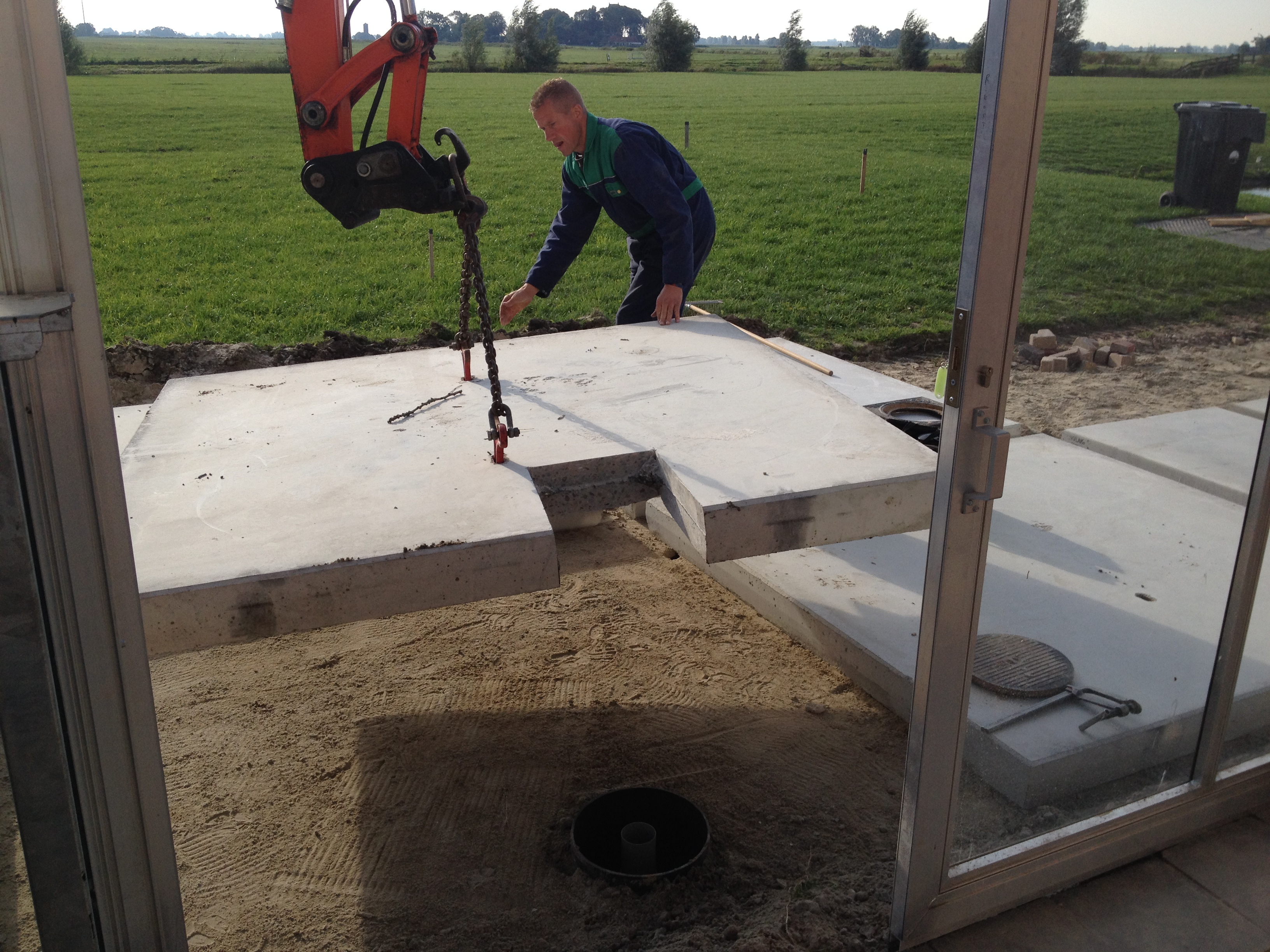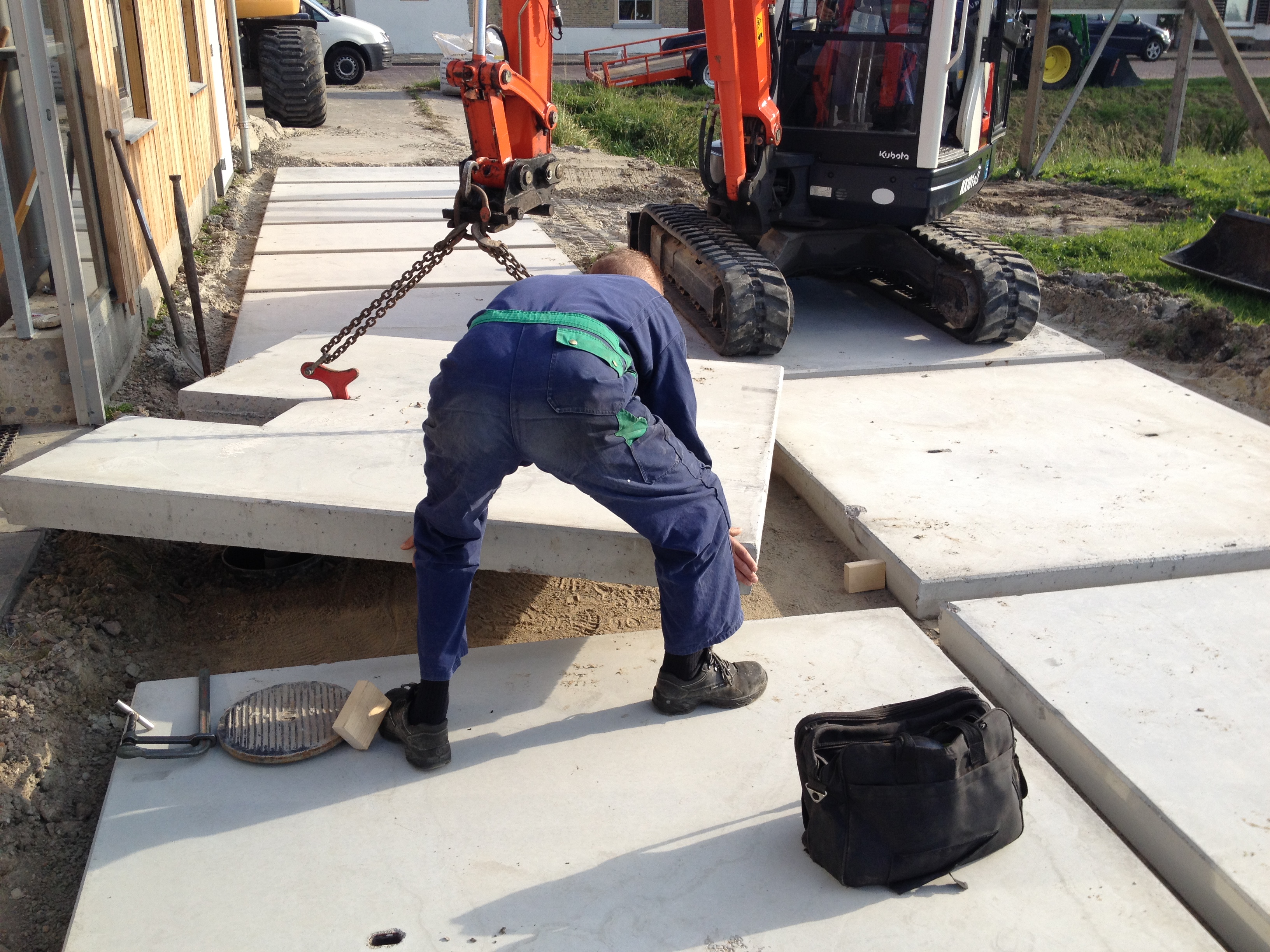 Intussen werd er buiten gewerkt aan het terras. Vanaf nu kunnen we bij slecht weer zonder kilo’s modder aan onze schoenen de voordeur bereiken. Het was weer millimeterwerk van de firma Rispens.