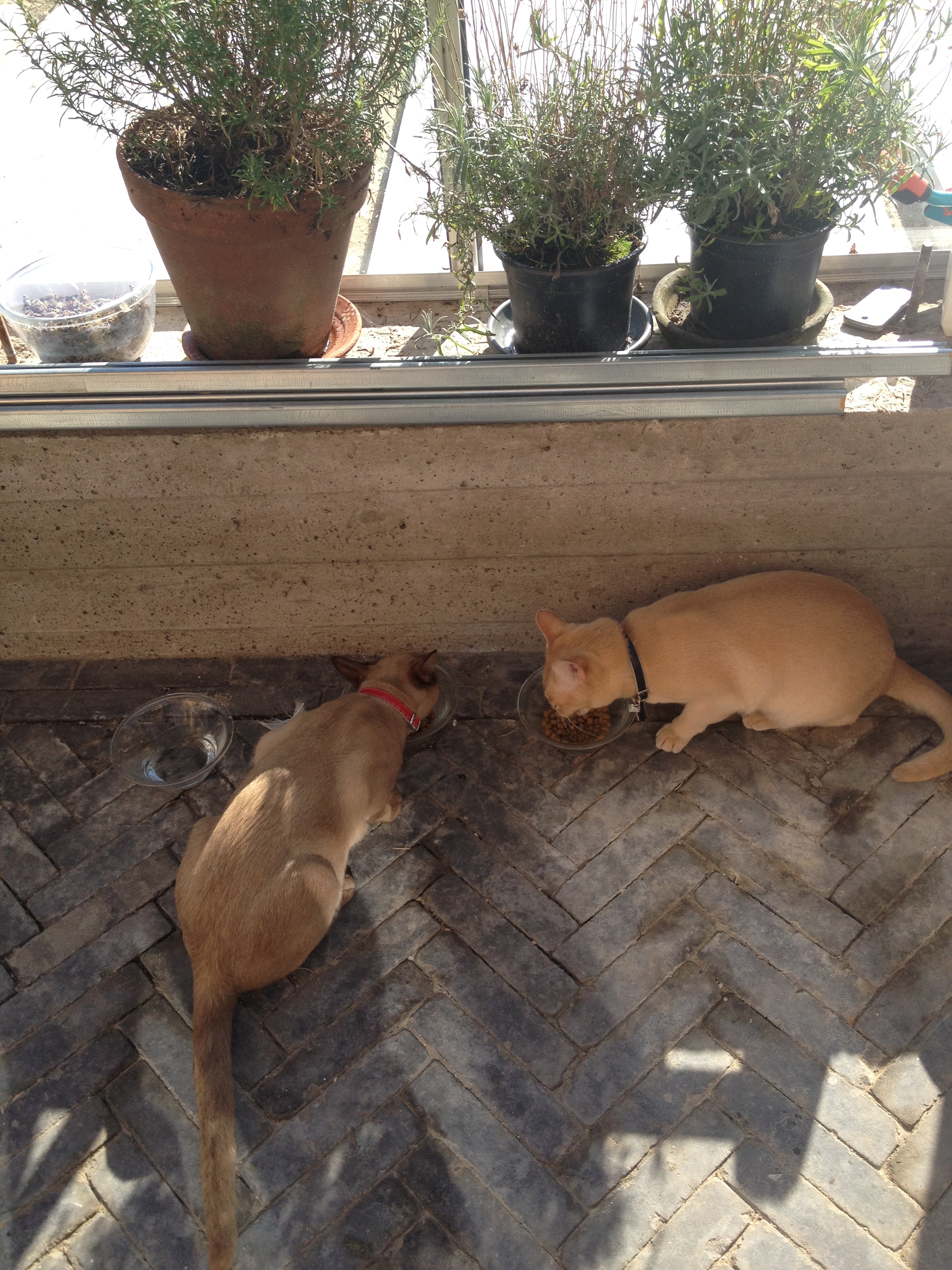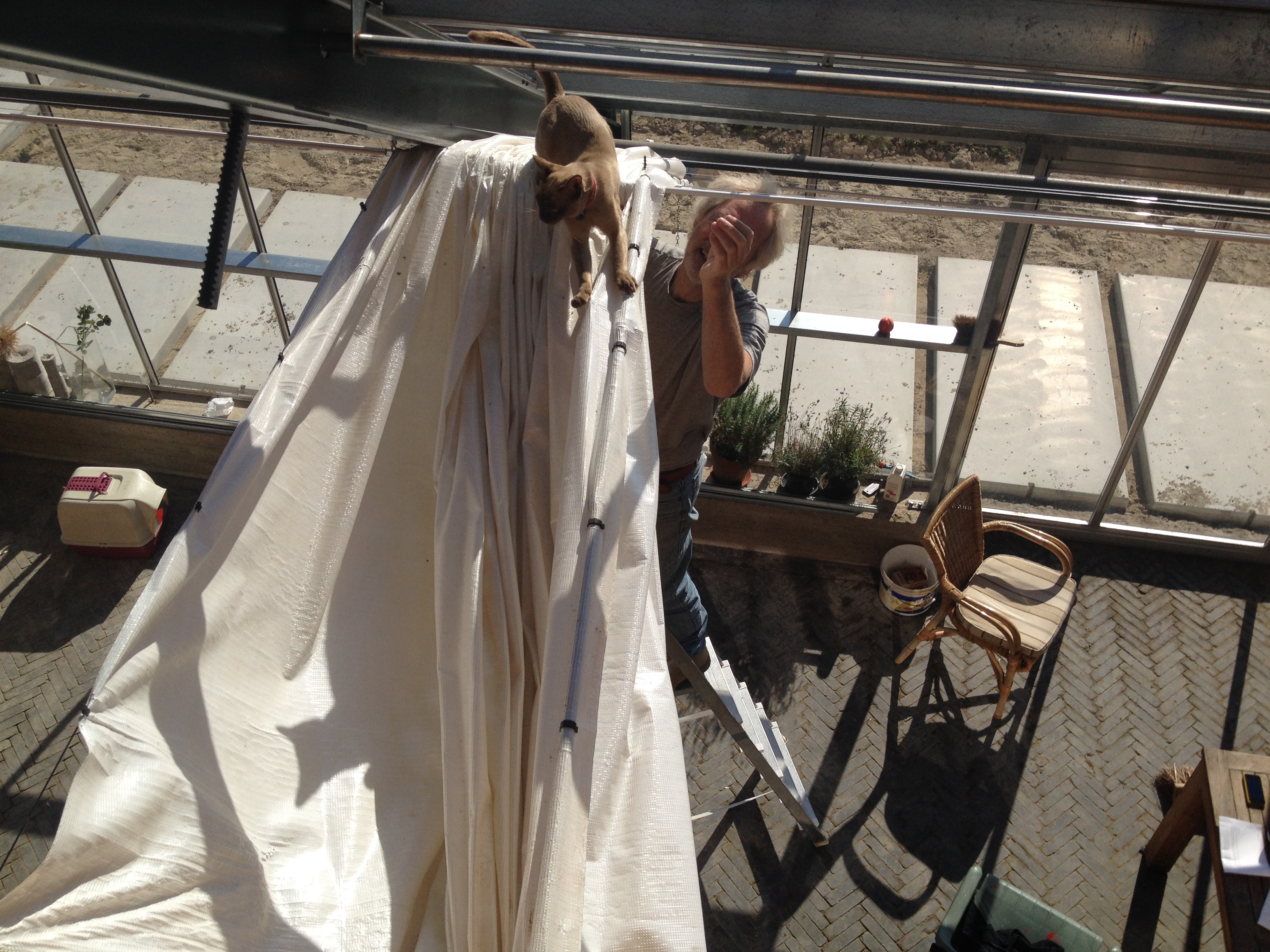 Het gaat al bijna voelen als thuis. Drie tevreden poezen kijken gebiologeerd naar alle eenden, ganzen, hoentjes en zwanen. En daar hebben er veel van. Onze ‘paardenbak’ is een ware ‘vogelbak’ geworden. Het duurde nog geen half uur of Bonje, zijn naam waardig, hing in de zonwering van de wintertuin, waar hij met geen mogelijkheid zelf uit kon komen. Midas Dekkers zei wel ‘heb je ooit wel eens een dooie kat in een boom zien zitten’, maar met half gedemonteerde zonwering zit het toch wat ingewikkelder.