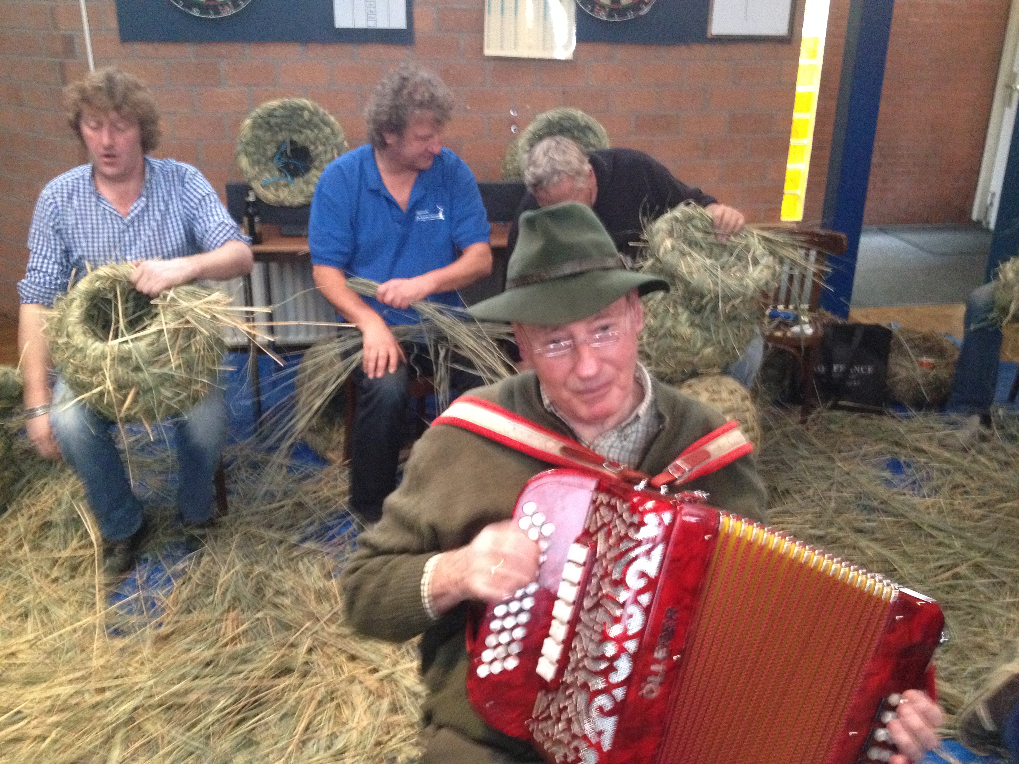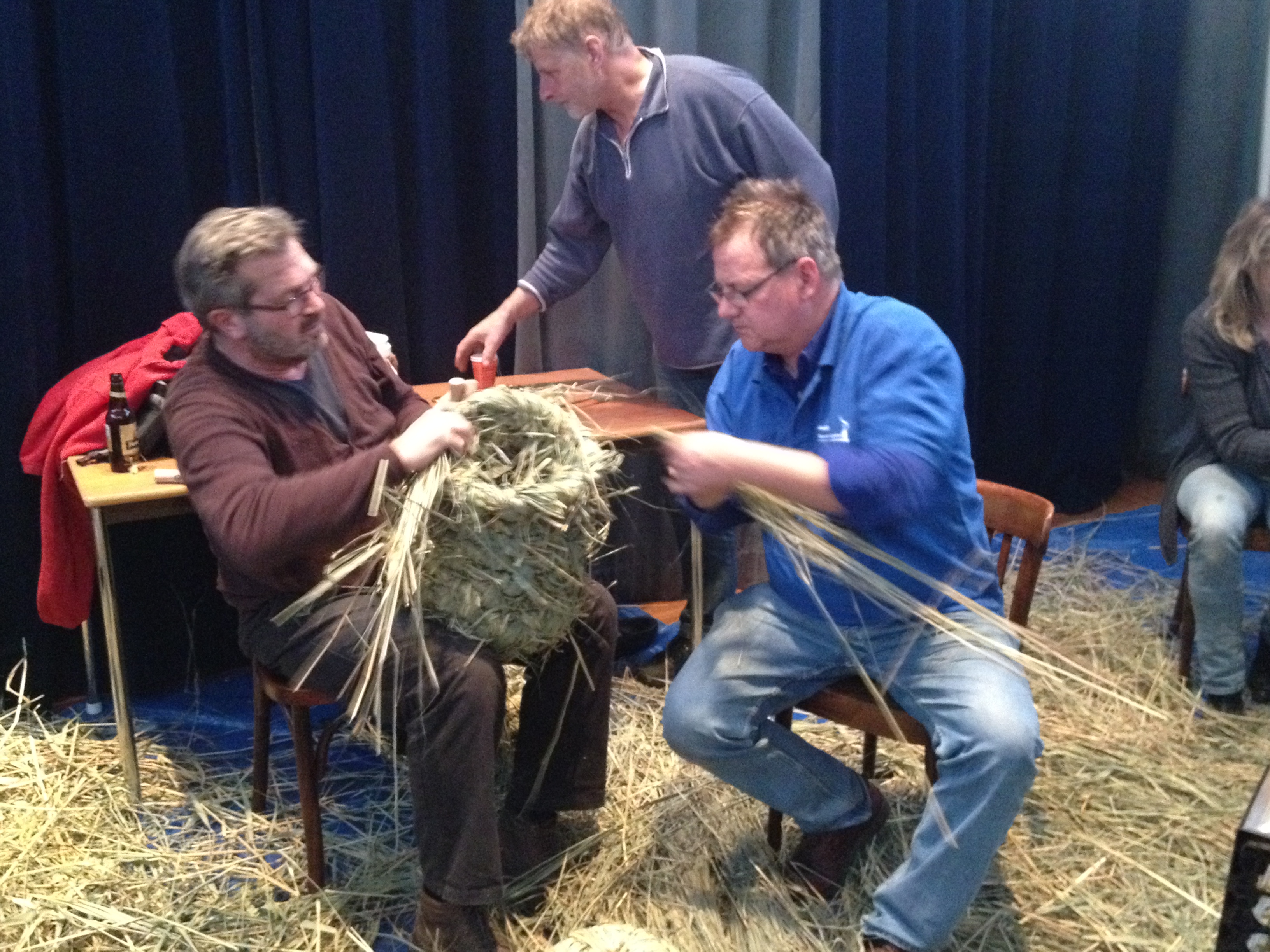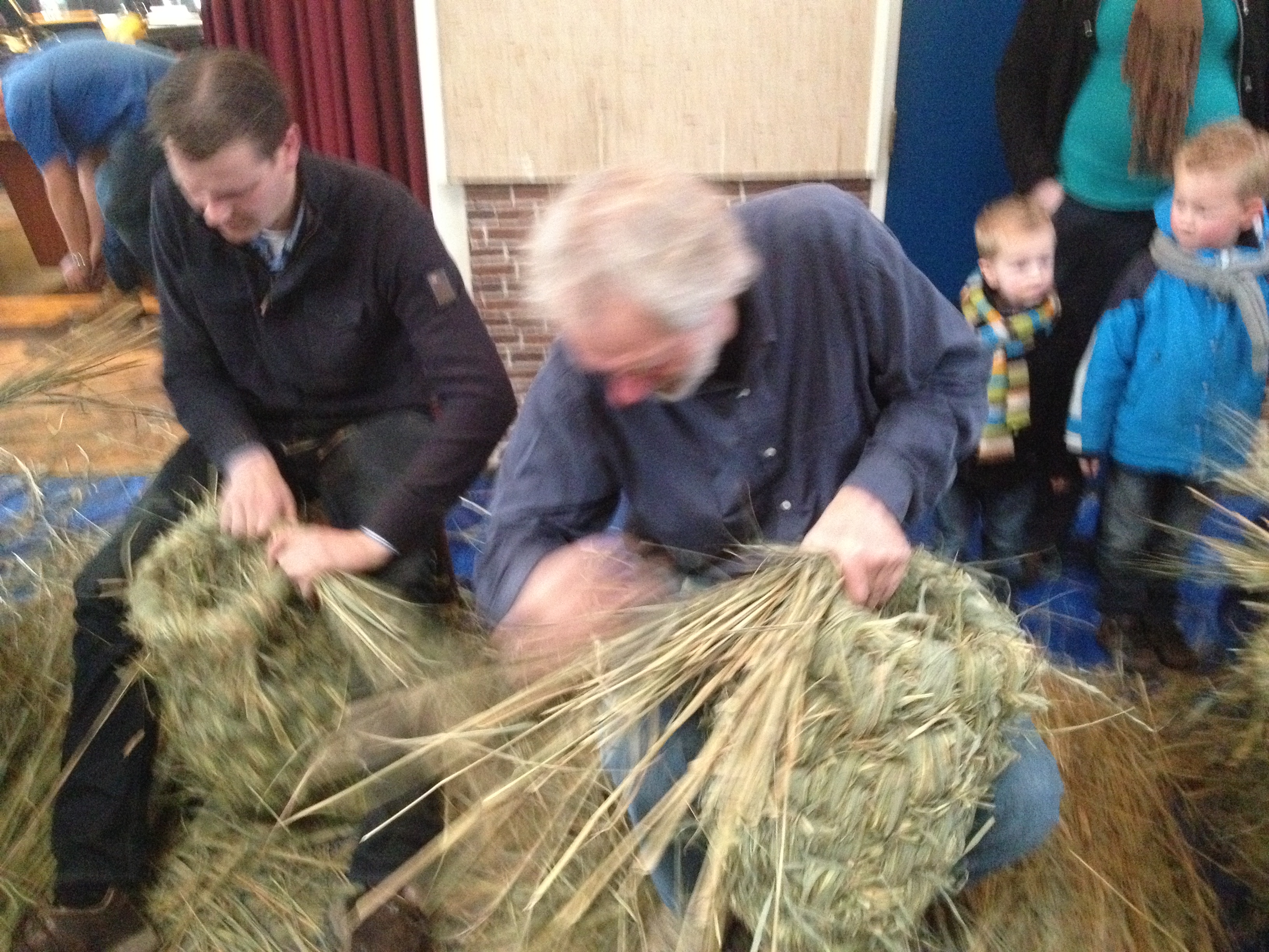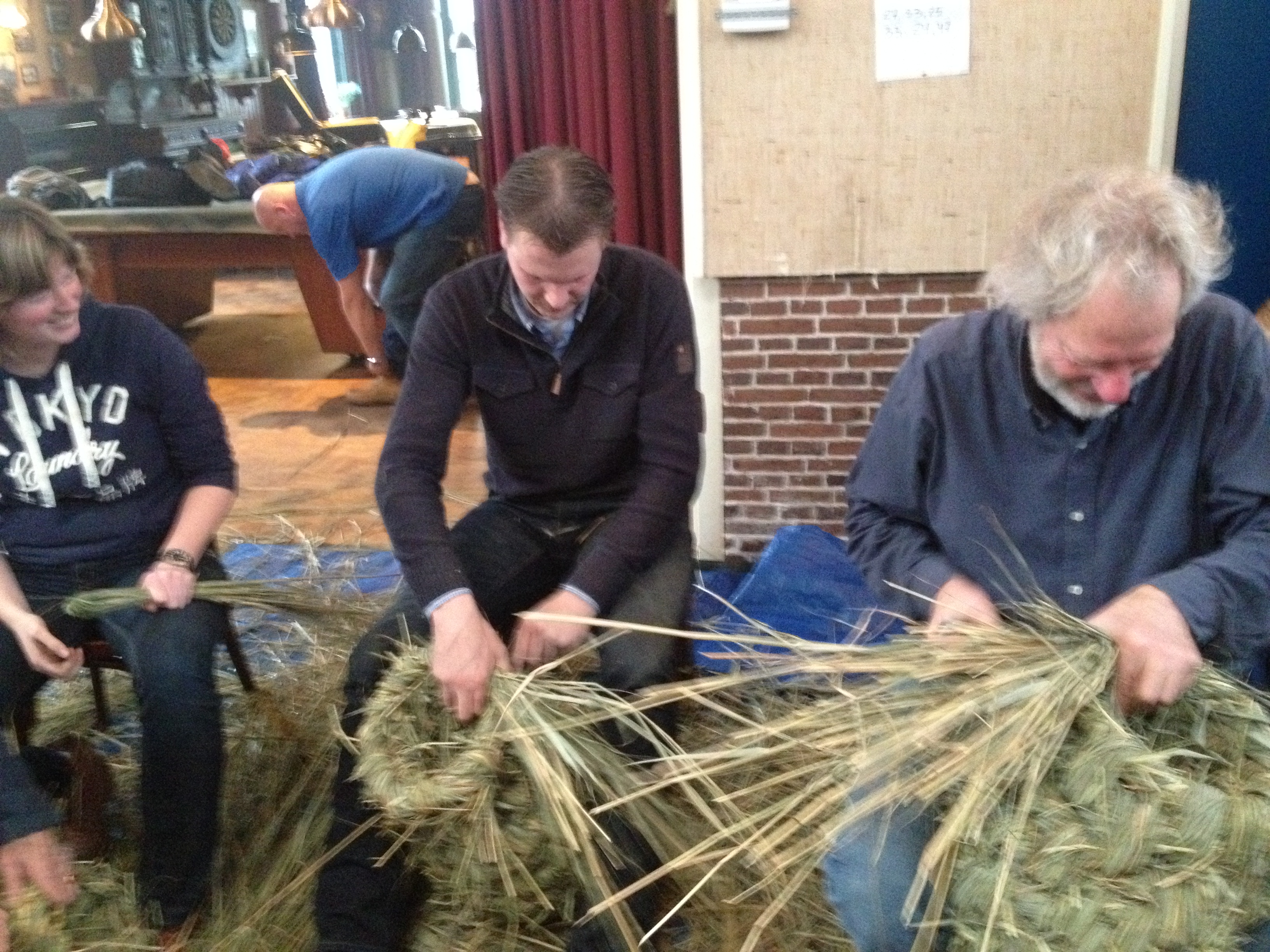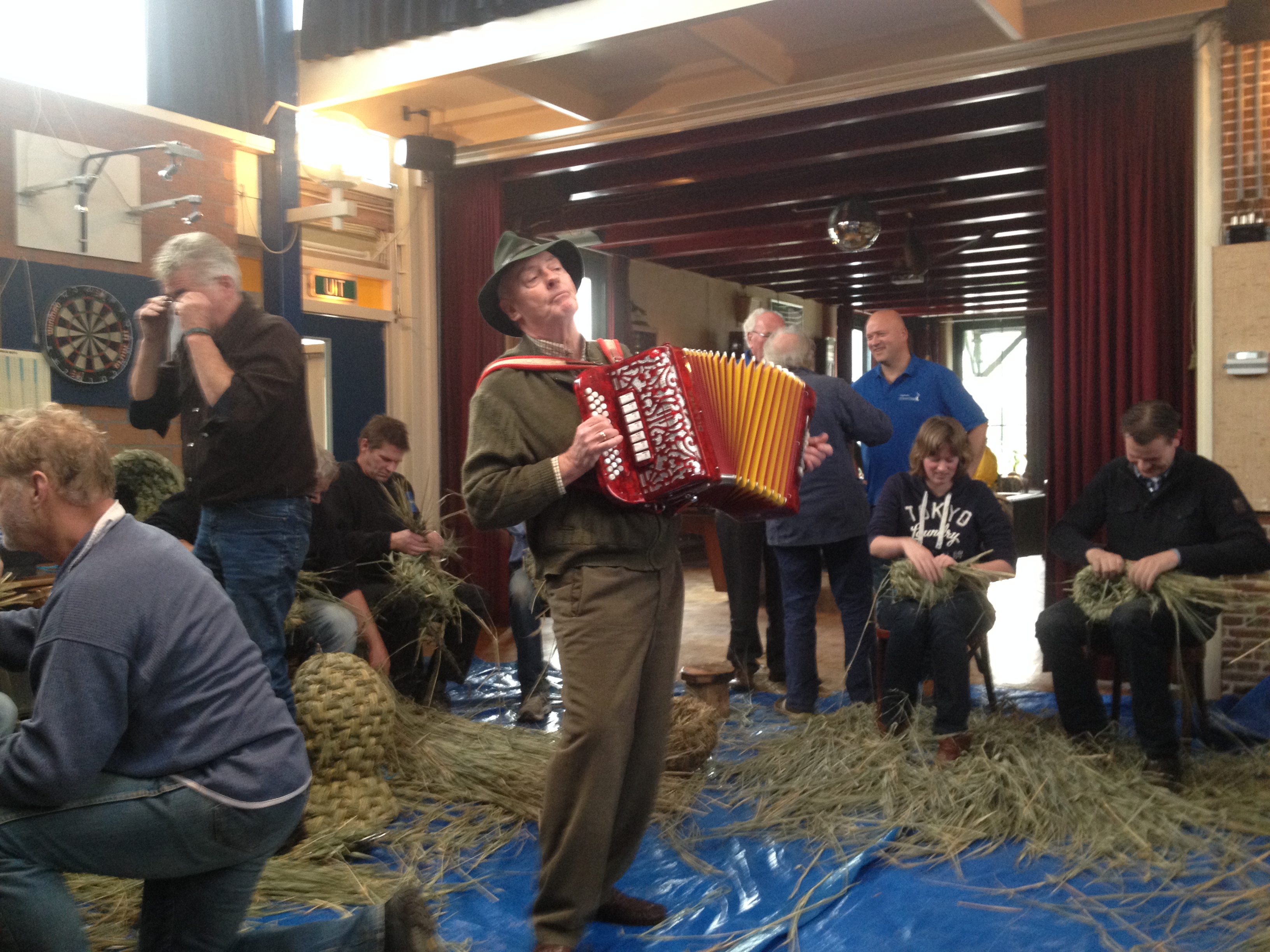 Het enthousiasme was groot. In de achterzaal van het dorpshuis waren zeilen neergelegd, een rondje stoelen erop en iedereen kreeg een bos riet en een vlechthaak. De twee deskundigen legden alles in het kort en onvervalst fries uit en het werk kon beginnen. Het was het begin van 3 uur bloed, zweet en plezier. Voor musicale verstrooiing was gezorgd. In het midden stond iemand met een harmonika die bekende liedjes speelde, die bij tijd en wijlen luidkeels werden meegezongen door mijn buurman. We werden onderwijl verzorgd met broodjes en flesjes bier die er in gingen als koek. Aan het eind van de rit zag de zaal er heel anders uit. De vloer dikbelegd met riet, een enorme stapel korven in diverse vormen en maten, en veel tevreden mensen aan het bier.