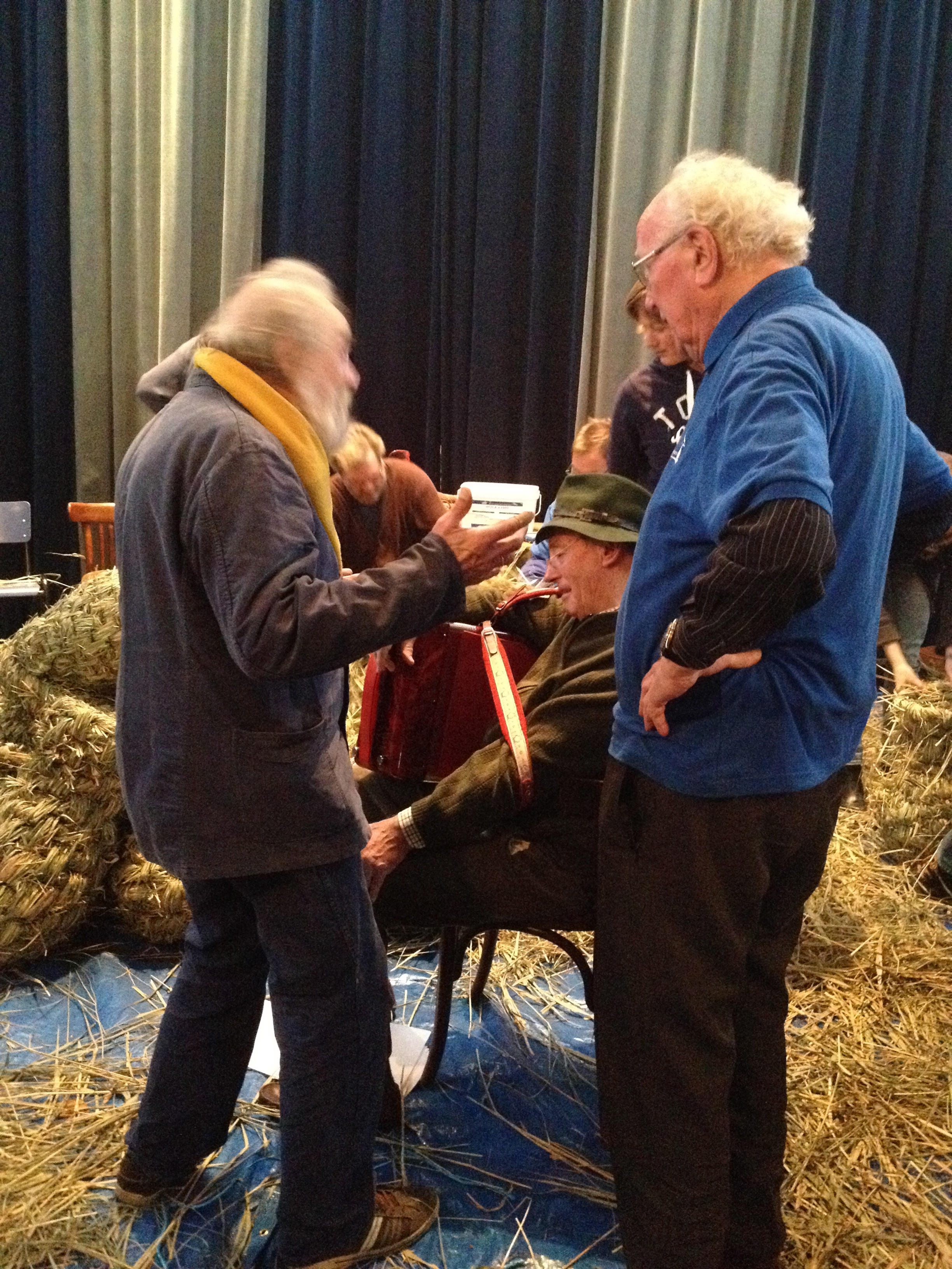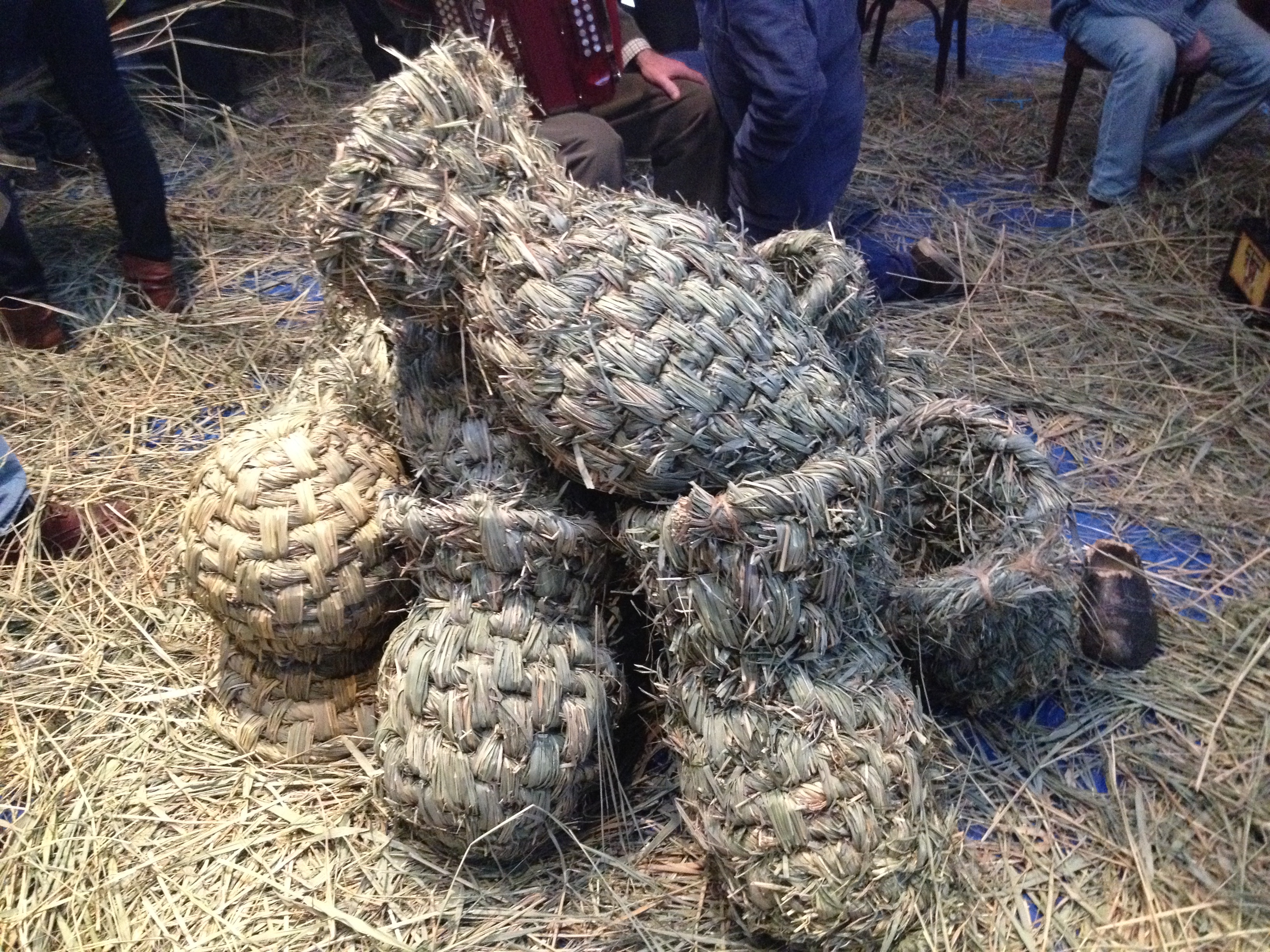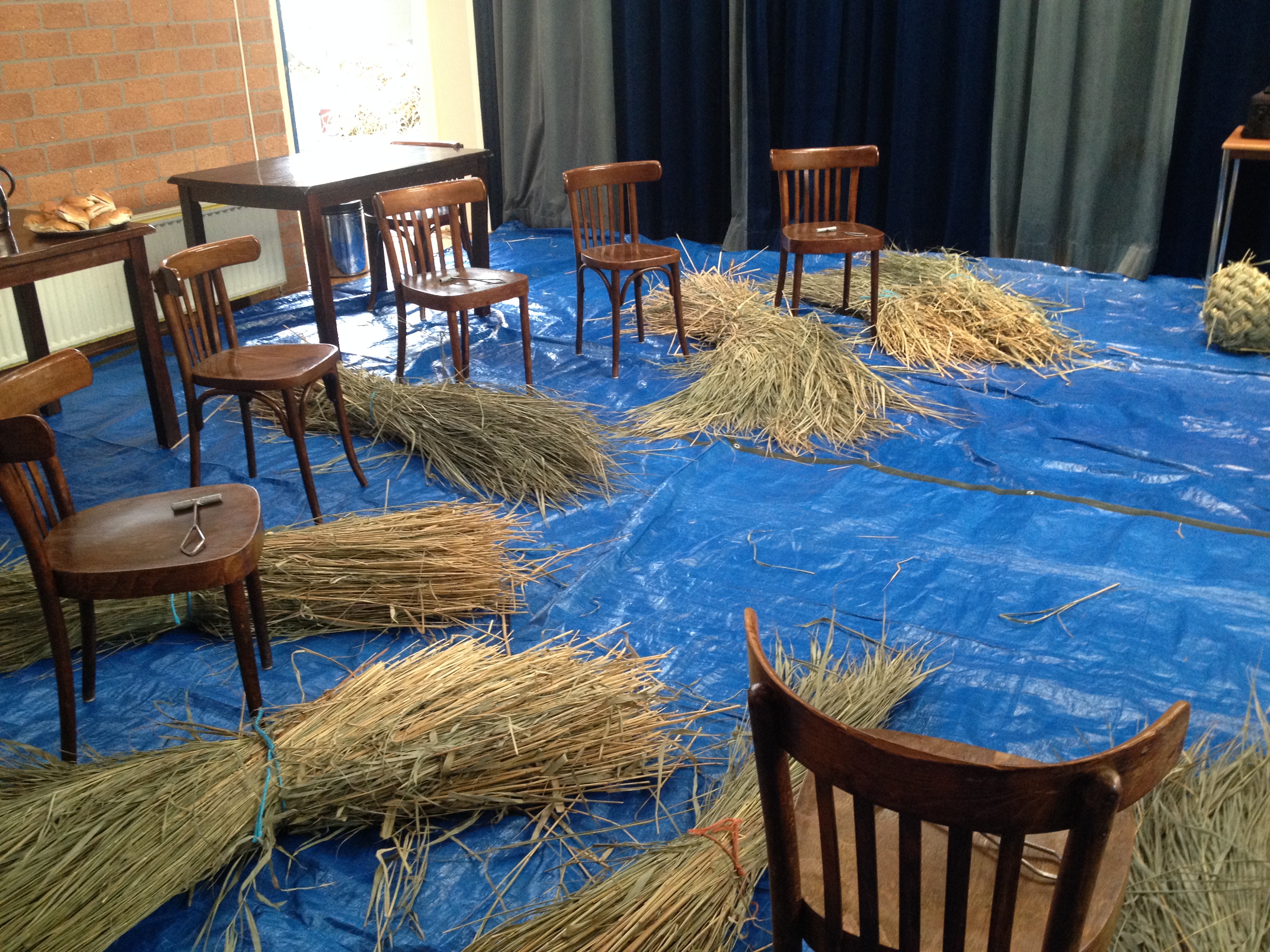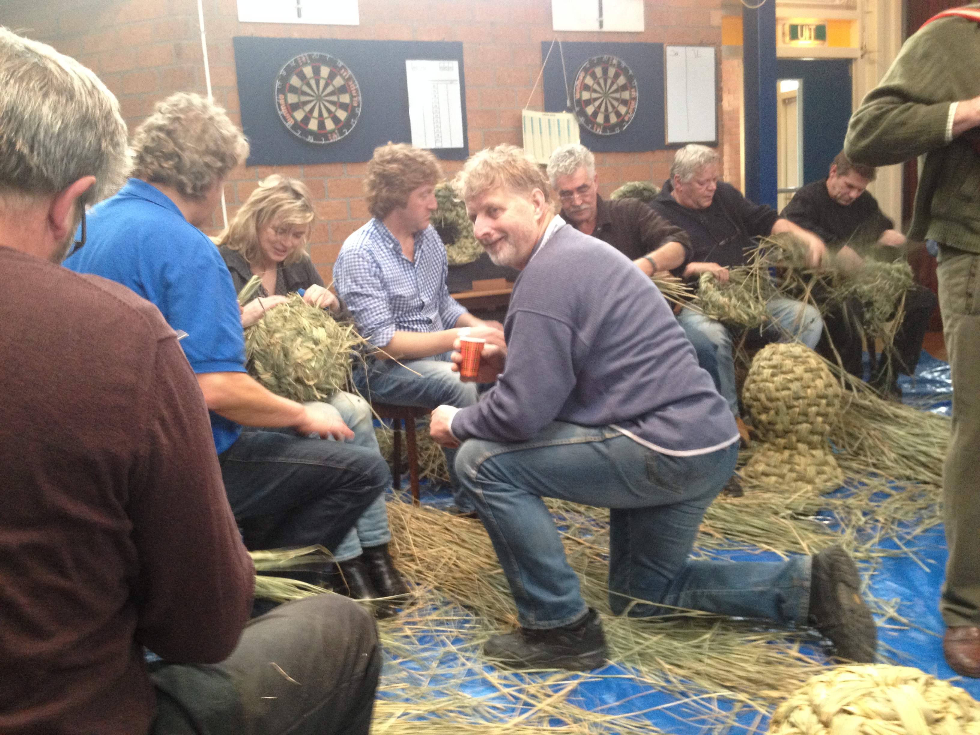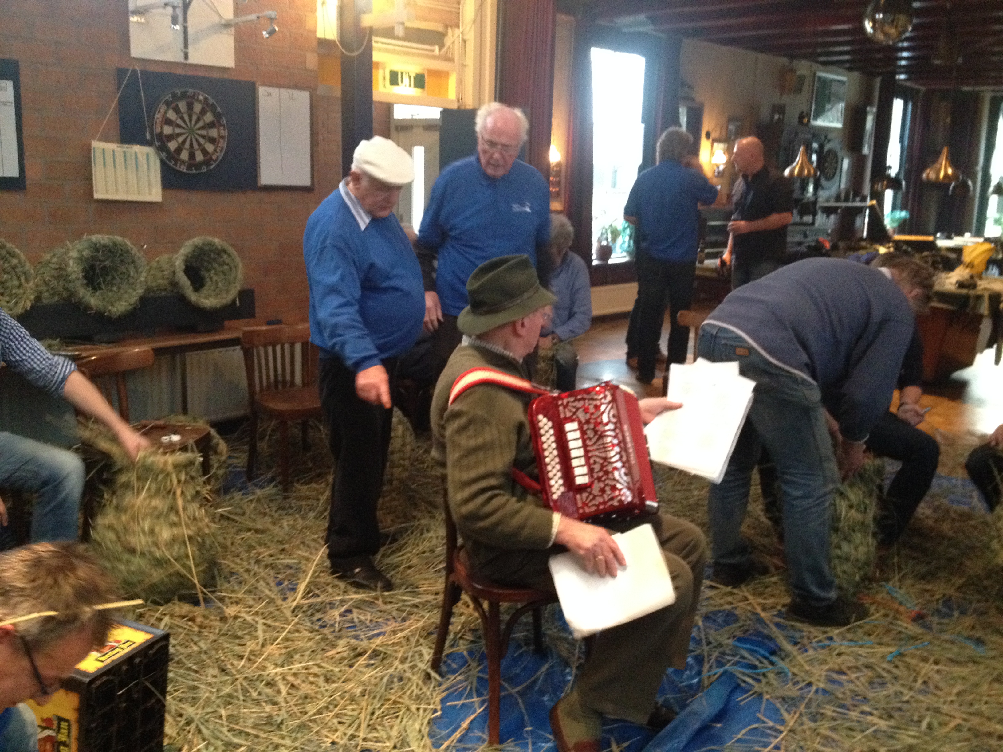 Het enthousiasme was groot. In de achterzaal van het dorpshuis waren zeilen neergelegd, een rondje stoelen erop en iedereen kreeg een bos riet en een vlechthaak. De twee deskundigen legden alles in het kort en onvervalst fries uit en het werk kon beginnen. Het was het begin van 3 uur bloed, zweet en plezier. Voor musicale verstrooiing was gezorgd. In het midden stond iemand met een harmonika die bekende liedjes speelde, die bij tijd en wijlen luidkeels werden meegezongen door mijn buurman. We werden onderwijl verzorgd met broodjes en flesjes bier die er in gingen als koek. Aan het eind van de rit zag de zaal er heel anders uit. De vloer dikbelegd met riet, een enorme stapel korven in diverse vormen en maten, en veel tevreden mensen aan het bier.