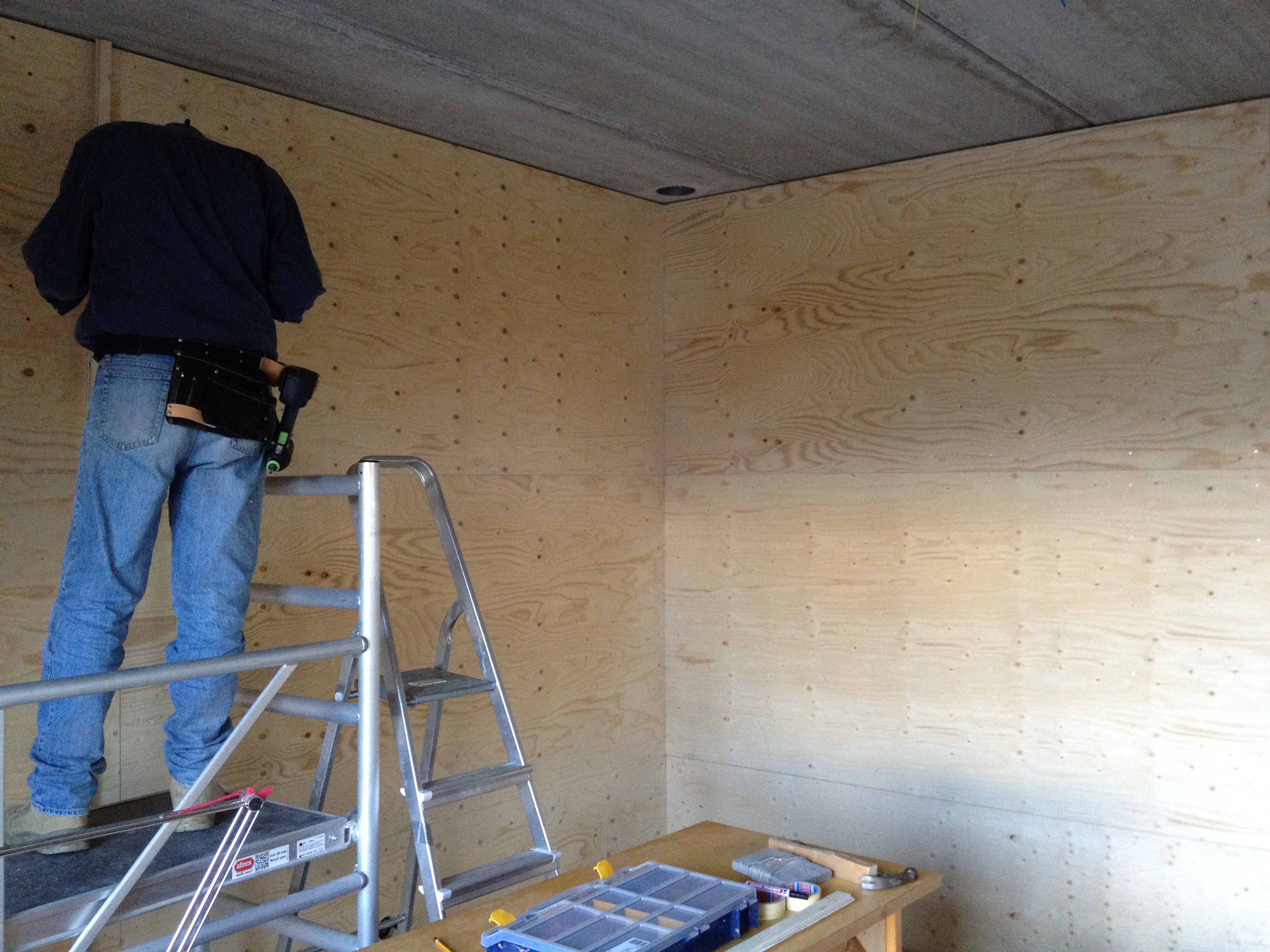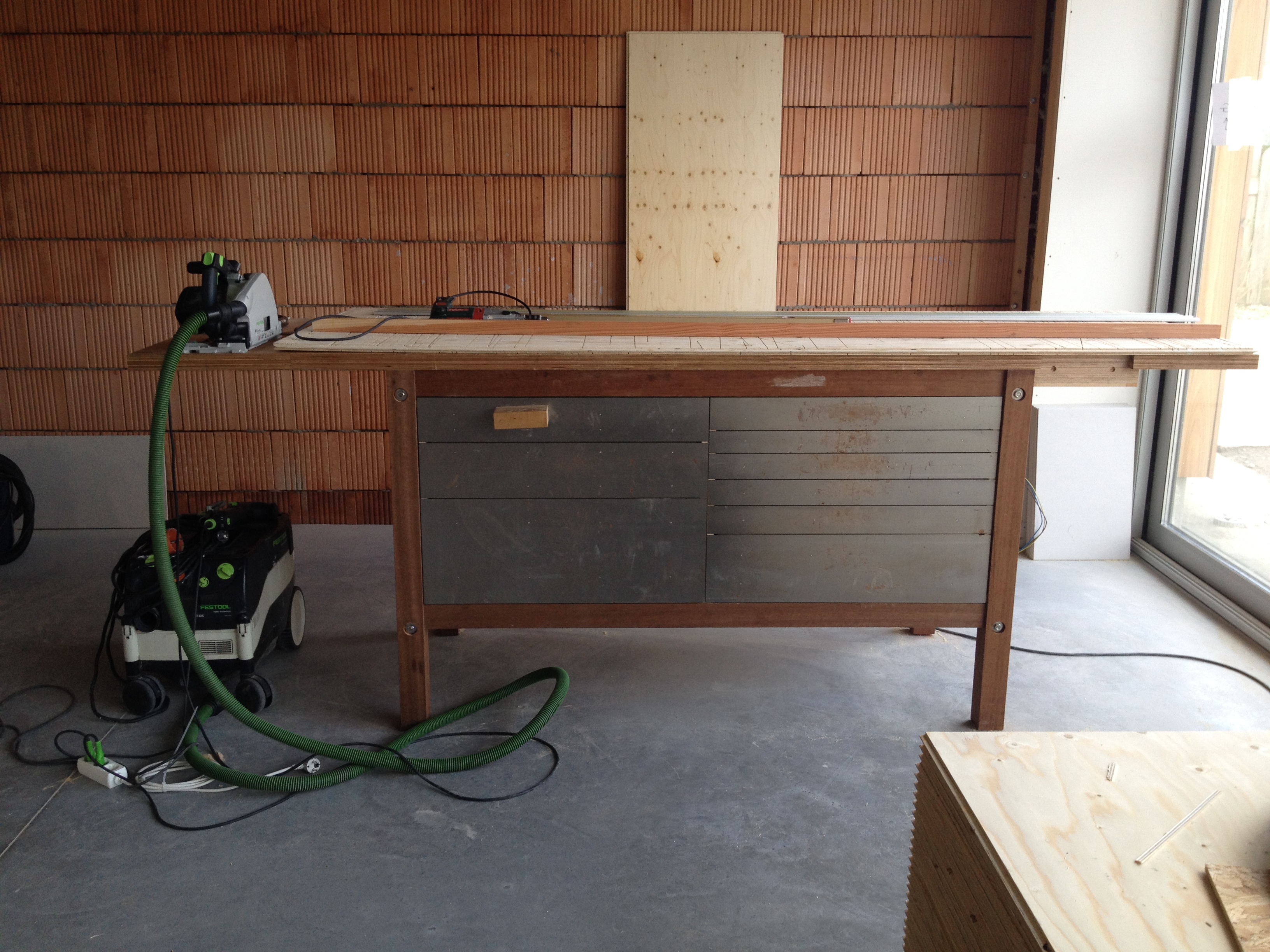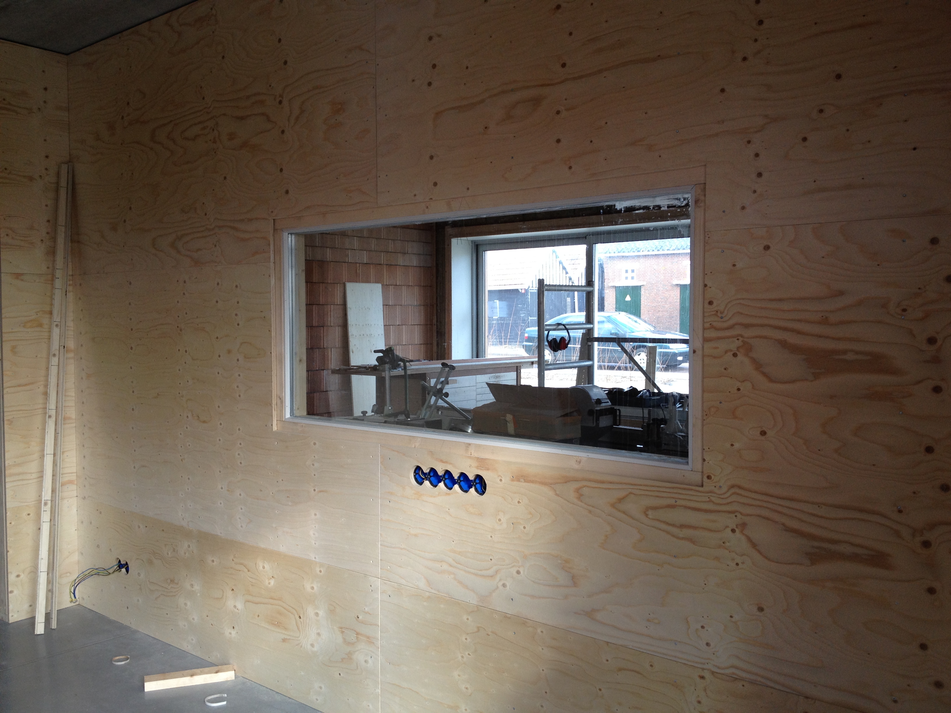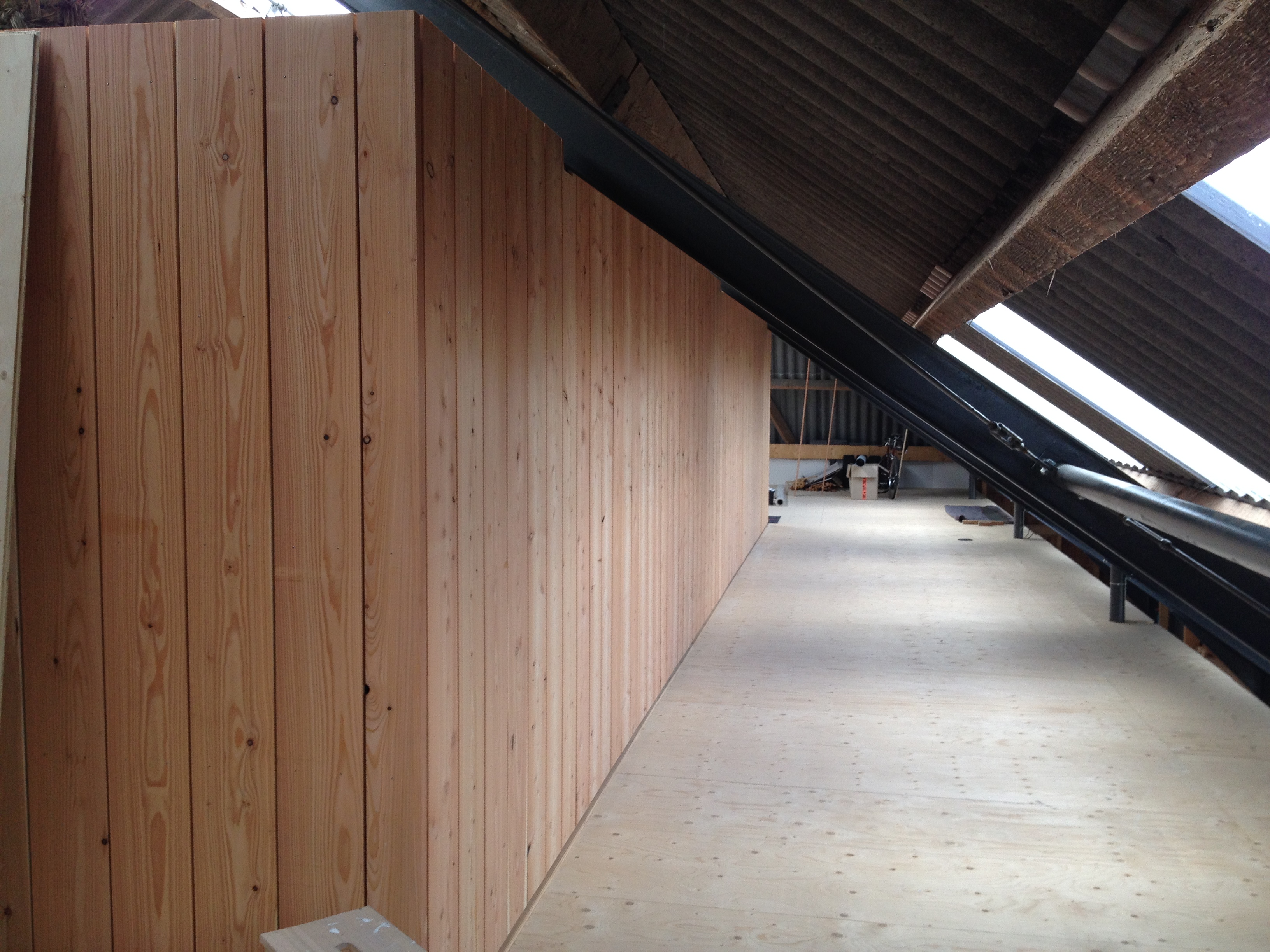 Tja de grote gebeurtenissen blijven een beetje uit. Op het moment is het een kwestie van gestaag doorwerken. Jan is bezig met het bekleden van de wanden van de twee werkplaatsen en ik heb me de laatste twee weekenden verschanst op de overloop om de buitenkant van de eerste verdieping van larix te voorzien. We leefden in twee verschillende werelden. Buiten stormde het bij tijd en wijlen behoorlijk en de wind huilde en bulderde daar boven om mijn hoofd, terwijl het beneden warm en stil was afgezien van een regelmatig jankende zaagmachine.