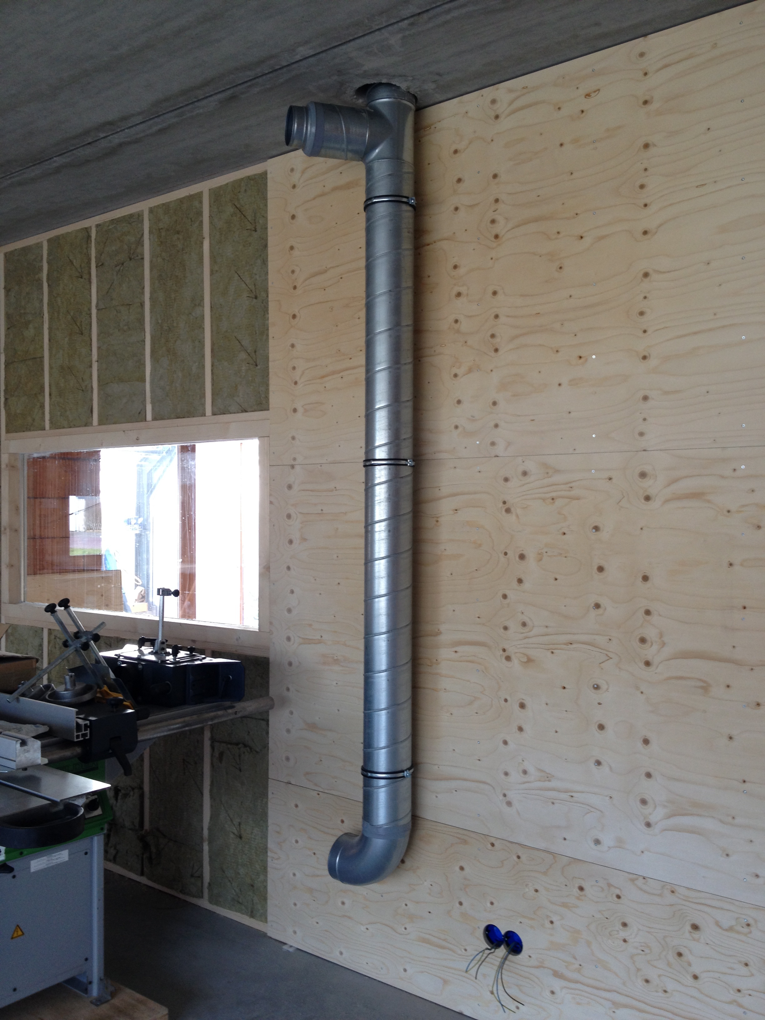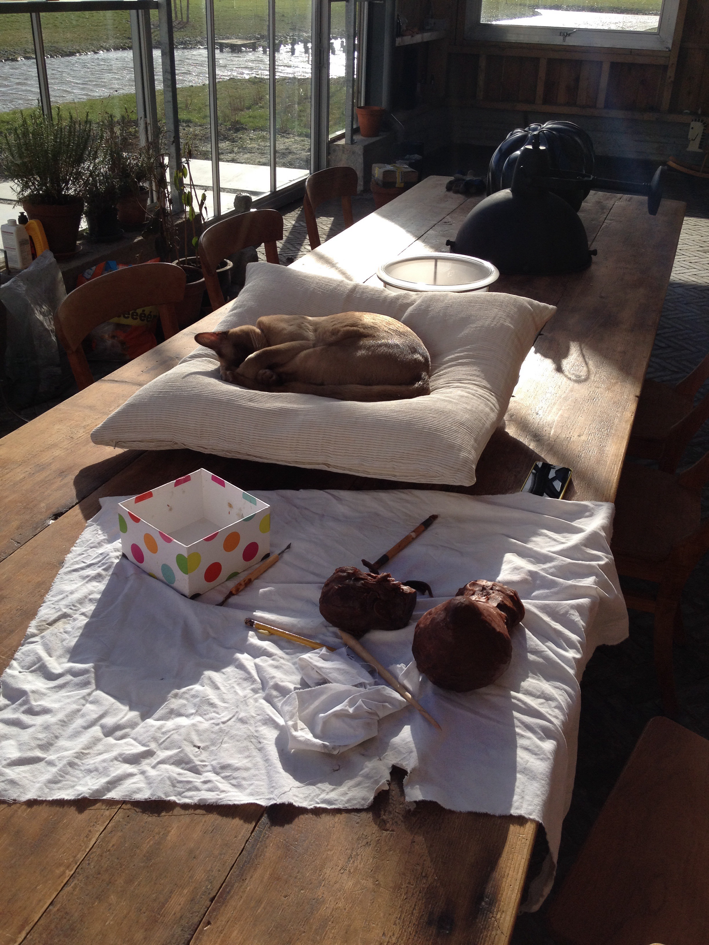 Inmiddels zijn ook alle compressorleidingen en afzuigpijpen aangelegd met behulp van Douwe. Het raam zit erin tussen het atelier en de werkplaats, en de werkbank is verhuisd van Amsterdam naar Rien. De poezen zijn zo langzamerhand geheel ingeburgerd en de nieuwe slaapkamer wordt steeds gezelliger.