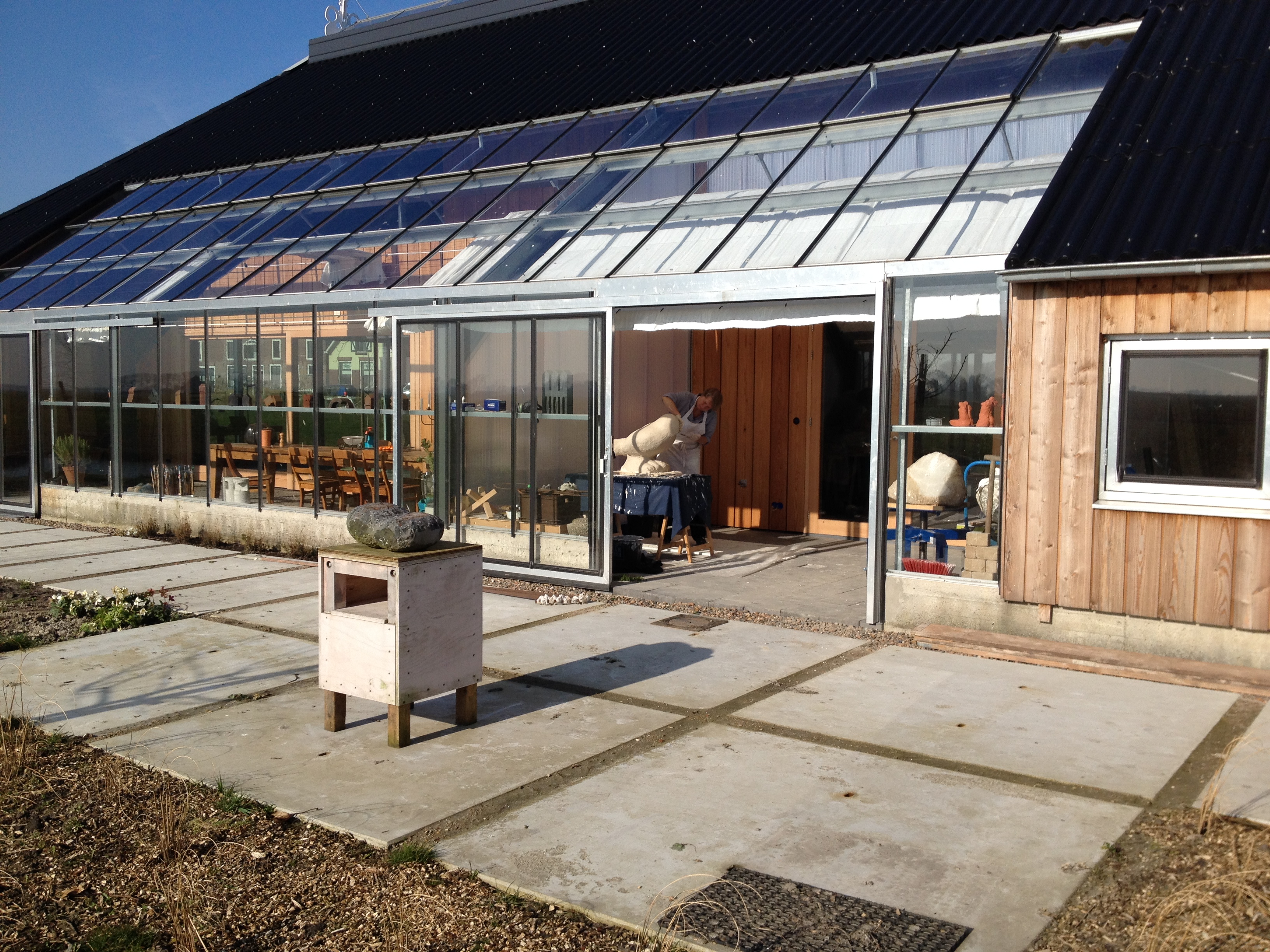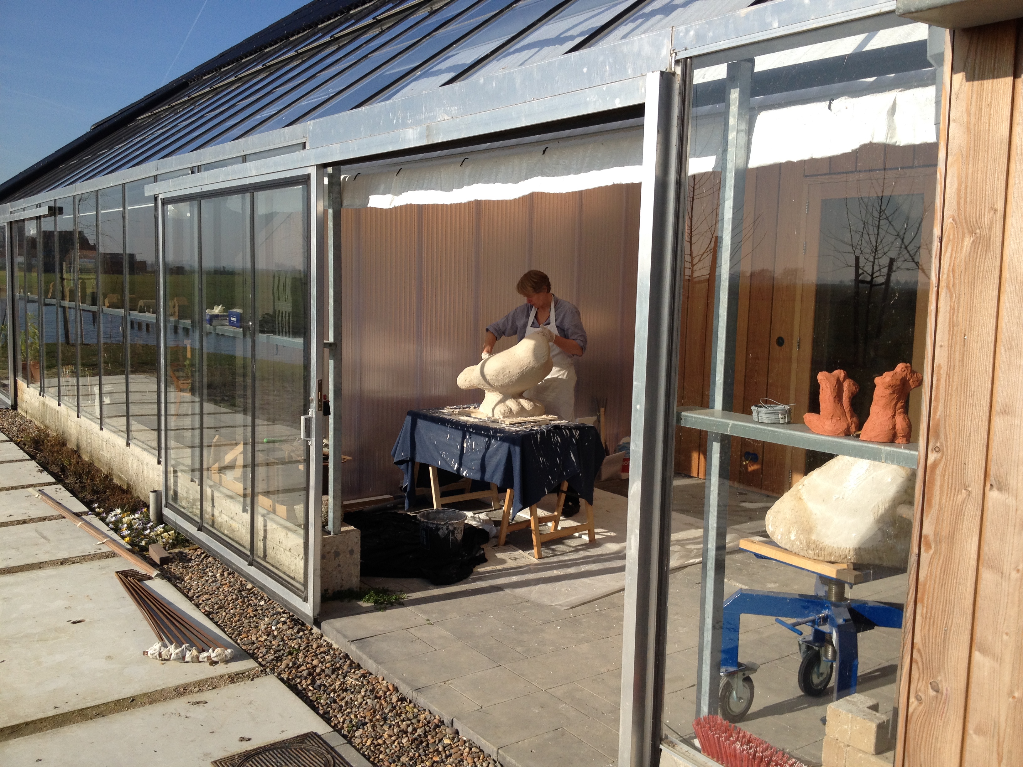 Het atelier is geheel goedgekeurd. Met de deuren open en de zonwering dicht is het goed toeven. Heerlijk kliederen met gips. In het zicht van iedereen die de hond uitlaat of langsfietst, dus regelmatig aanloop van nieuwsgierige dorpsgenoten.