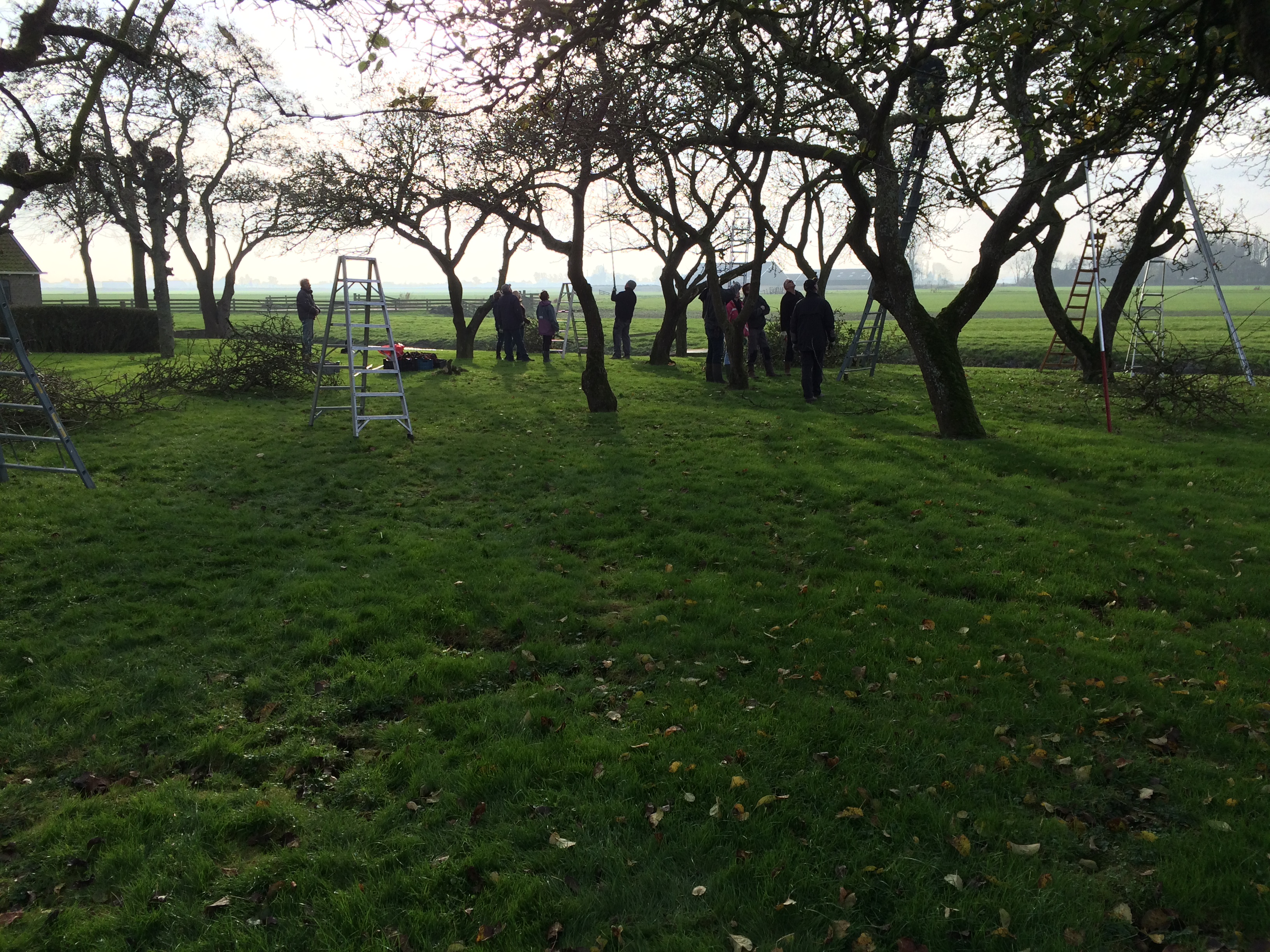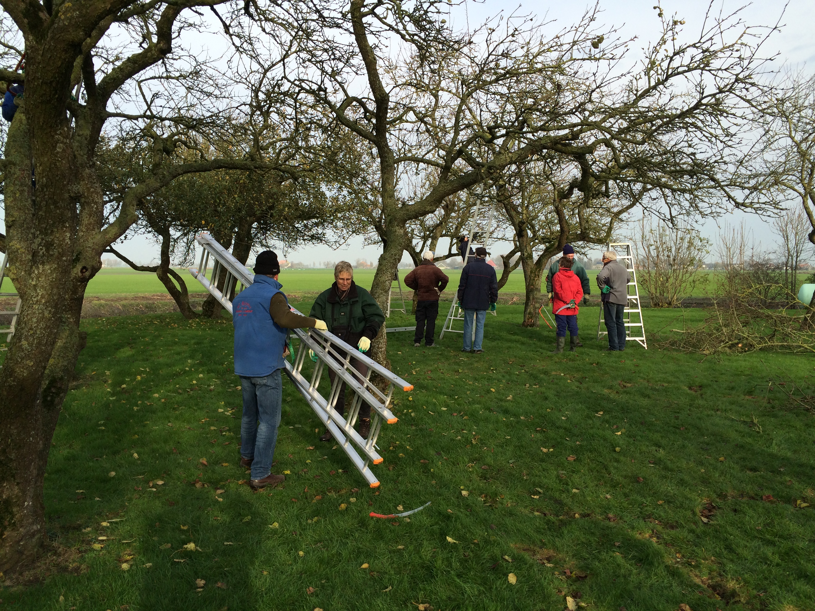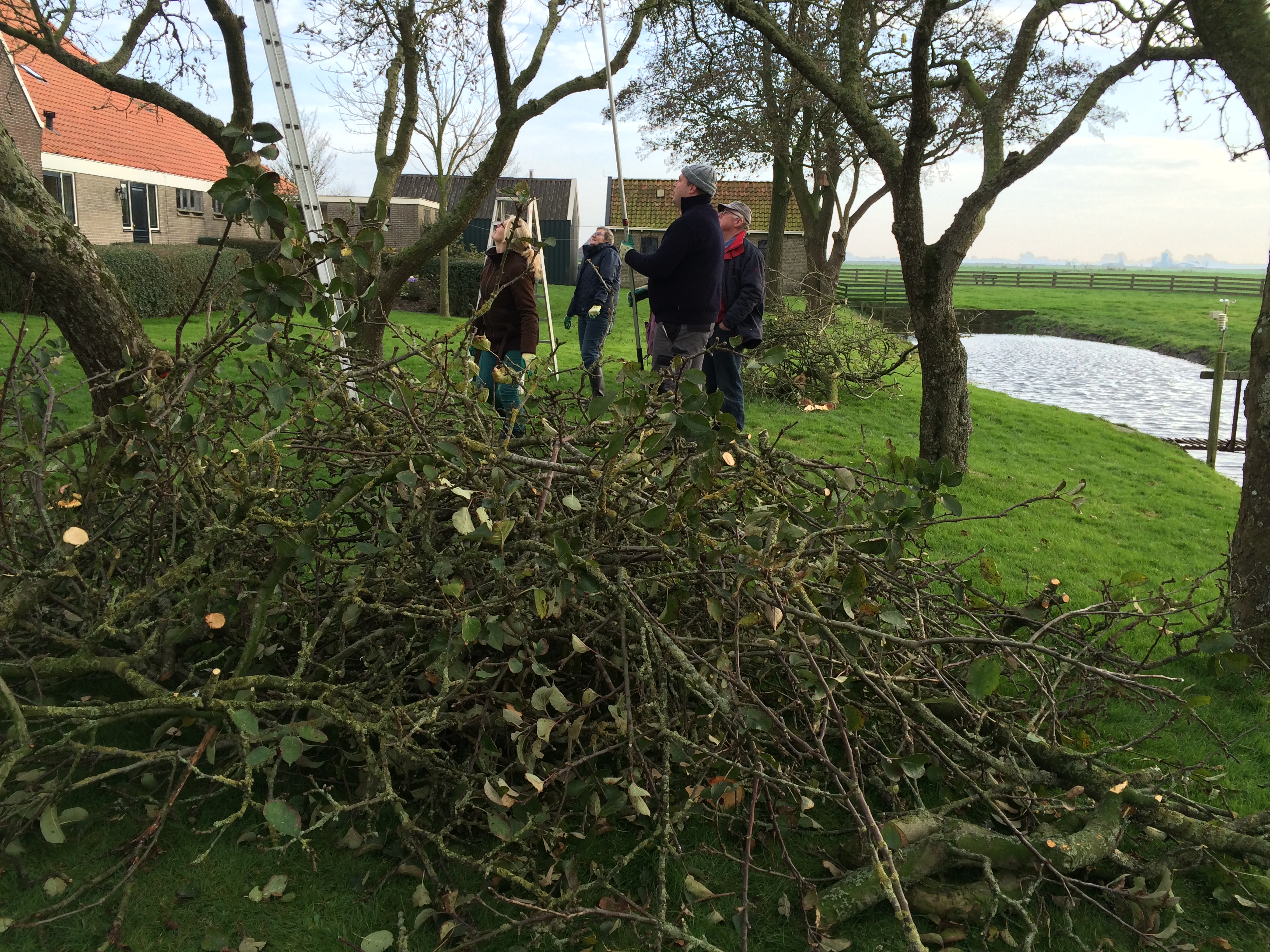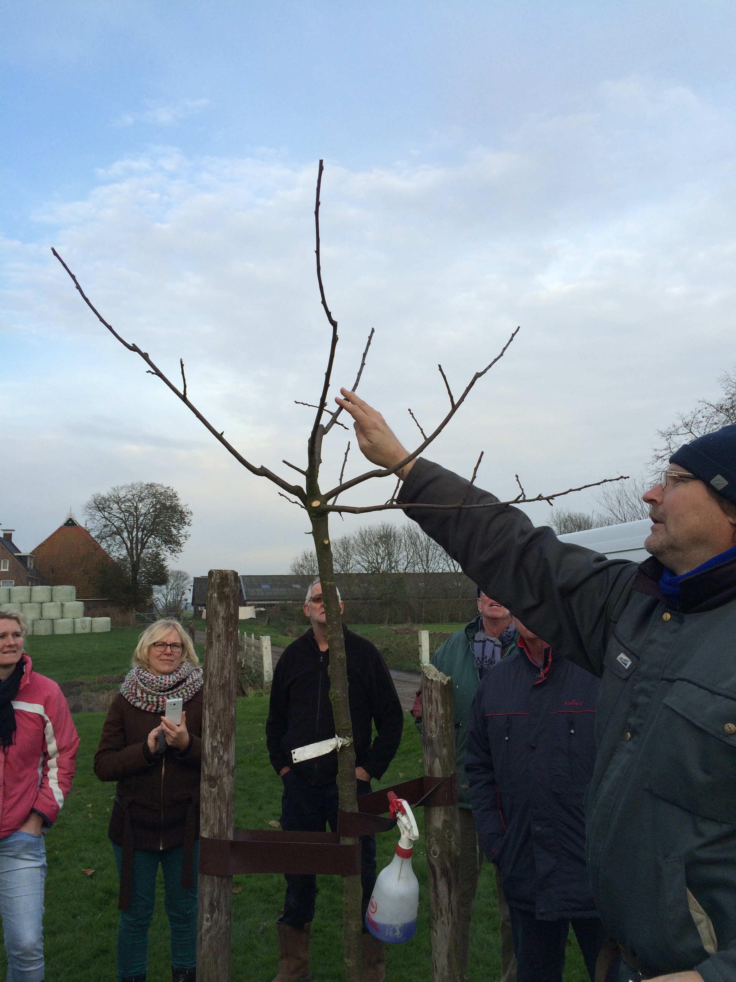 De zaterdag daarop was de praktijkdag. Een boer uit de omgeving had zijn boomgaard ter beschikking gesteld. Ca 15 bomen die achterstallig onderhoud hadden en allemaal een meter of 6-7 hoog waren. Er was een aanhangwagen vol gereedschap aangerukt, en gewapend met boomzagen, snoeischaren, tuinhandschoenen, ladders en trappen werden we de boomgaard ingestuurd. In groepjes van 5 namen we de bomen onderhanden. Eerst discussieren over welke takken eruit moesten en waarom, en dan de ladder op. Het was snoeikoud en na 3 uur werden we verwarmd in de schuur met een heerlijke ouderwetse kop groentesoep met veel ballen. Na de lunch had iedereen al wel een beetje de slag te pakken en toen we vertrokken zag het er toch al heel wat beter uit. Daarna naar een plantsoen in Rien waar boompjes van 1 jaar stonden, dus het contrast kon niet groter zijn. We gingen naar huis in de overtuiging dat we nu wisten hoe het in elkaar zat.
