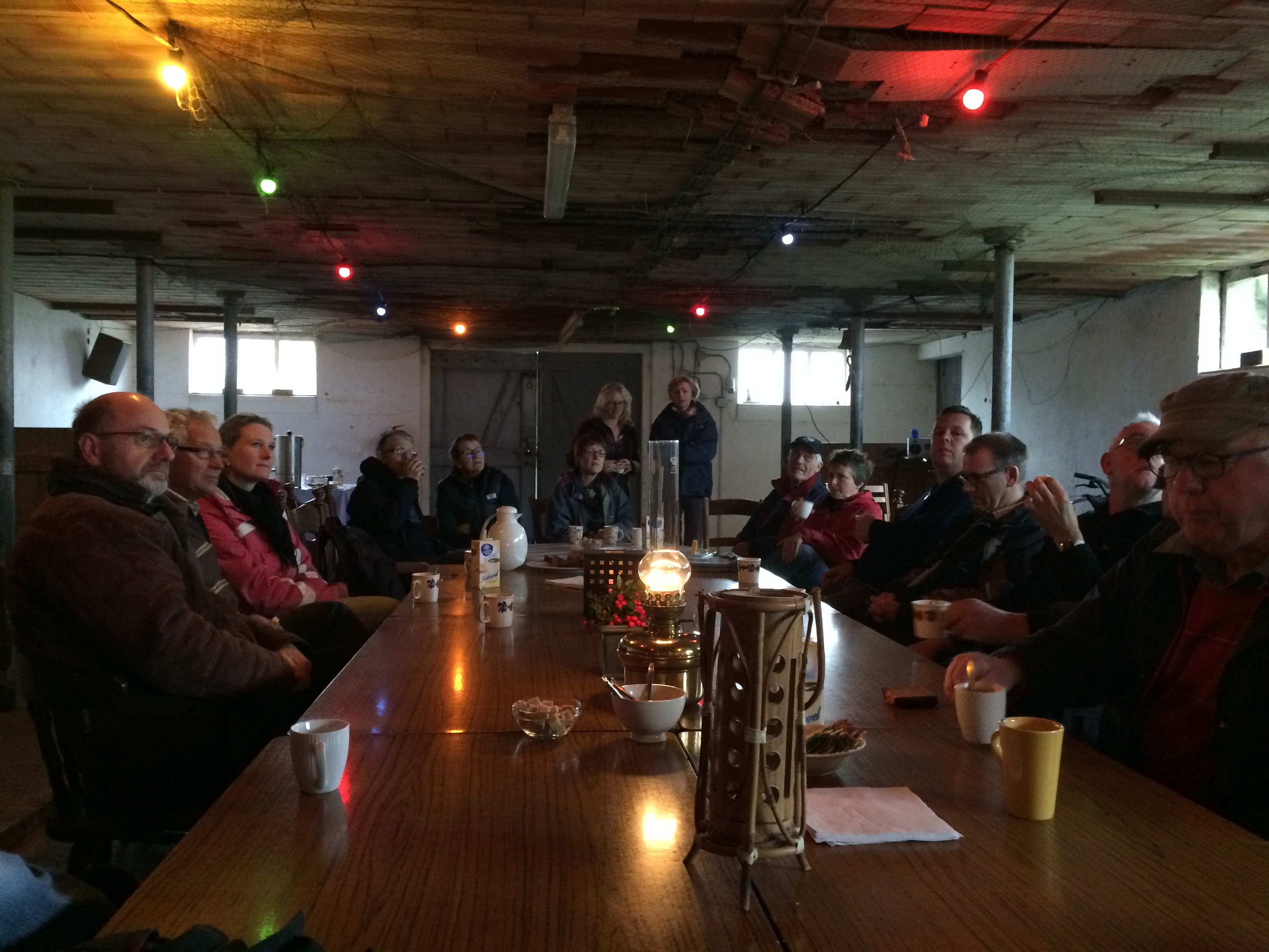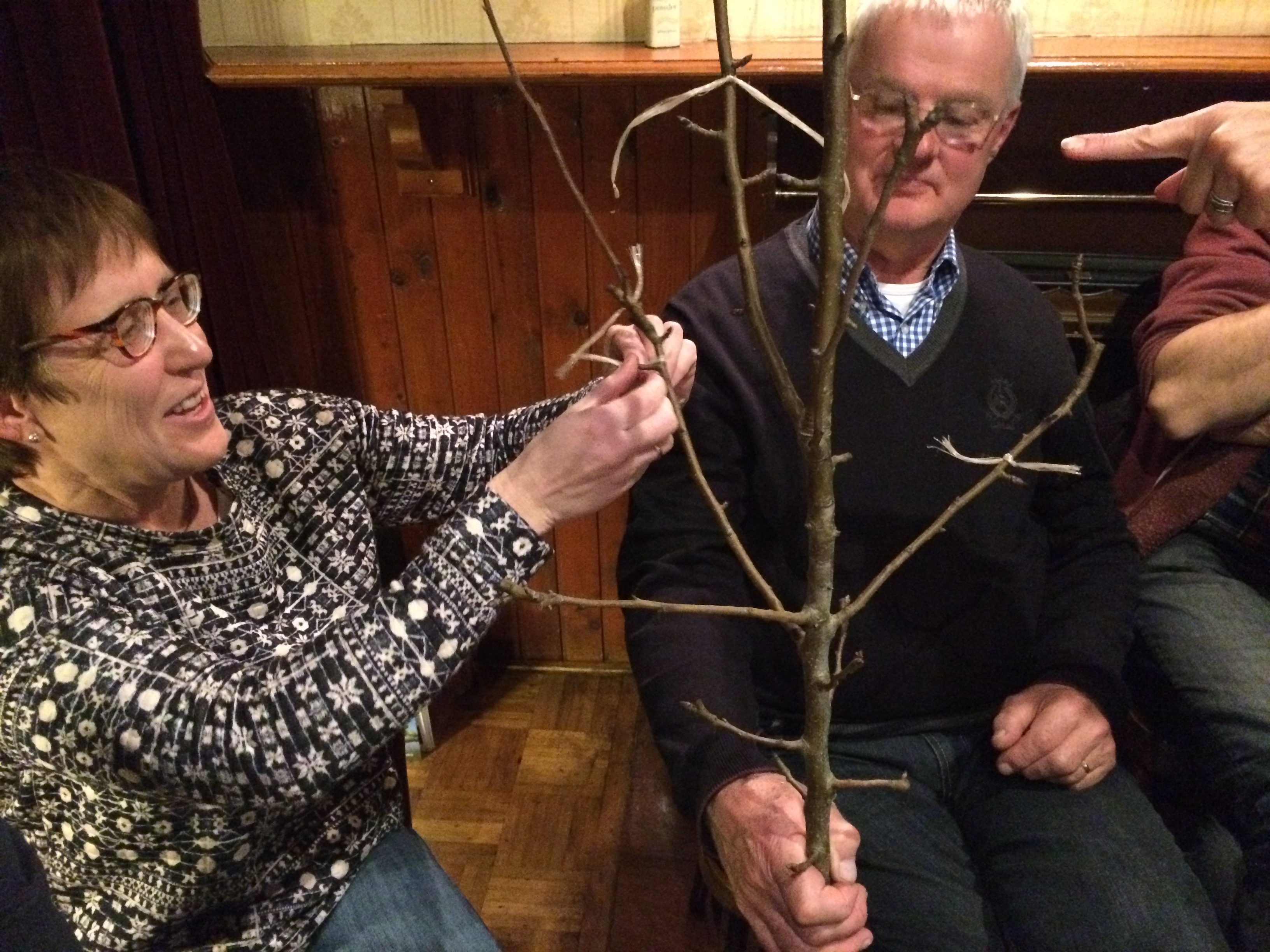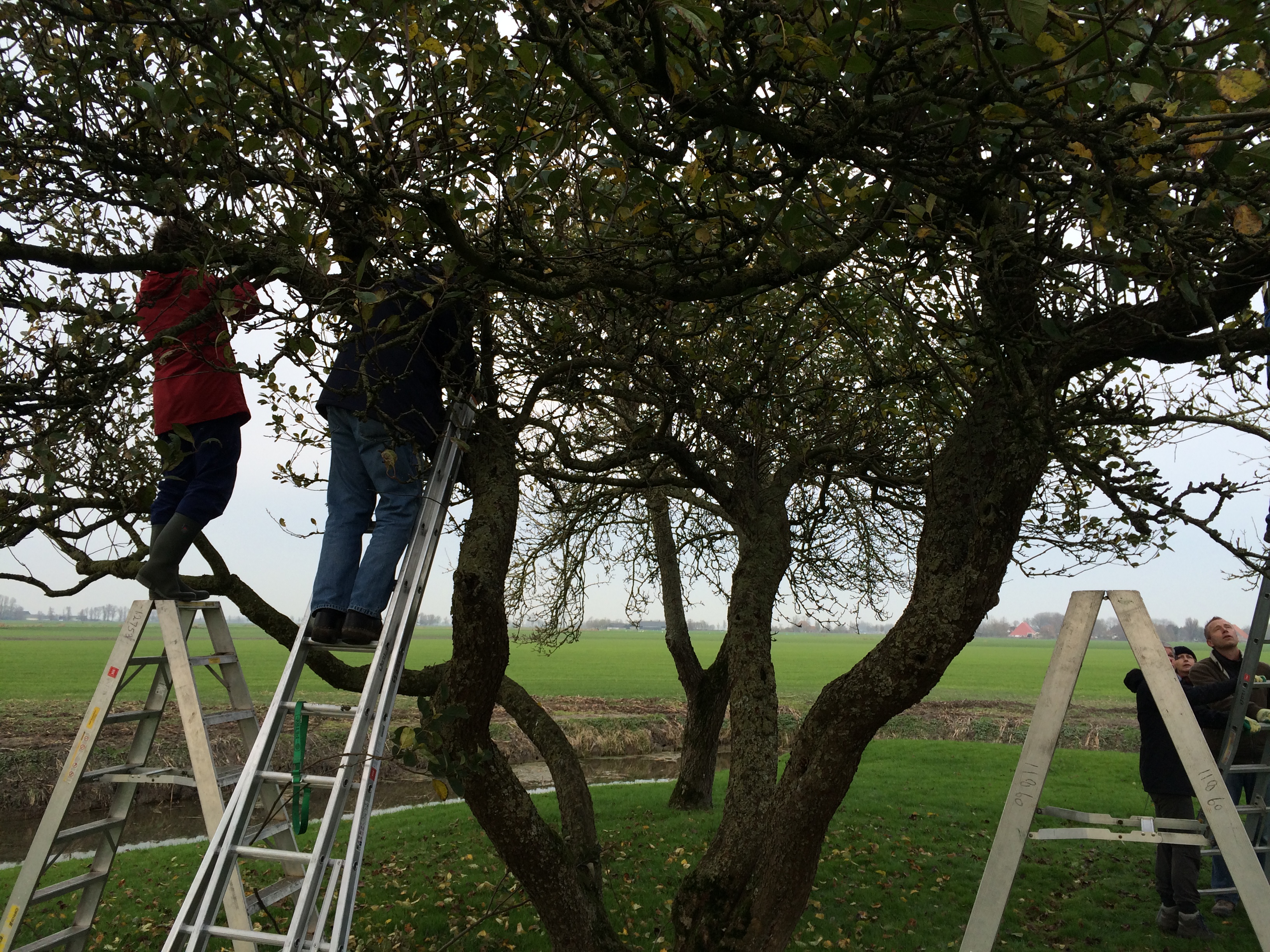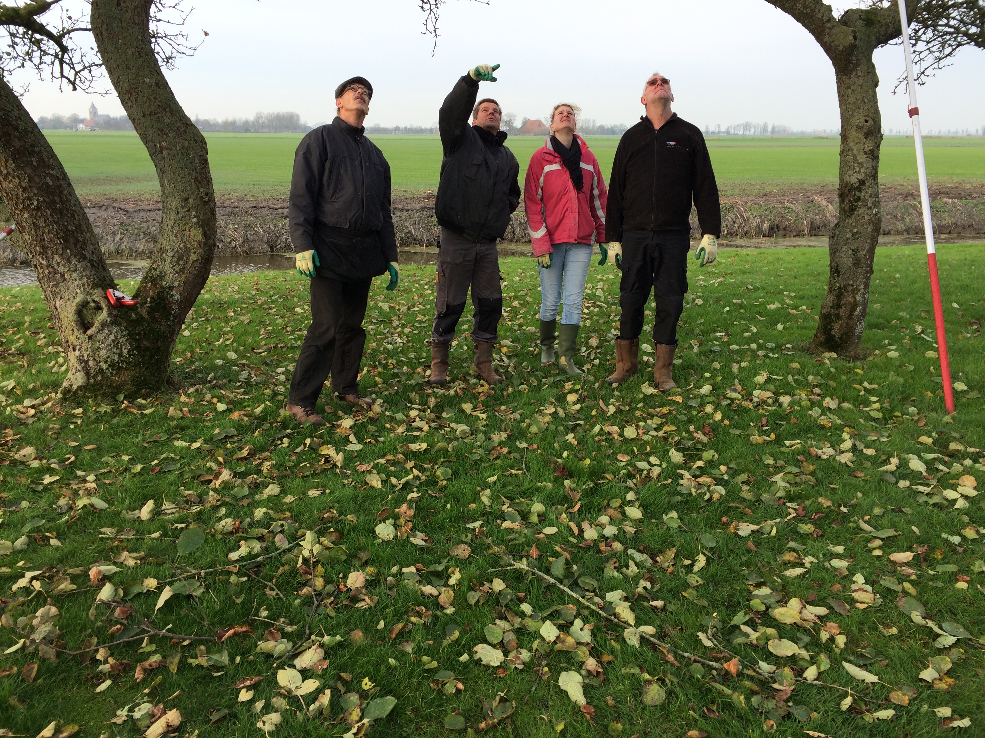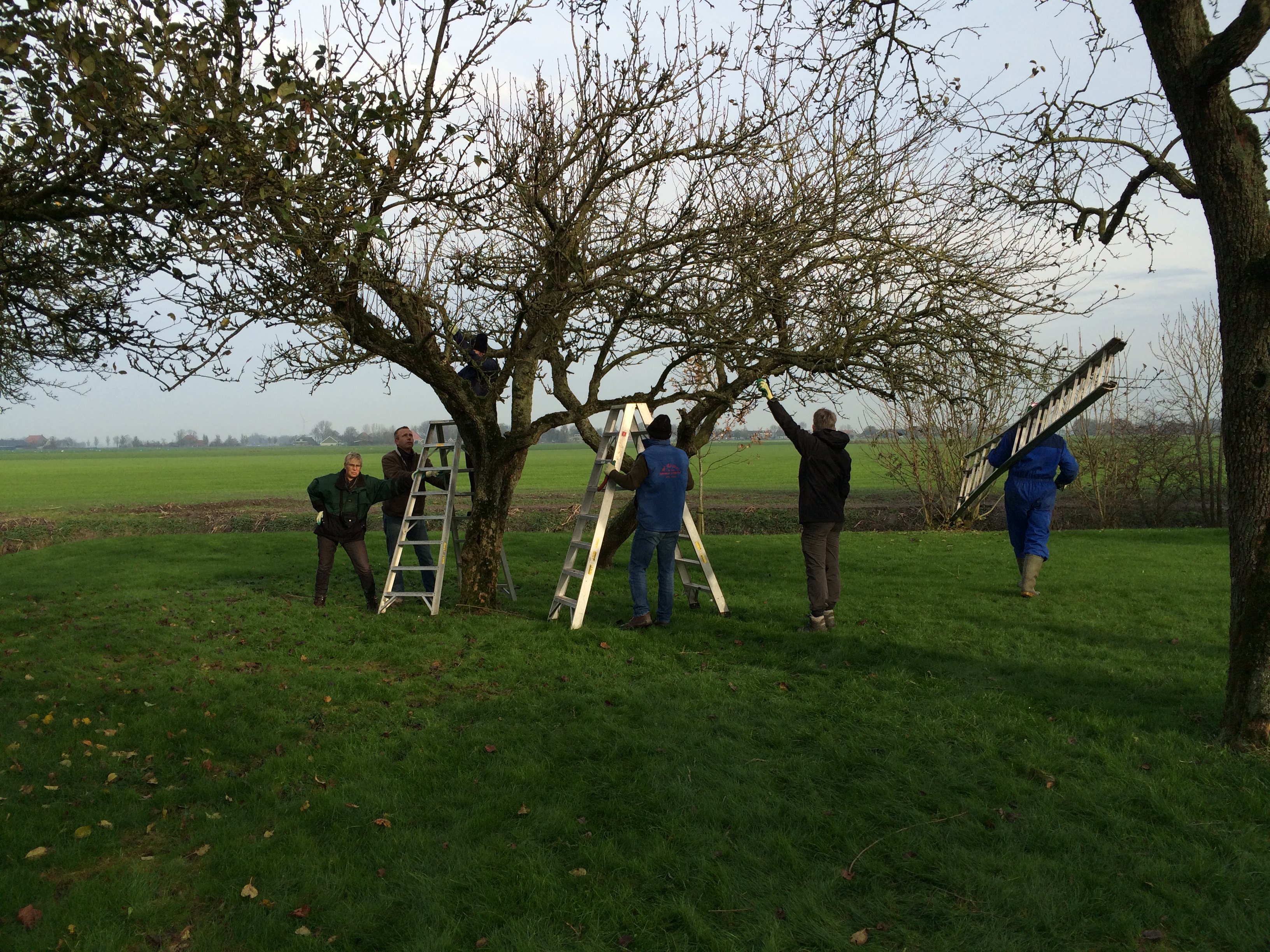 De zaterdag daarop was de praktijkdag. Een boer uit de omgeving had zijn boomgaard ter beschikking gesteld. Ca 15 bomen die achterstallig onderhoud hadden en allemaal een meter of 6-7 hoog waren. Er was een aanhangwagen vol gereedschap aangerukt, en gewapend met boomzagen, snoeischaren, tuinhandschoenen, ladders en trappen werden we de boomgaard ingestuurd. In groepjes van 5 namen we de bomen onderhanden. Eerst discussieren over welke takken eruit moesten en waarom, en dan de ladder op. Het was snoeikoud en na 3 uur werden we verwarmd in de schuur met een heerlijke ouderwetse kop groentesoep met veel ballen. Na de lunch had iedereen al wel een beetje de slag te pakken en toen we vertrokken zag het er toch al heel wat beter uit. Daarna naar een plantsoen in Rien waar boompjes van 1 jaar stonden, dus het contrast kon niet groter zijn. We gingen naar huis in de overtuiging dat we nu wisten hoe het in elkaar zat.