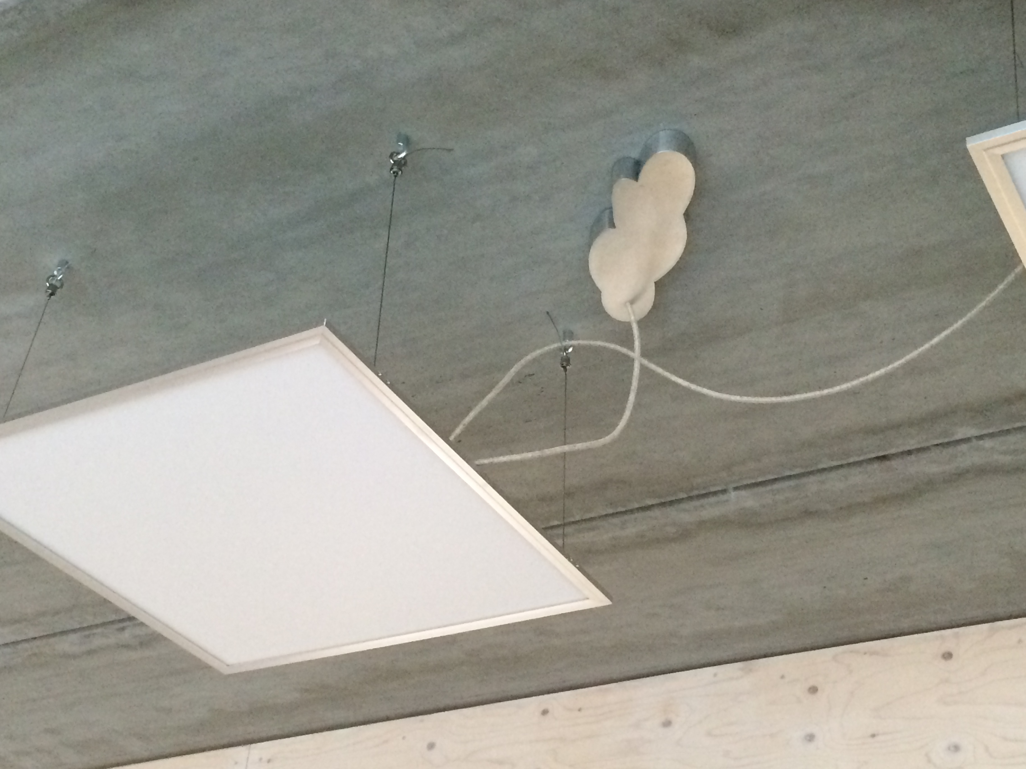Hier binnen is het behaaglijk. Intussen zijn alle deuren (9) geplaatst, geschilderd en wel en alle sloten zitten erin. De verlichting in de werkplaatsen hangt, inclusief ‘custom made’ plafondplaatjes.