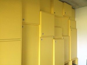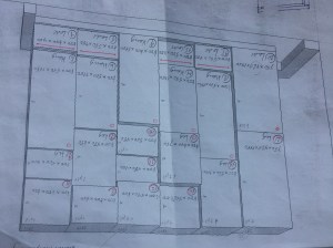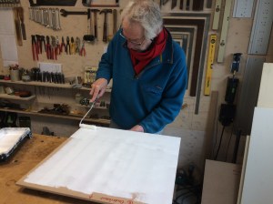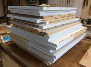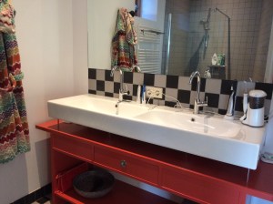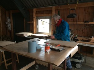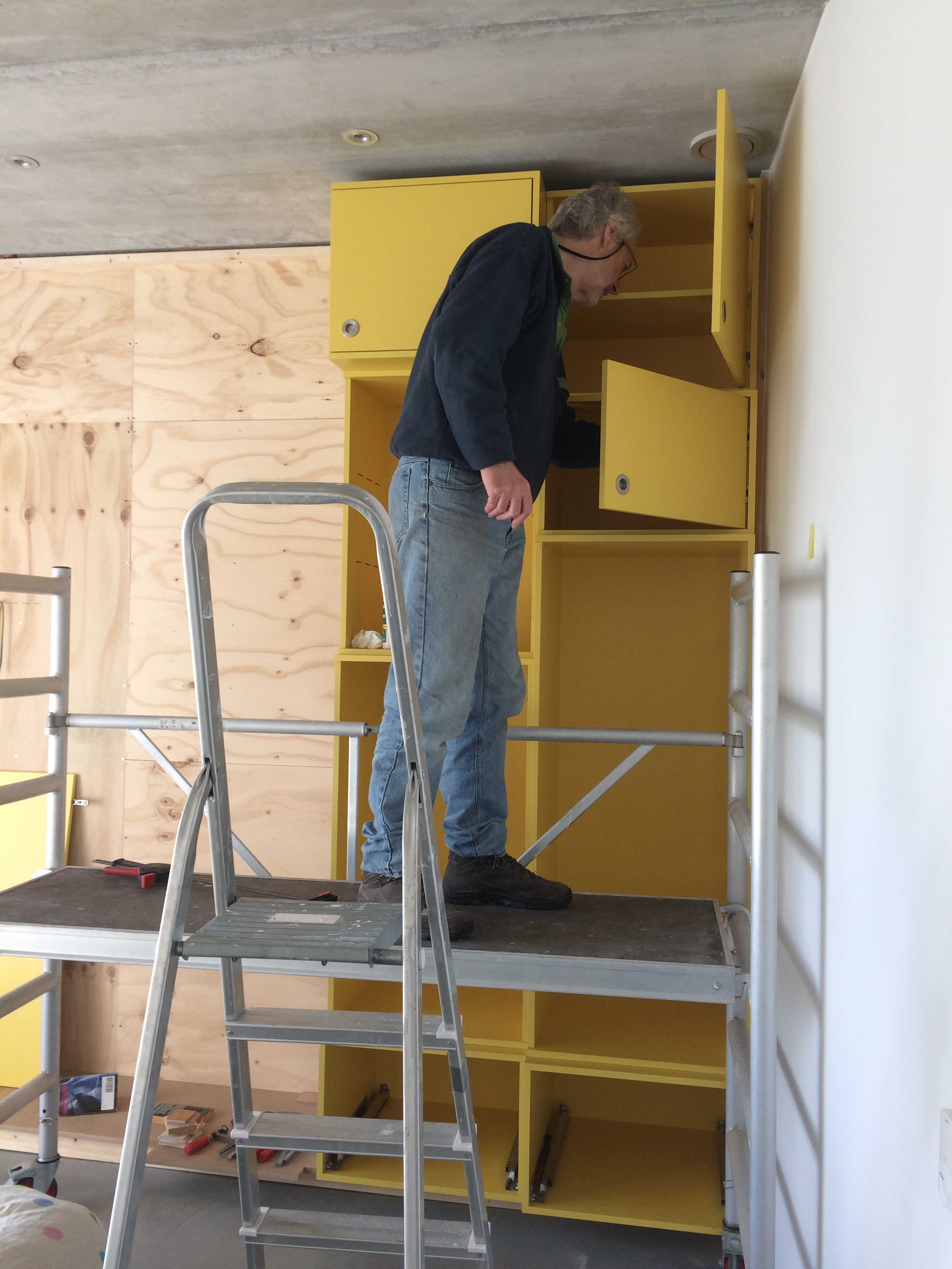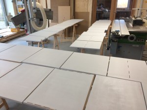 Nu nog binnenshuis: de badkamer is klaar. Verder heeft Jan zich het afgelopen half jaar met ijzeren discipline beziggehouden met de kastenwand in de slaapkamer. De tekening was al heel veel werk, de zaaglijst nog veel meer, maar dat was nog niks bij het daadwerkelijk bouwen ervan. De wand bestaat uit 21 kasten, allemaal verschillend van diepte en hoogte. Je kunt je voorstellen dat je daar je kop bij moet houden. Het waren zoveel volumes dat er maar een derde van in de werkplaats kon, en die is toch ruim bemeten. Het geheel moest ook nog geschilderd worden. Jan deed al het voorwerk (gronden, schuren, gronden) en ik mocht het (tweemaal) aflakken. 85 m2 en dat maal 4 is dus 340 m2. Bijna de oppervlakte van de hele woonschuur. Nu nog de lades en dan kan hij over niet al te lange tijd de slaapkamerdeur achter zich dichttrekken!