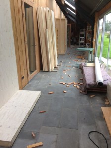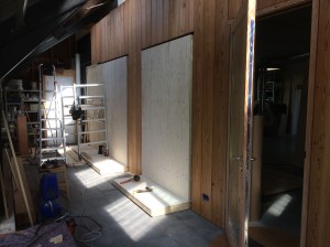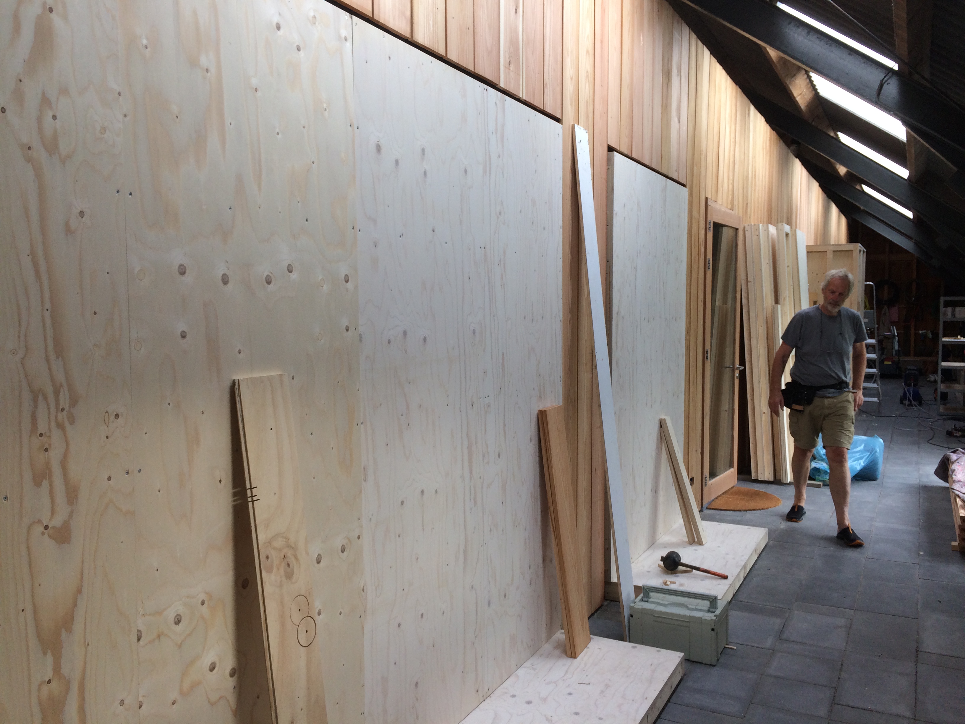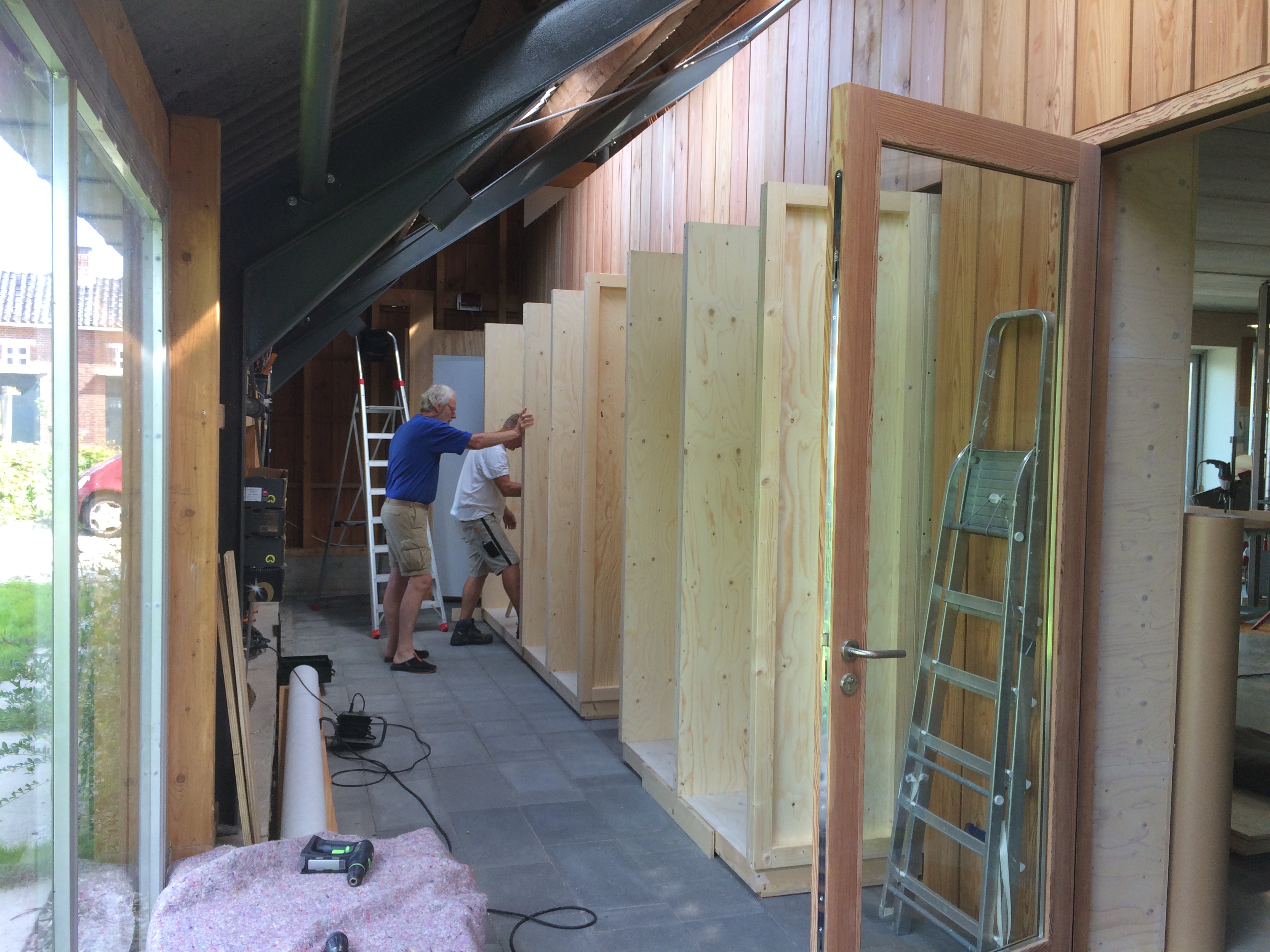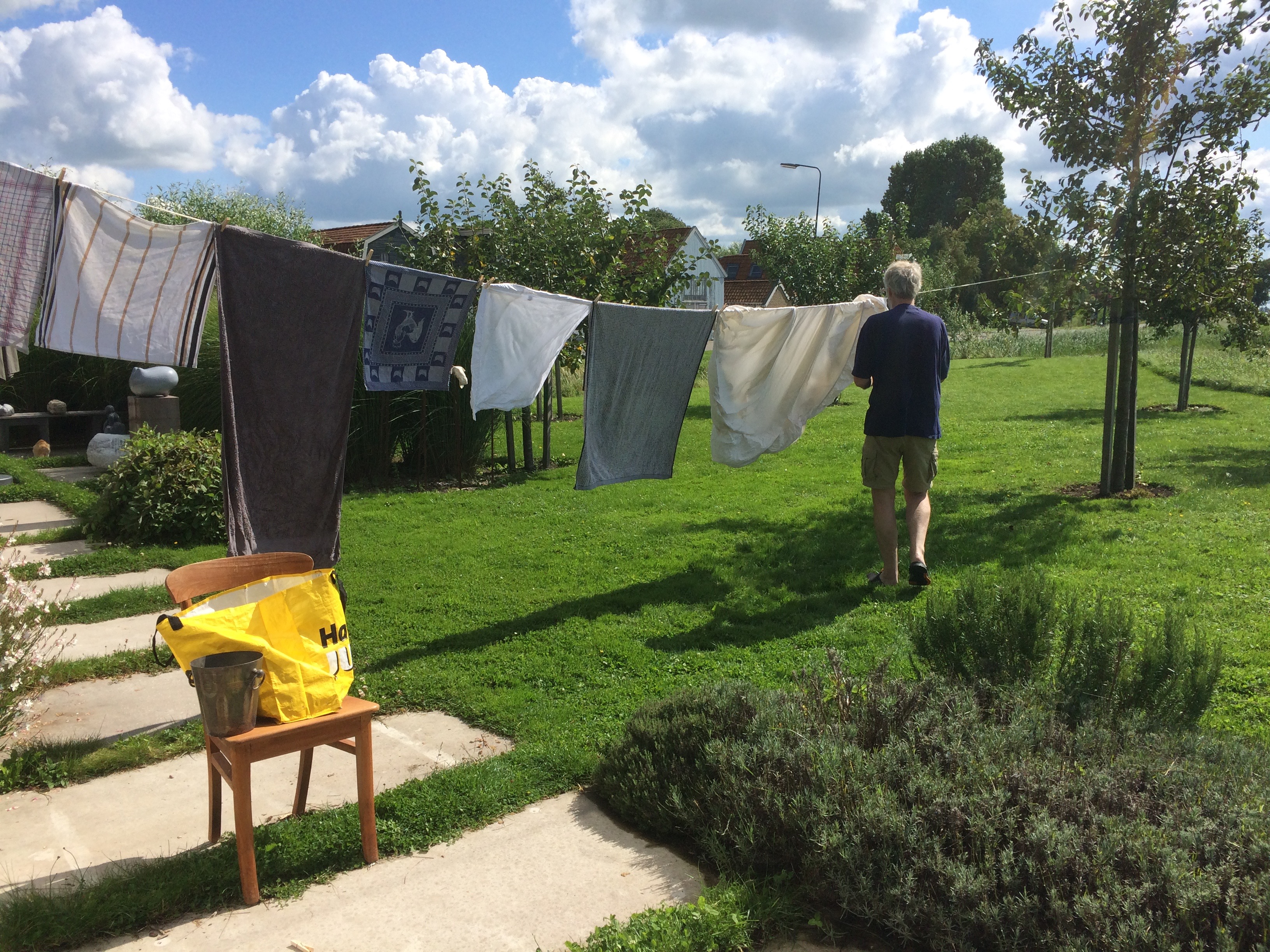 Het was zoals gewoonlijk een werkzame zomer. Jan had ernstig behoefte om iets grofstoffelijks doen na het gepuzzel met de slaapkamerkastenwand en heeft zich op de gang gestort. De keuken moest dus toch nog maar even wachten. Stoere kasten met prachtige (zware) opgeklampte deuren. Een zee van ruimte erbij. Ik hoop dat we genoeg spullen hebben om ze te vullen. Anders kunnen we ze altijd verhuren. Het punt is met zo’n groot huis dat je nooit maar één exemplaar ergens van kan maken. Eén kast is geen kast, dat moeten er gelijk 8 of meer worden. In een van die kasten staat nu de wasmachine, het eerste huishoudelijke apparaat wat het huis binnengedragen is. We hebben samen feestelijk ons eerste wasje buiten opgehangen tussen de appelbomen.