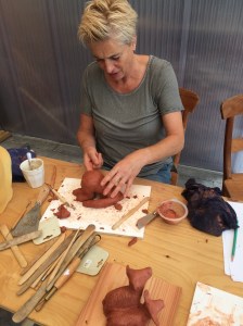 Intussen zat ik meer in mijn kamer boven dan in het atelier, maar toch zijn er een paar beelden bijgekomen en dikke stenen binnengedragen. Als grappig uitstapje heb ik zelfs kleiles gegeven aan twee dames uit het dorp.
