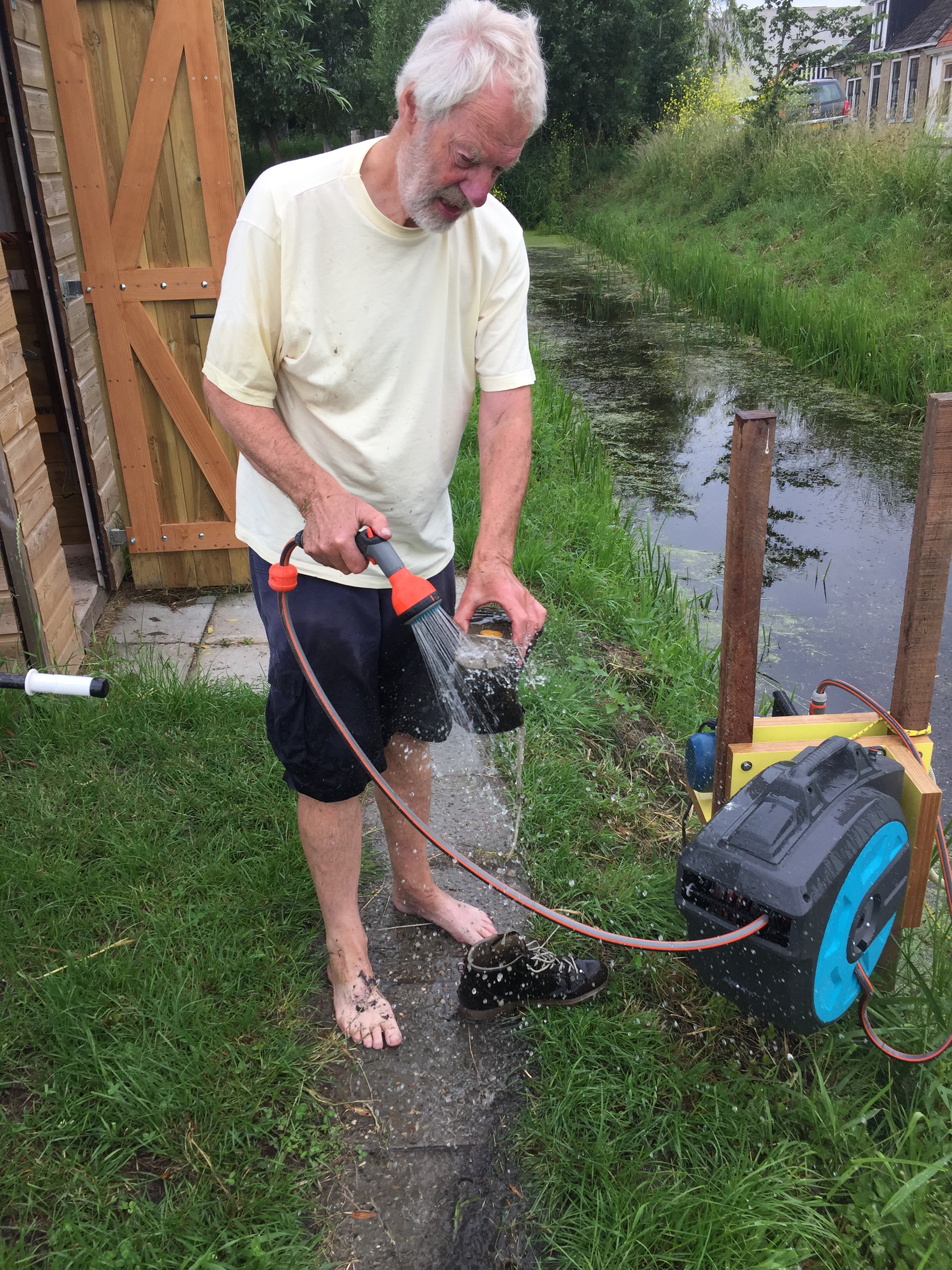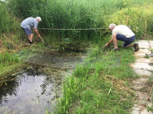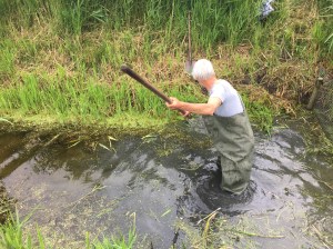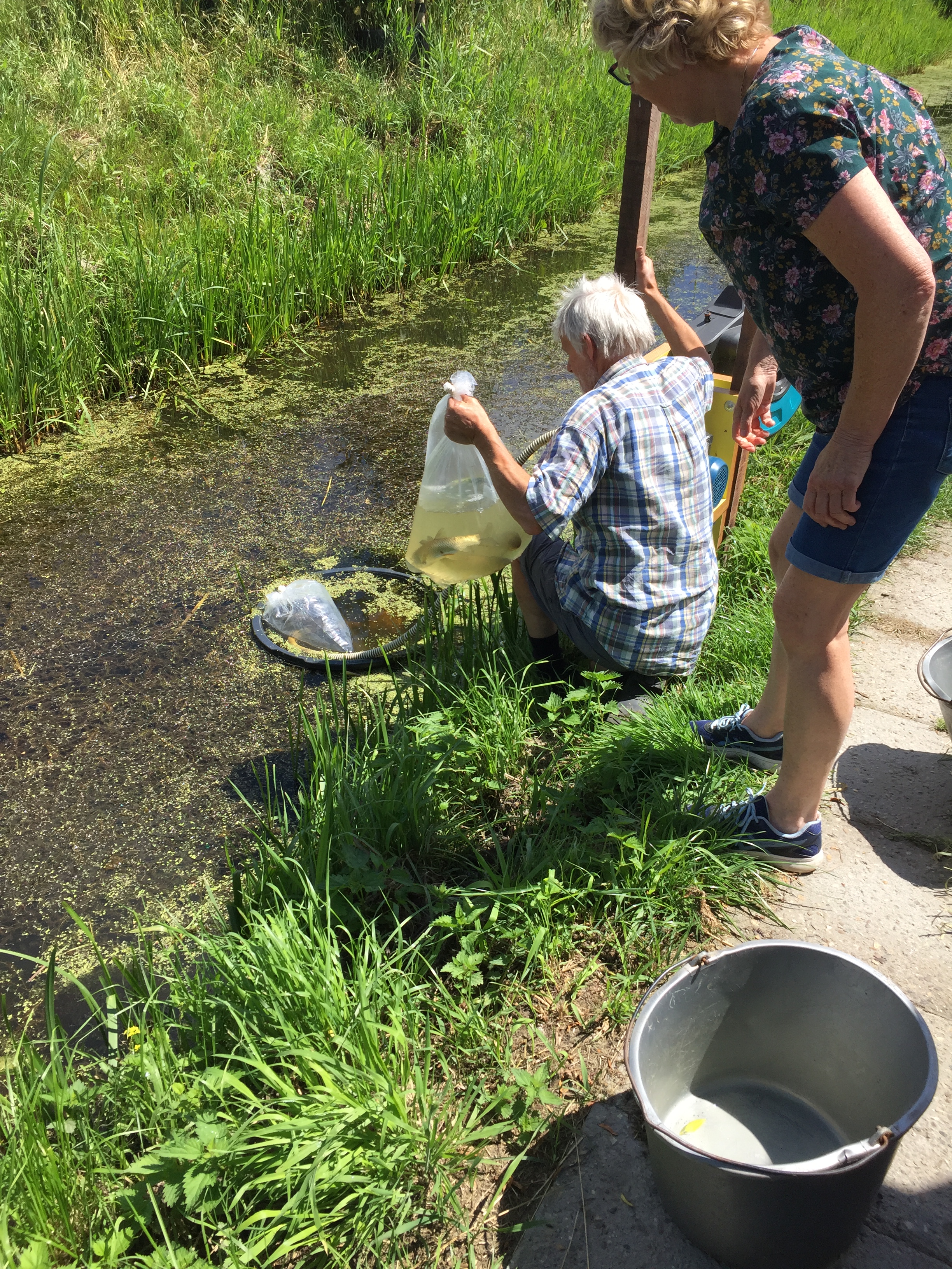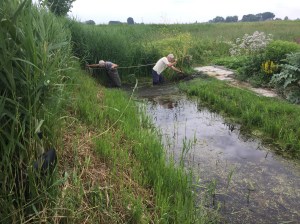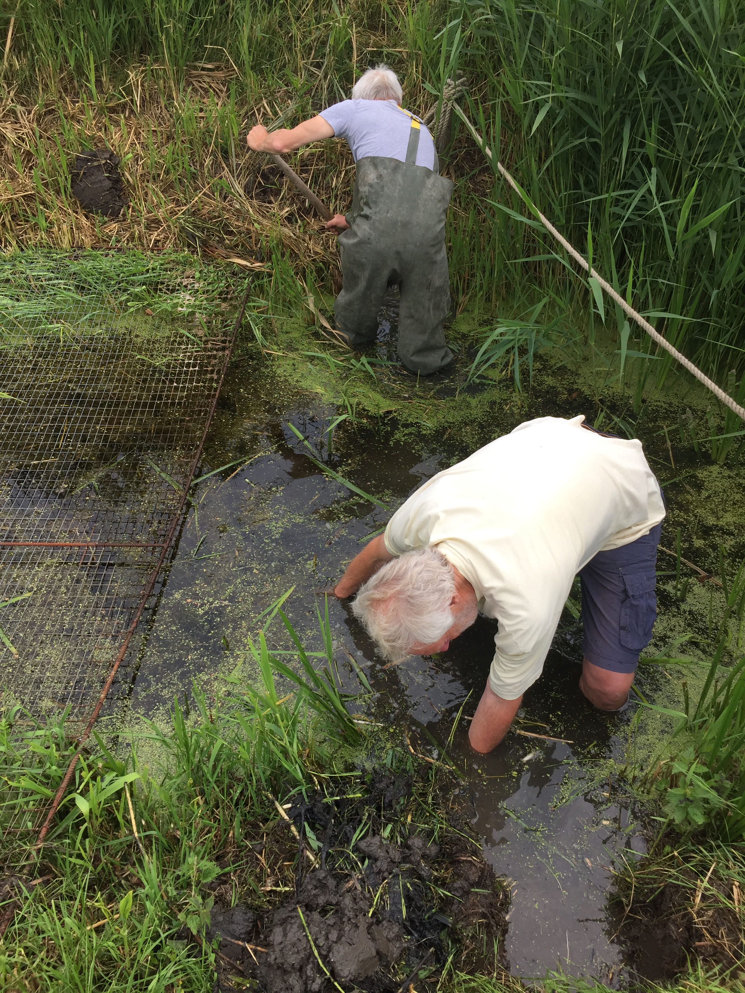 De sloot langs de moestuin werd uitgediept en een pompinstallatie werd aangelegd. Nou hebben sloten hier de neiging om helemaal dicht te groeien met riet, dus met behulp van Piet (de vader van Harmke) werd onze sloot elke week flink onder handen genomen. Met een soort zeis worden de waterplanten systematisch onder de waterspiegel afgesneden. Het schijnt dat als je dat maar vaak genoeg herhaald dat het riet het uiteindelijk opgeeft. Aan het eind van de sloot hebben Jan en Piet een hek ingegraven en vervolgens zijn er vijf graskarpers uitgezet als hulptroepen. Het is de bedoeling dat ze ons werk uit handen gaan nemen… We gaan het zien!