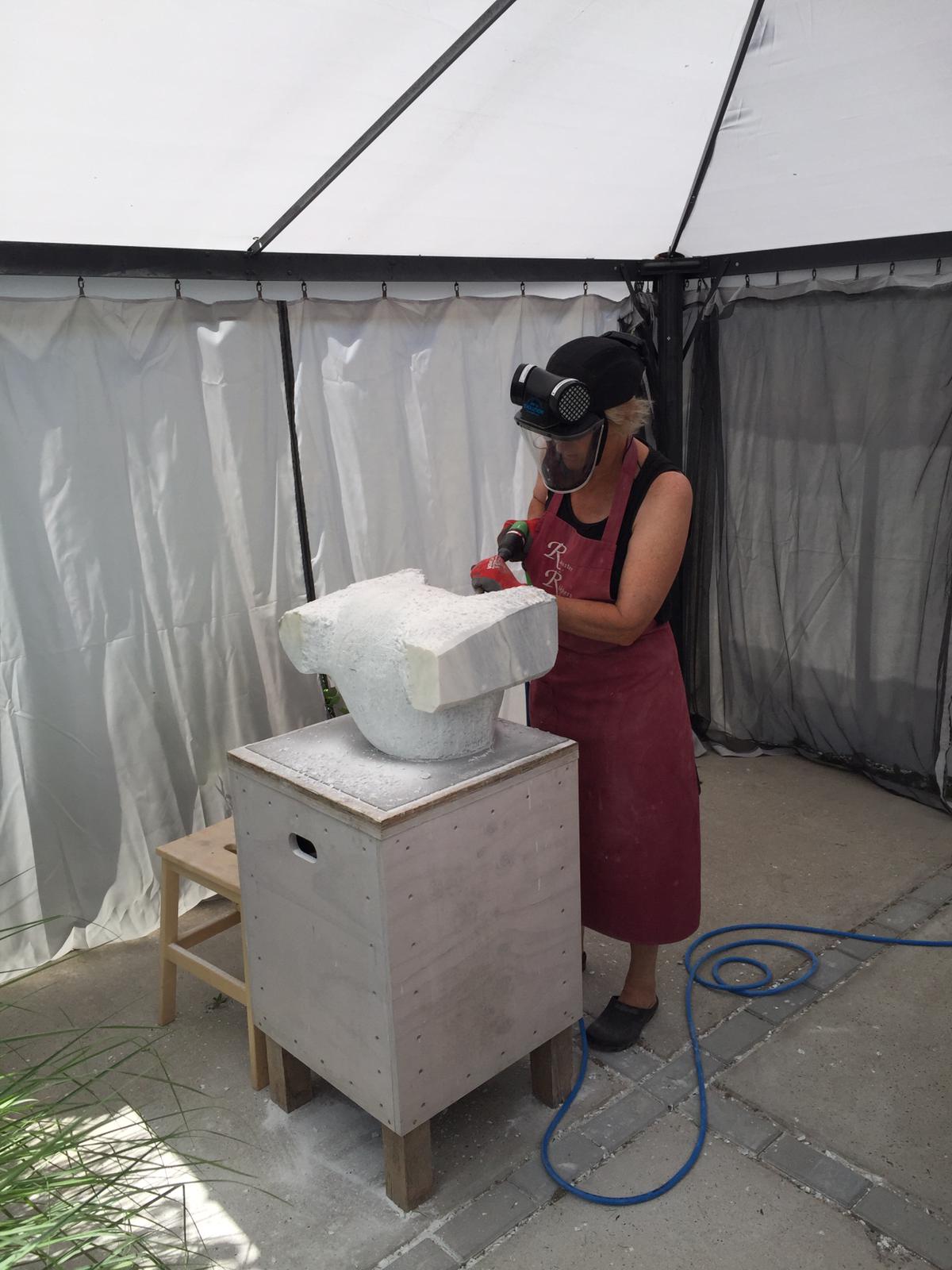 De beeldhouwreis naar Italië ging dit jaar natuurlijk niet door, dus hebben we een tijdelijke werkplaats geflanst in de vorm van een partytent met rondom gordijnen, om het stof wat ik produceer iets te beteugelen. Zonnepanelen schijnen er namelijk niet beter op te worden als ze bedekt worden met een laagje wit marmer.