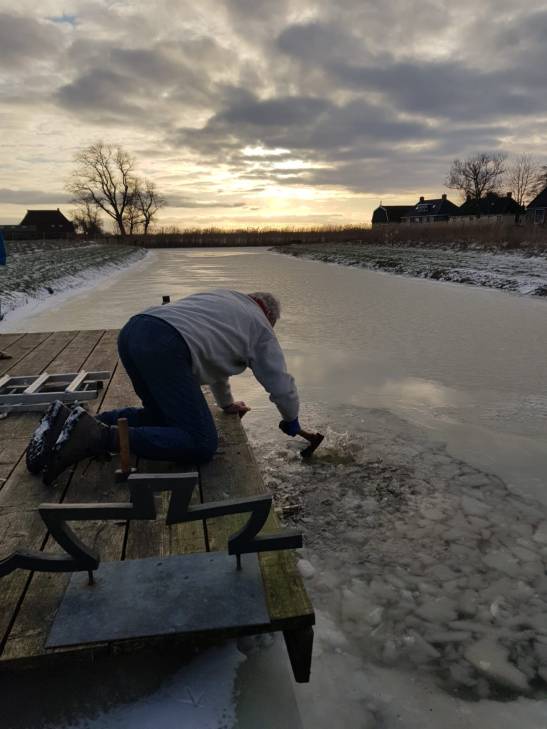Maar ja, als er geschaatst kan worden is zwemmen moeilijk. Maar ik onderschatte de Rienster zwemdames. Harmke kwam vragen of er misschien een wak geslagen mocht worden in onze sloot. En zo geschiedde. De eerste dag was dat nog wel te doen met een vuistje en een beitel. Tot mijn verbazing lieten Alien en Rigtje zich een voor een in badpak in het wak zakken, terwijl ik dik ingepakt op de steiger stond te verkleumen en ze bezorgd aanzette er toch maar weer snel uit te komen.