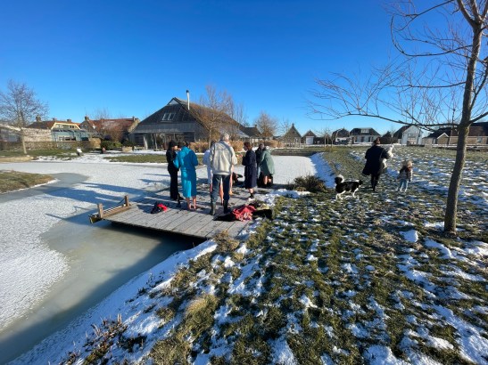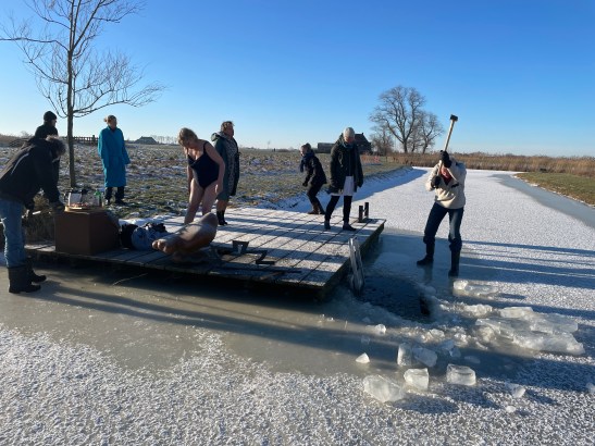 Dag drie was het ijs 10 cm dik! Willem en Jan stortten zich als stoere mannen met zwaar gereedschap op het ijs, terwijl er zes vrouwen in badjas op de steiger stonden te springen om een beetje warm te blijven. Onder luid geroep dat het zo ‘HEERLIJK’ was ging de een na de ander tussen de ijsschotsen te water. Ik stond klaar met warme chocolademelk met Beerenburger en suikerbrood. Ik heb altijd gehoopt om nog eens voor koek en zopie te kunnen zorgen, maar dat het voor een zwemgezelschap zou zijn had ik niet kunnen dromen.