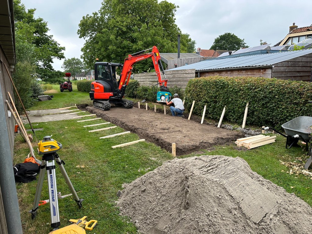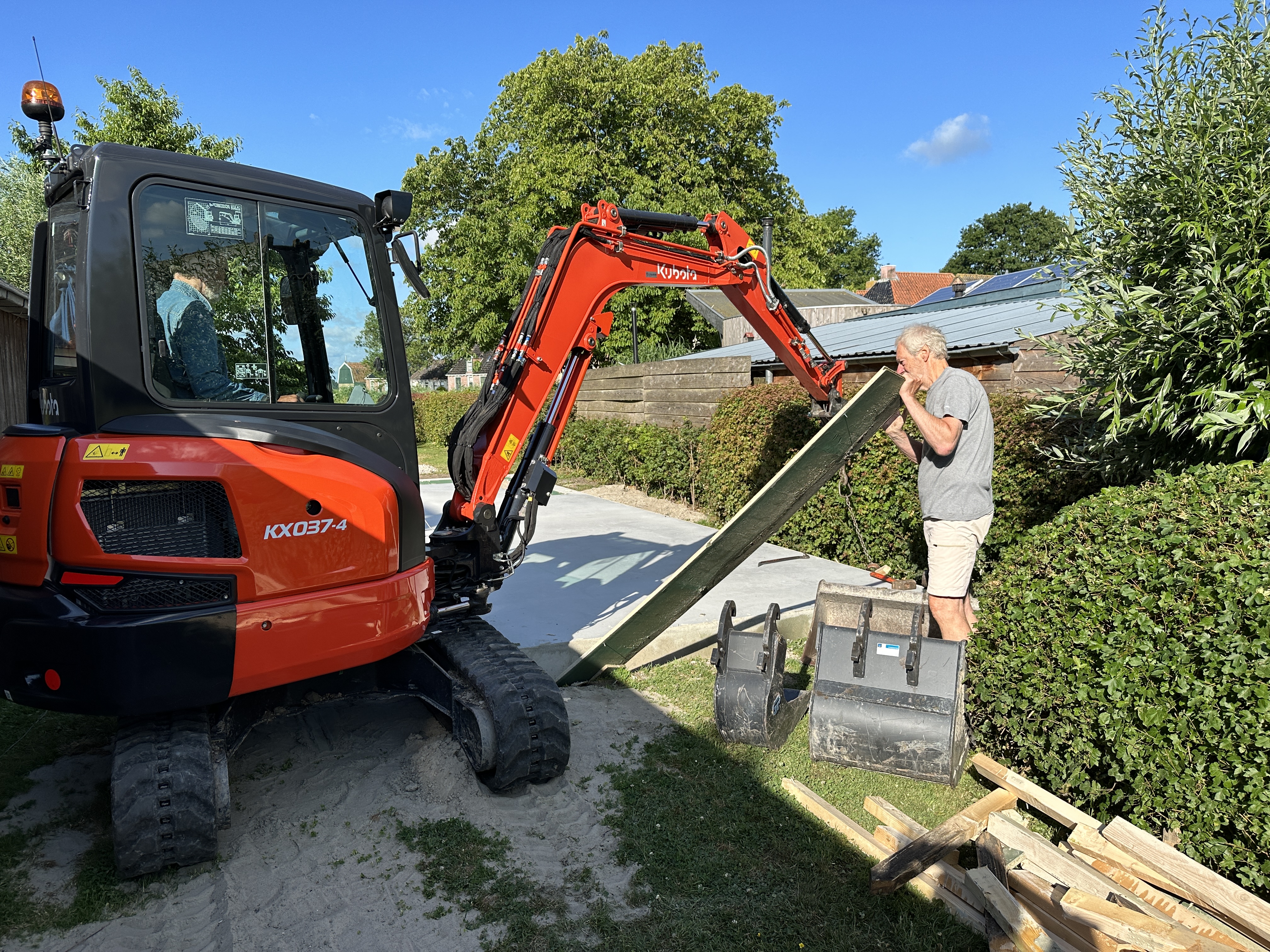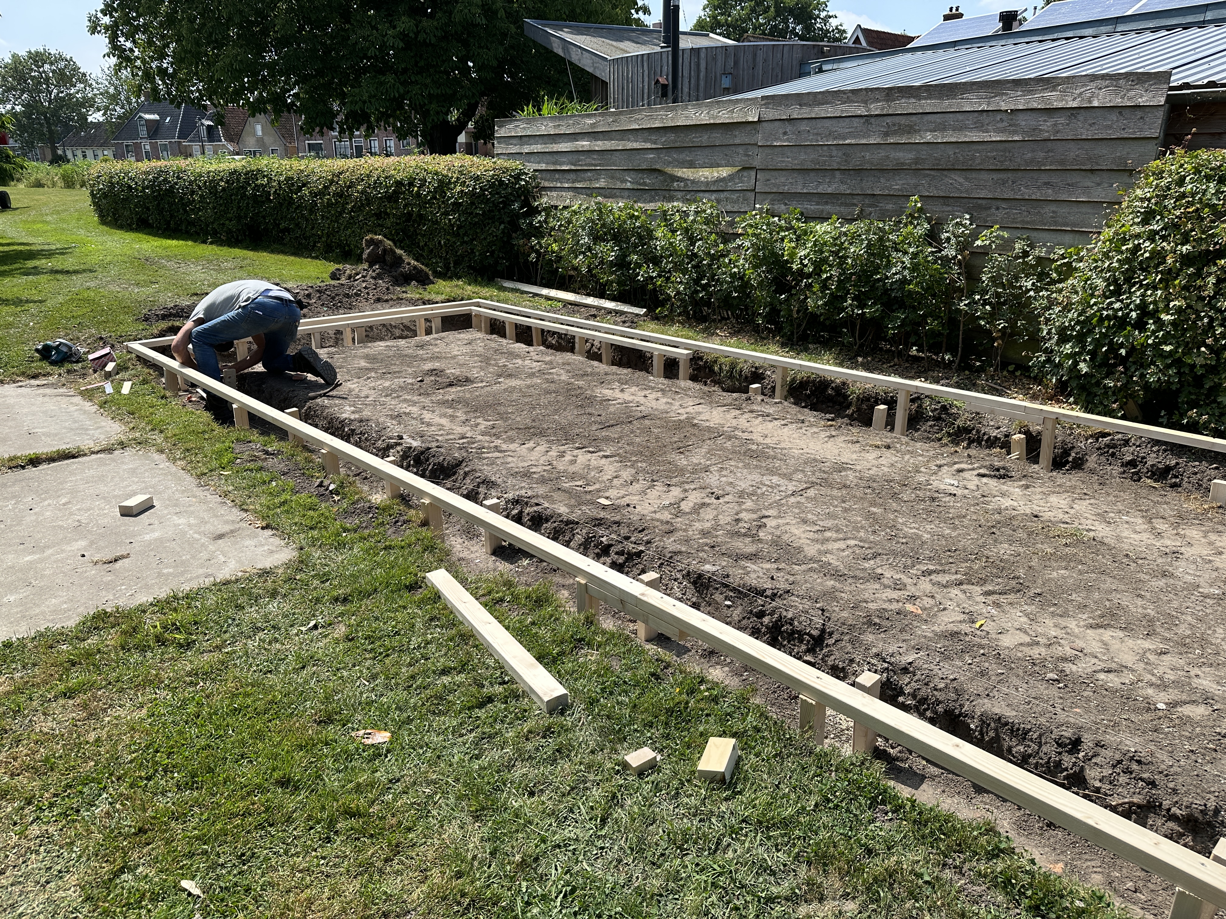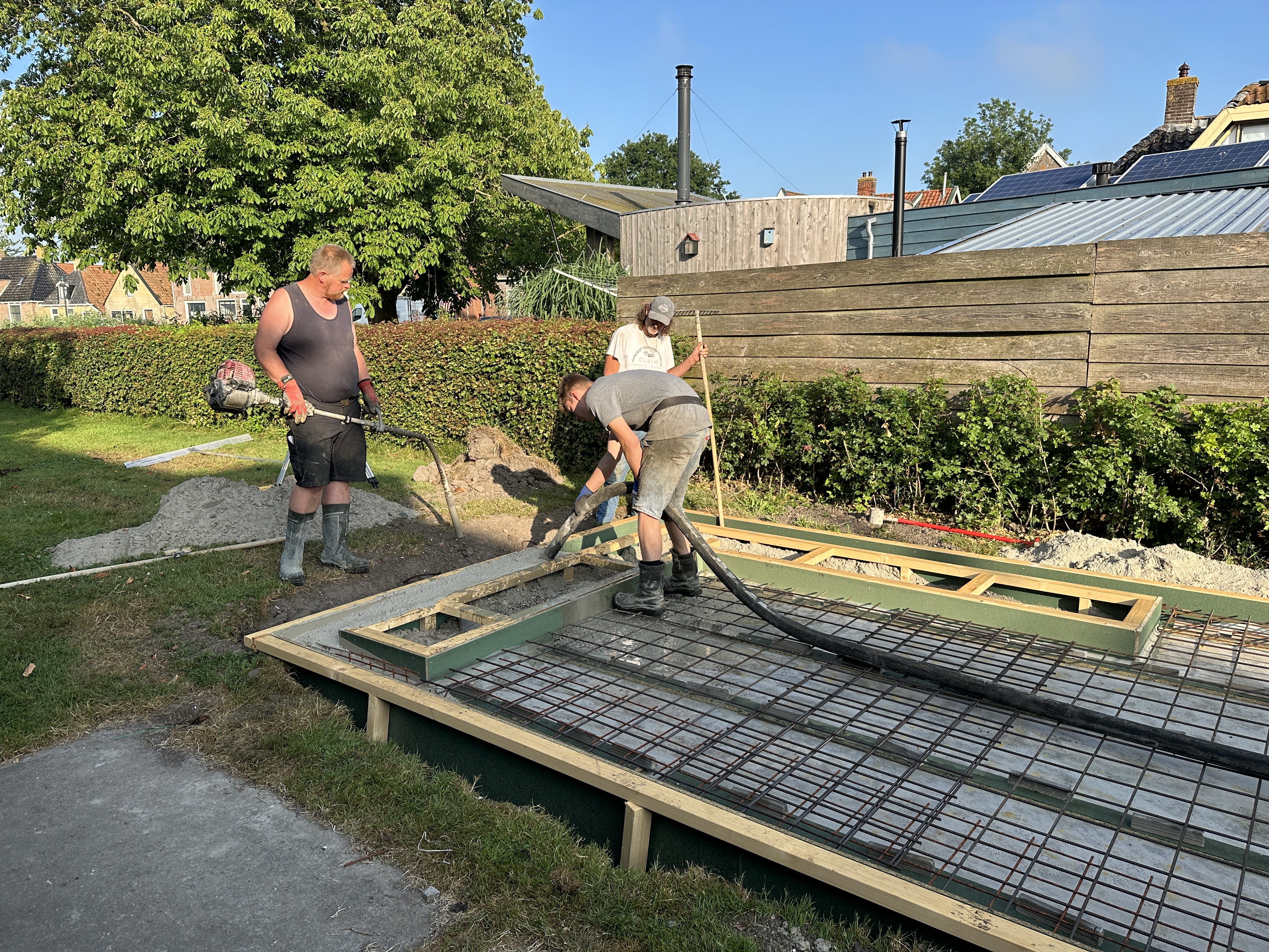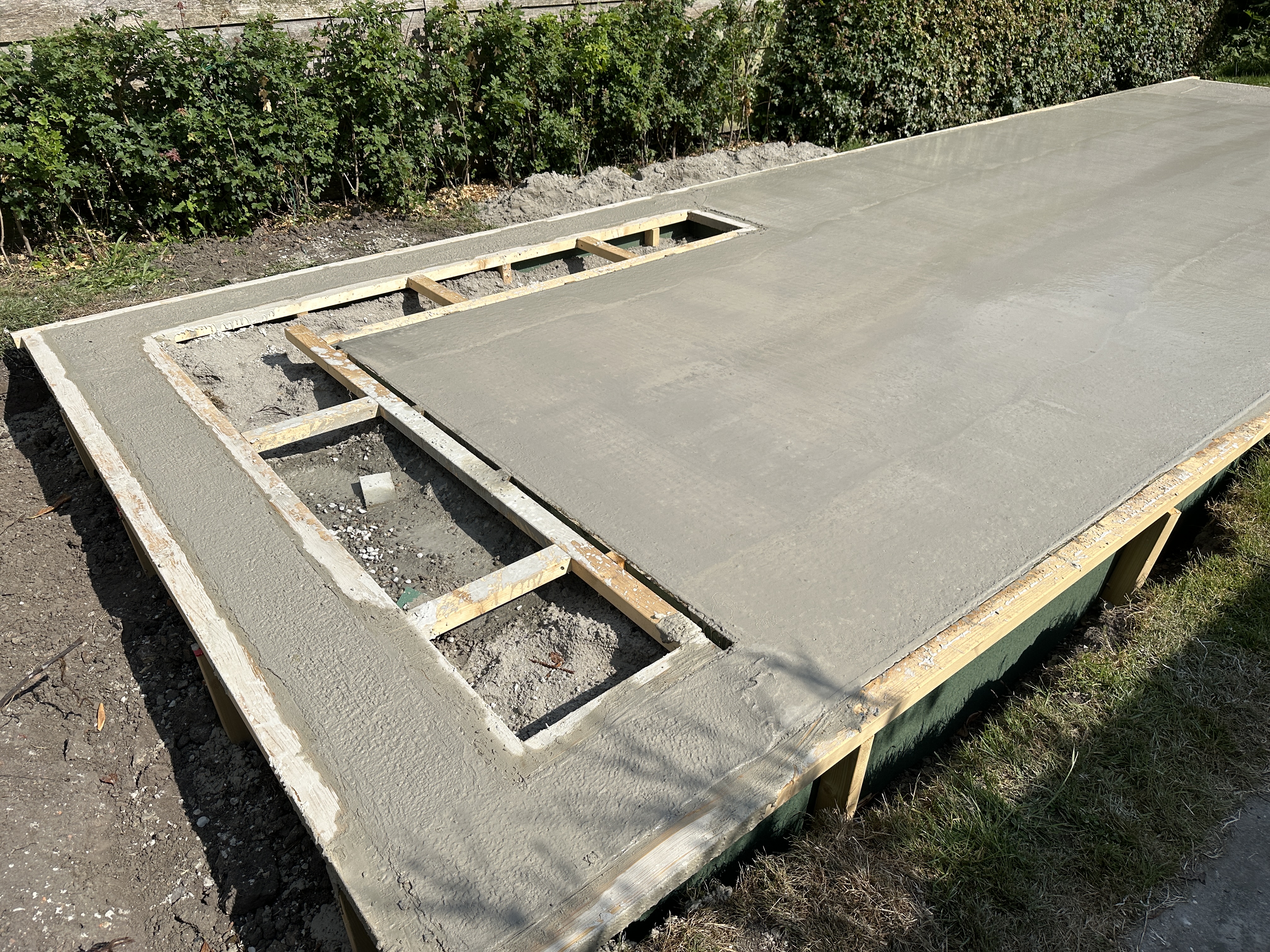 In al onze wijsheid hebben we gelukkig besloten niet te zwichten voor het idee om ook de betonnen fundering zelf te doen. Sterke mannen met dikke machines legden een perfect vloertje aan waarop we de schuur konden bouwen.