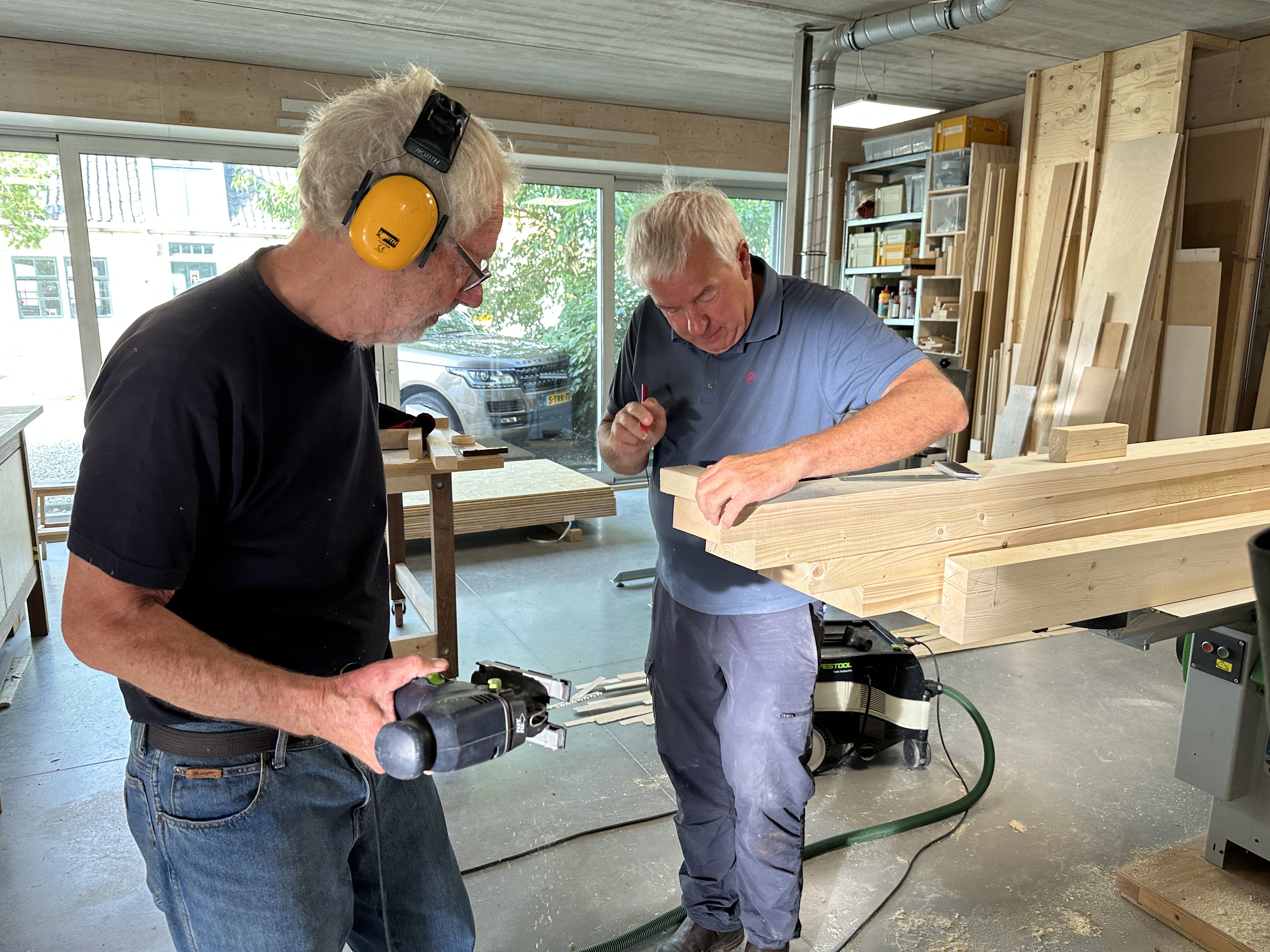 Verschillende expertises moesten toch ingehuurd worden, zoals Jappie, die speciale scharnieren moest maken en Arnold die zich stortte op de deur- en raamkozijnen. Jan en ik hielden ons bezig met de bekleding en de detaillering. We ontwikkelden een goede samenwerking en de werkplaats stond weer bol van activiteit en rook lekker naar hout. De komende tijd stort Jan zich op de praktische inrichting van de schuur. Dat is hem wel toevertrouwd!