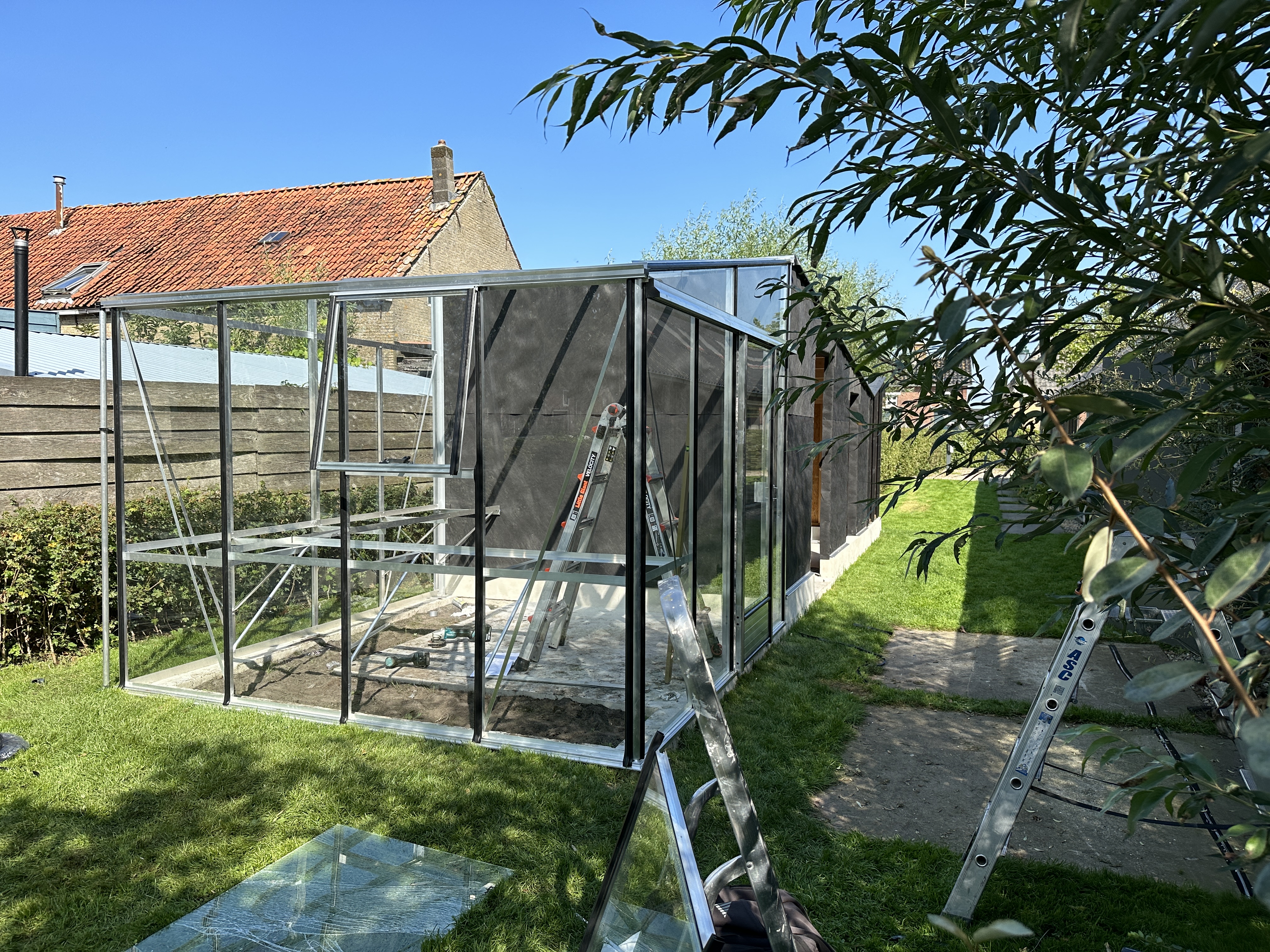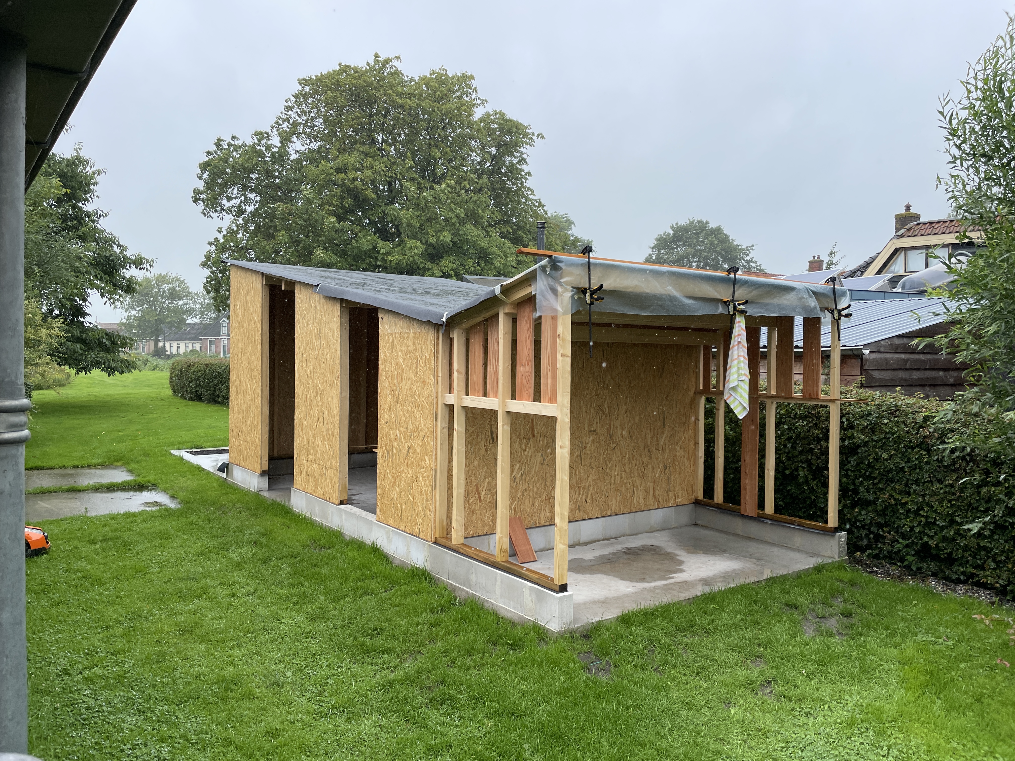Een blog wat tot stilstand is gekomen betekent niet dat er niks meer gebeurt in huize Brinkman/Knegtmans. Stilzitten komt nog steeds niet voor in ons woordenboek. De recentste activiteit is een ‘dependance’ in de tuin. Jan vond dat we nog niet genoeg ruimte hadden (!) dus bedacht hij dat er een schuur en houtopslag moest komen. De houtopslag was terecht, want hout opslaan in huis leidde vorig jaar tot een invasie van houtworm die zich tegoed deed aan onze balken. De schuur komt makkelijk vol met tuinspullen en aan de westkant zit als bonus een echte glazen kas. Eentje die niet weg kan vliegen bij de eerste de beste storm.